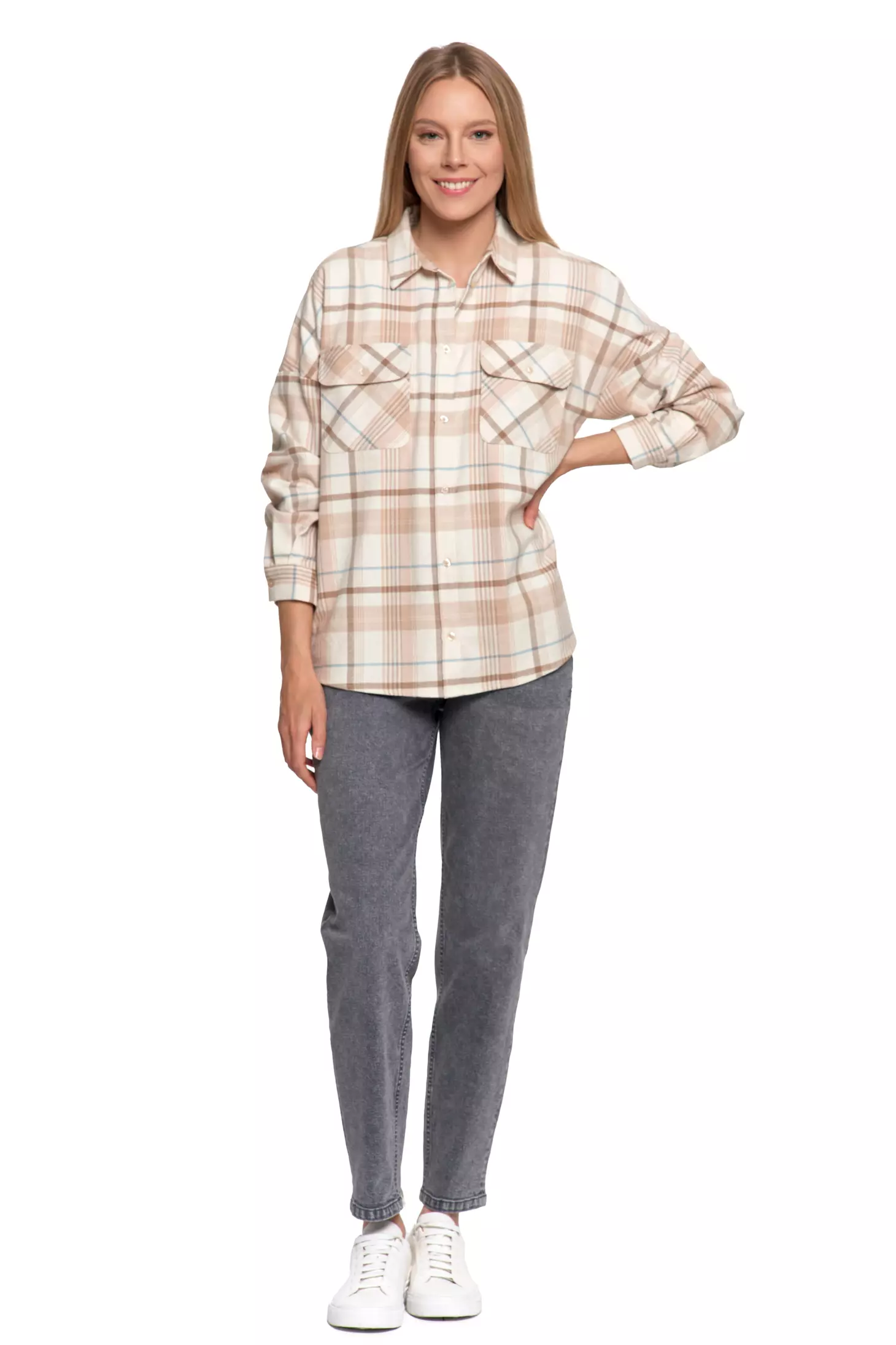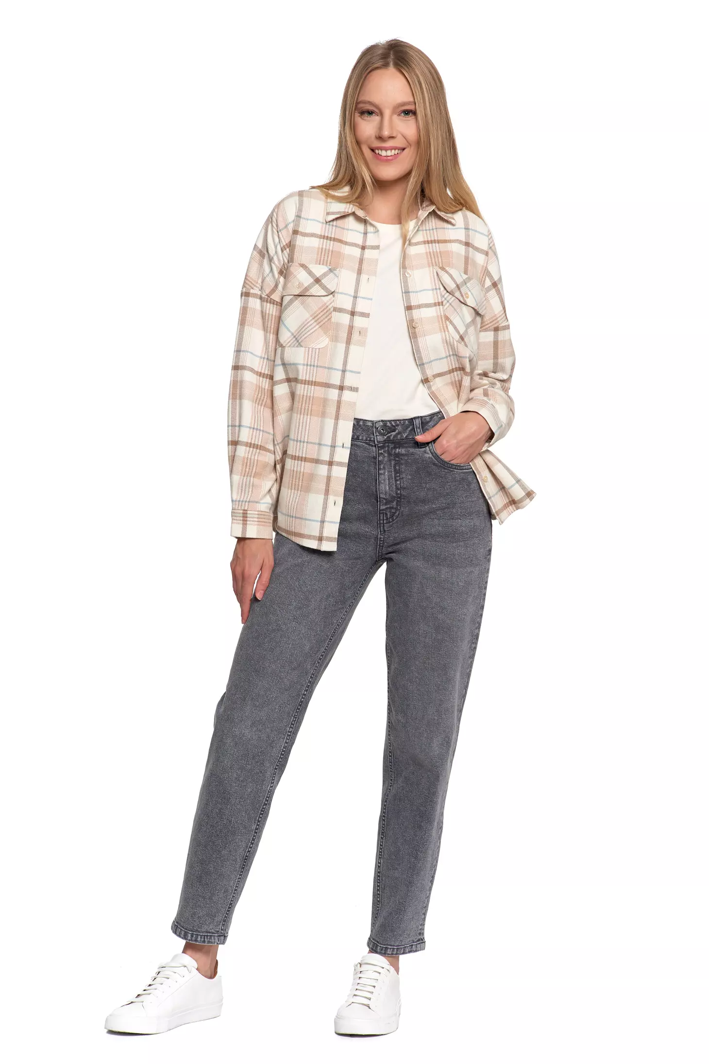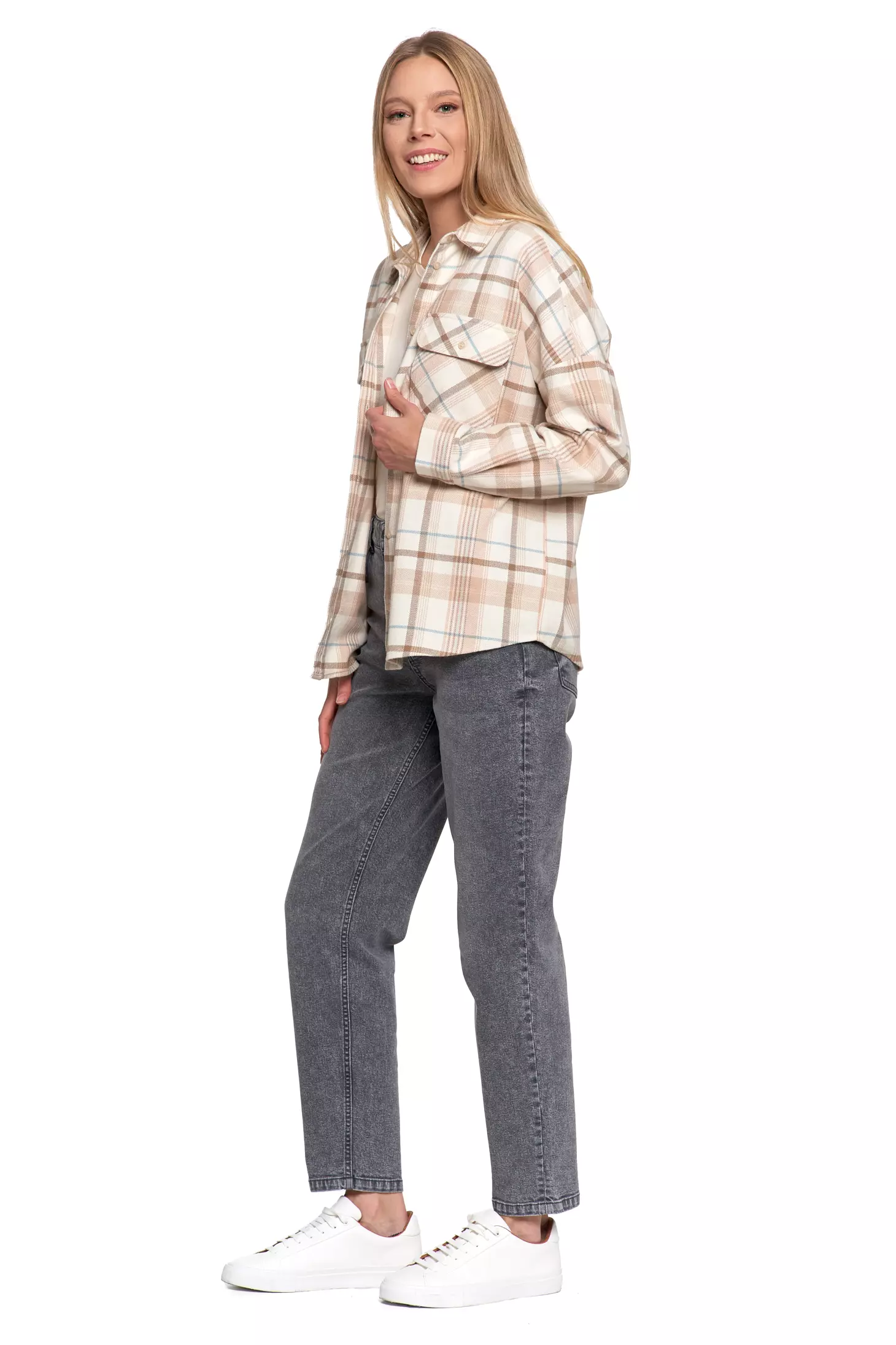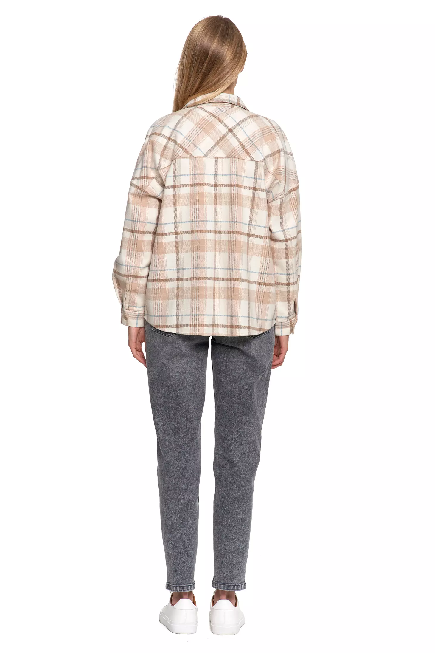 - Praktyczne detale: Zapięcie na guziki, klasyczny kołnierzyk i dwie kieszenie na piersiach podkreślają jej casualowy charakter.