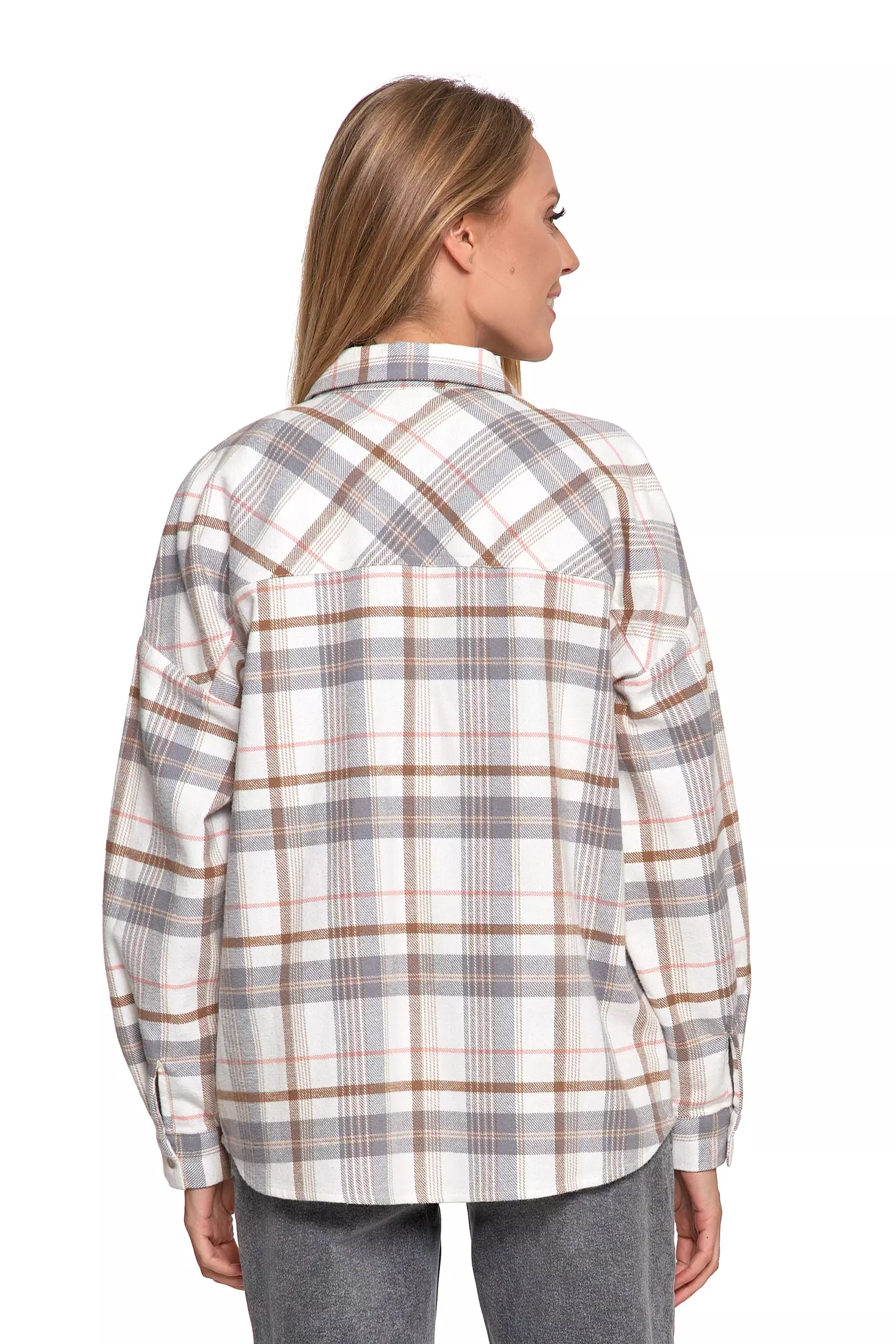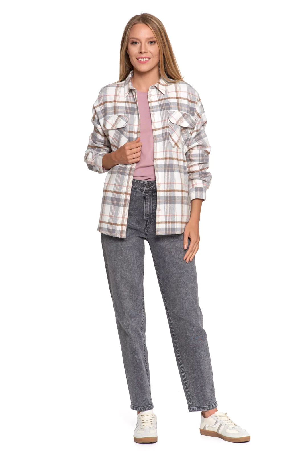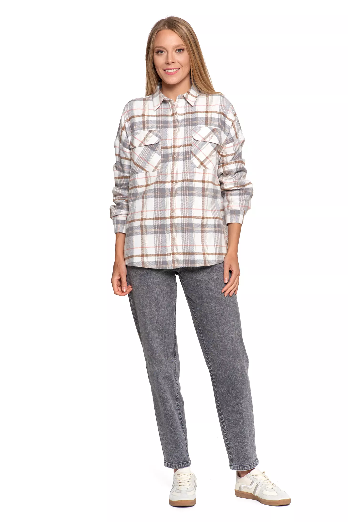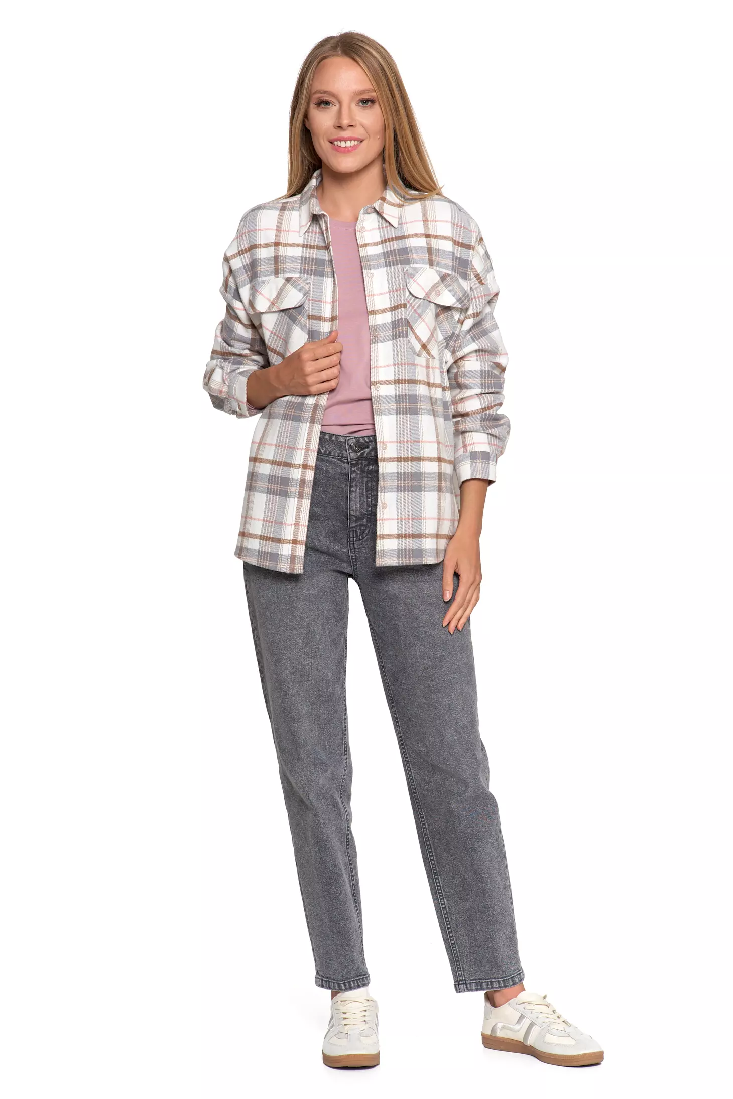 • Praktyczne detale: Zapięcie na guziki, klasyczny kołnierzyk i dwie kieszenie na piersiach podkreślają jej casualowy charakter.