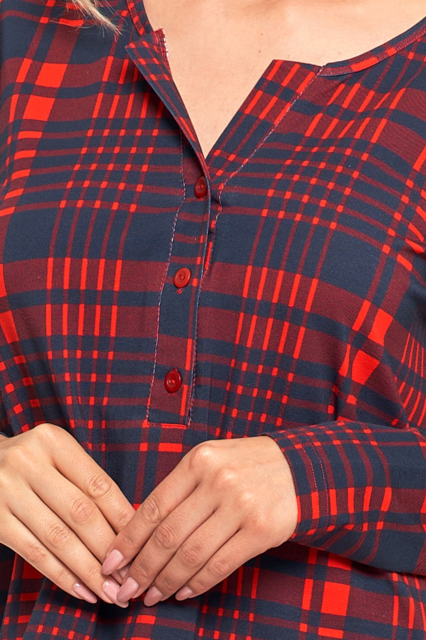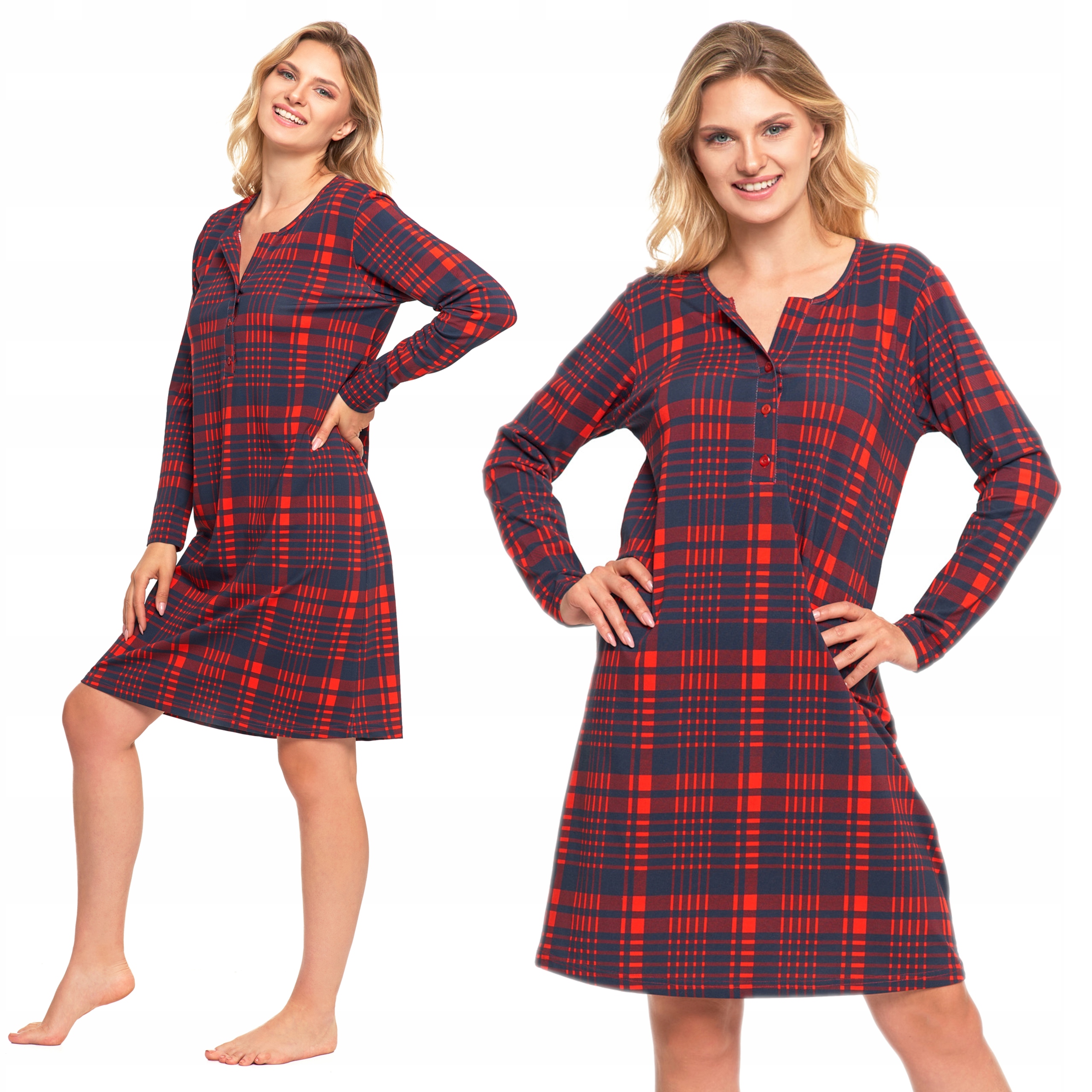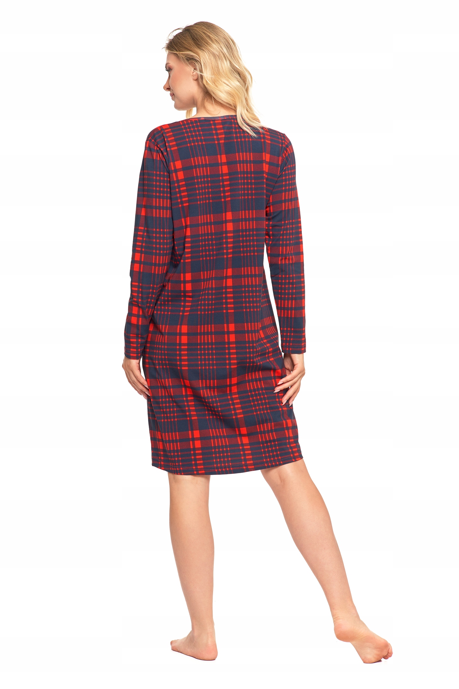 Koszula nocna charakteryzuje się luźnym fasonem, który nie krępuje ruchów, zapewniając swobodę i wygodę przez całą noc. Długi rękaw oraz elegancki dekolt dodają jej klasycznego uroku, a całość dopełnia wzór w kratę, nadający jej wyjątkowego, modnego charakteru.