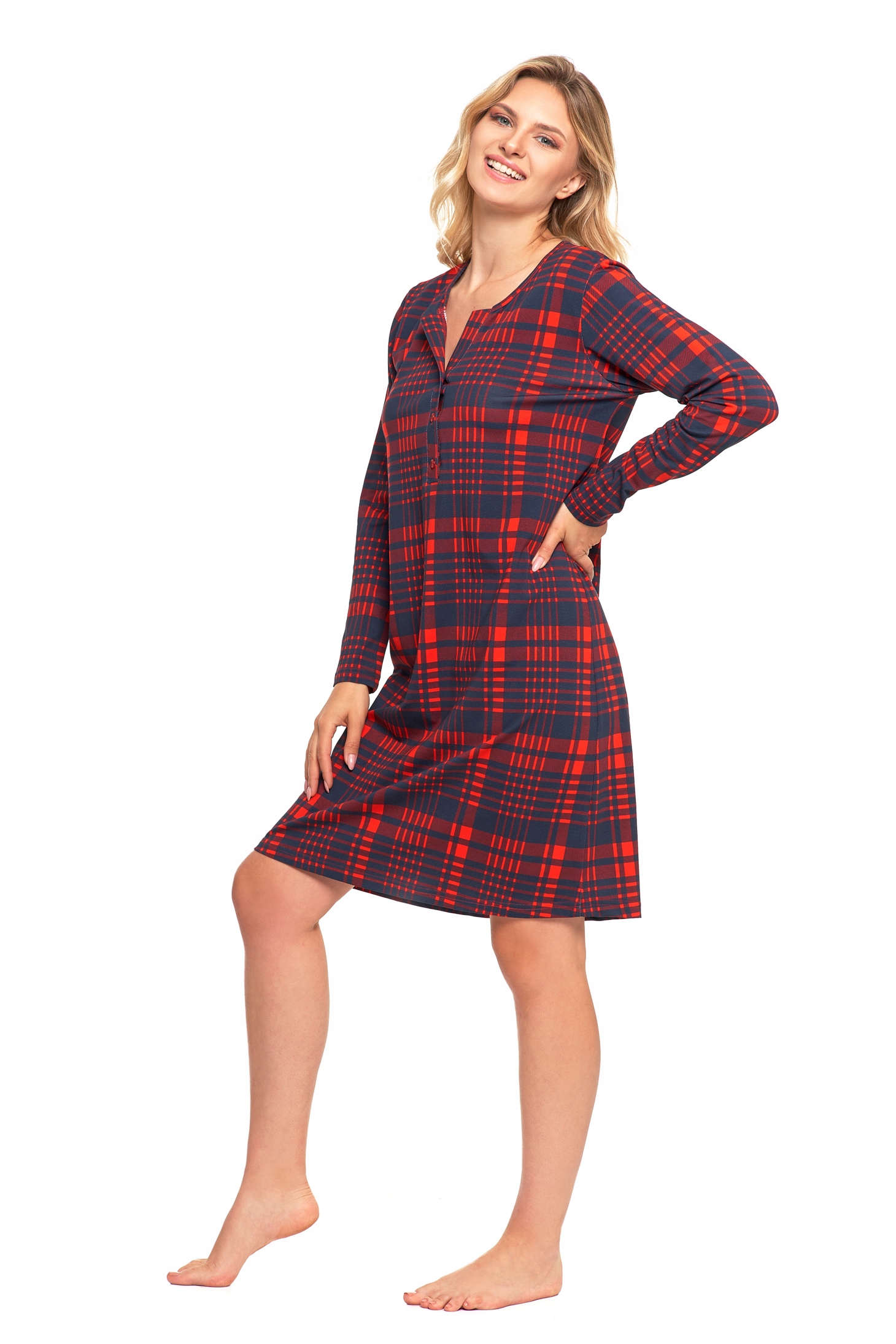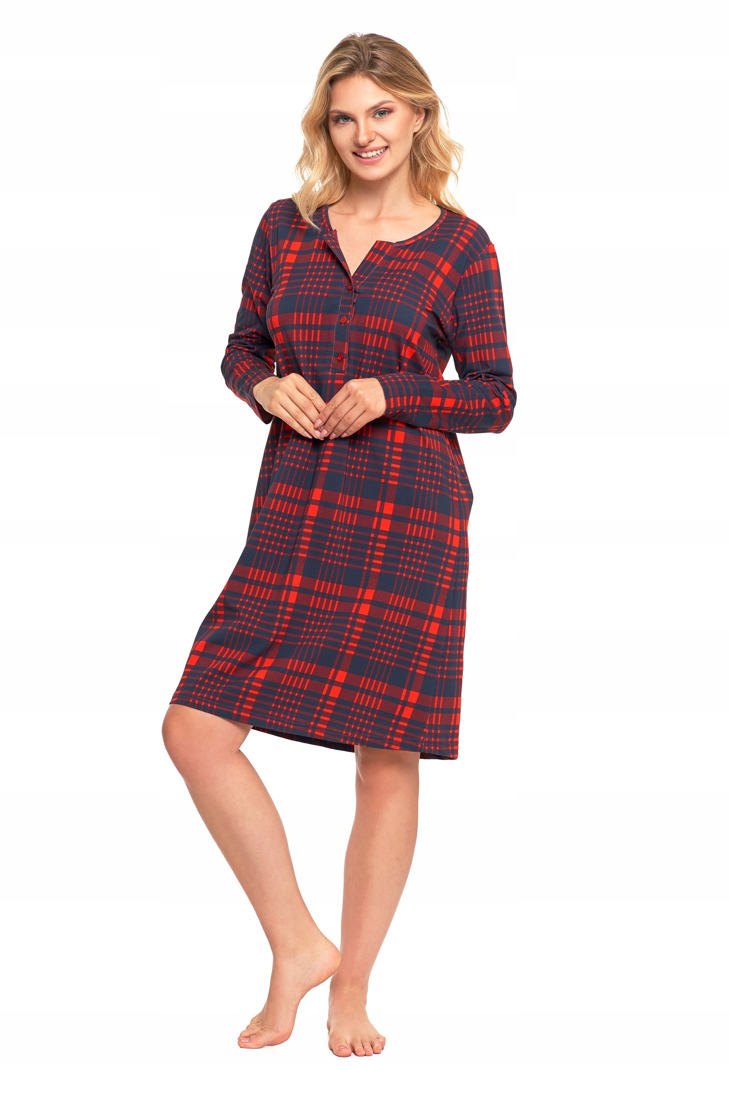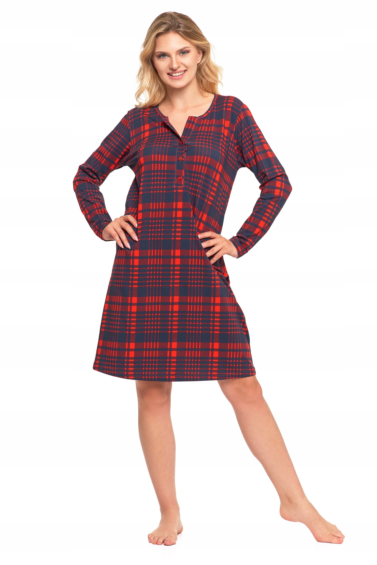 Koszula nocna charakteryzuje się luźnym fasonem, który nie krępuje ruchów, zapewniając swobodę i wygodę przez całą noc. Długi rękaw oraz elegancki dekolt dodają jej klasycznego uroku, a całość dopełnia wzór w kratę, nadający jej wyjątkowego, modnego charakteru.