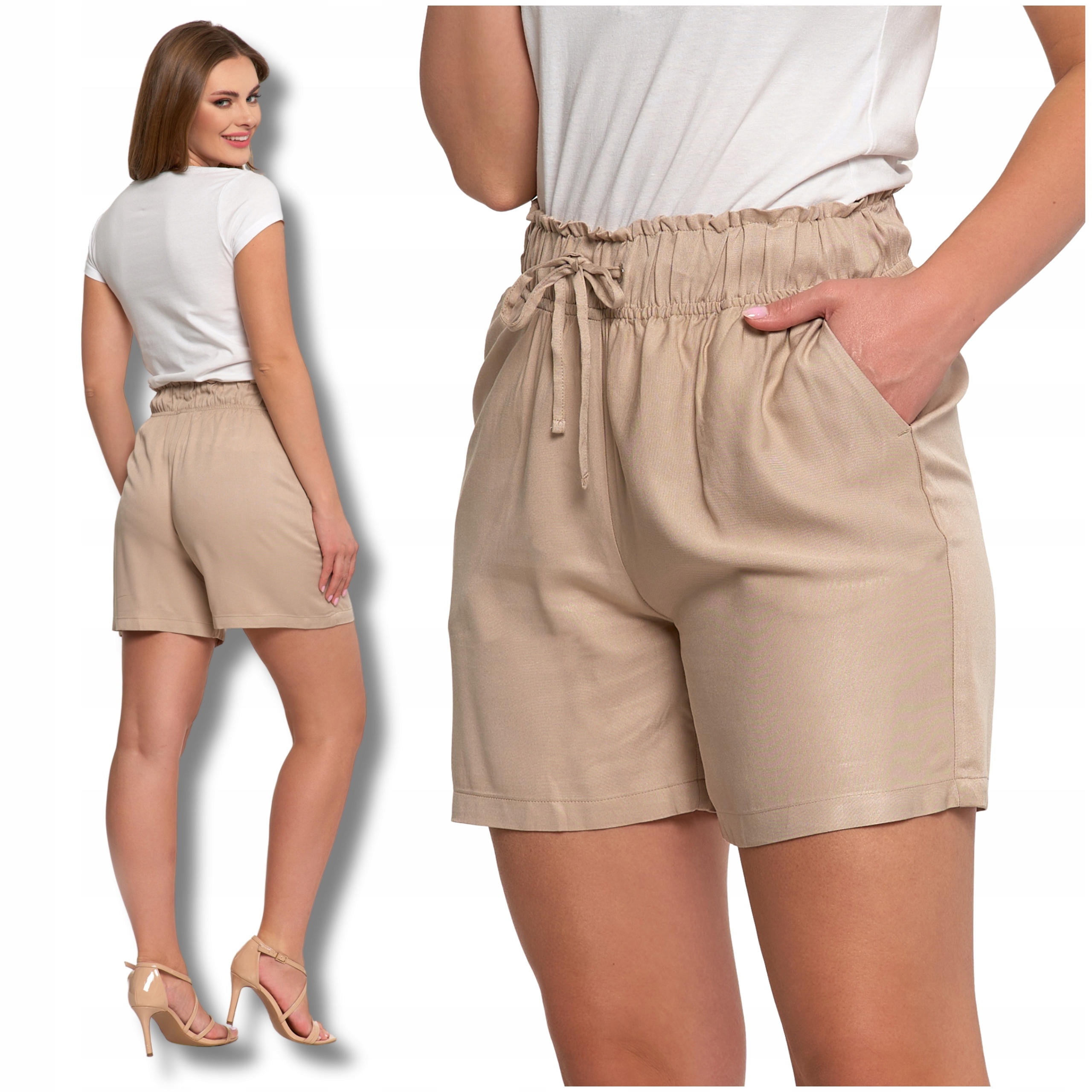 KRÓTKIE SPODENKI Szorty Damskie Beżowe z Wysokim Stanem Wiązane MORAJ