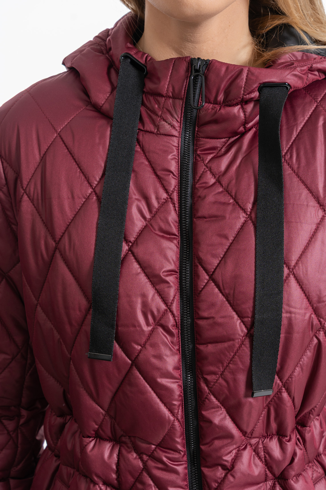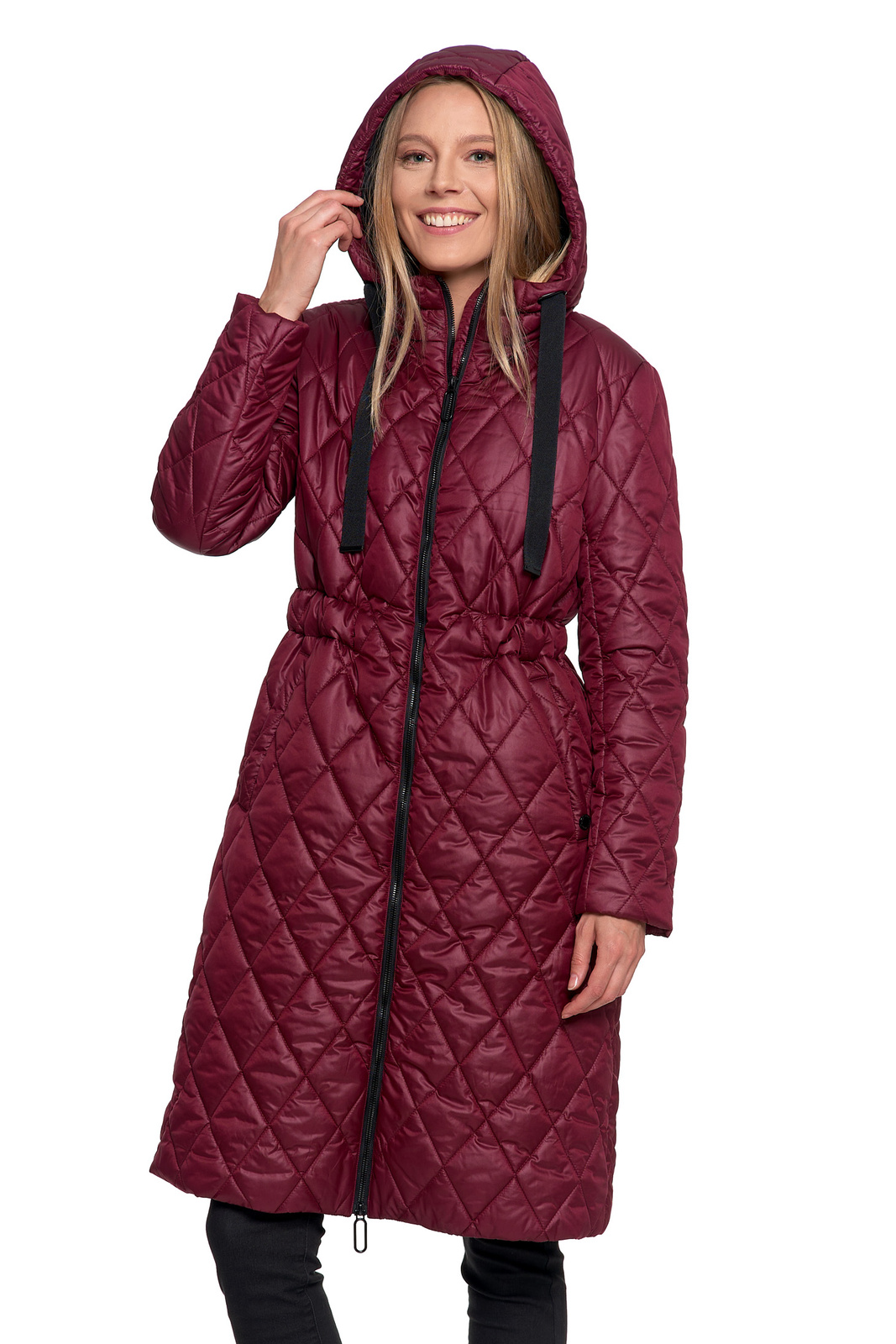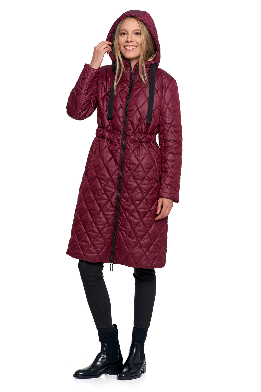 Elegancja i Komfort: Długa Pikowana Kurtka w Romby z Regulacją Talii