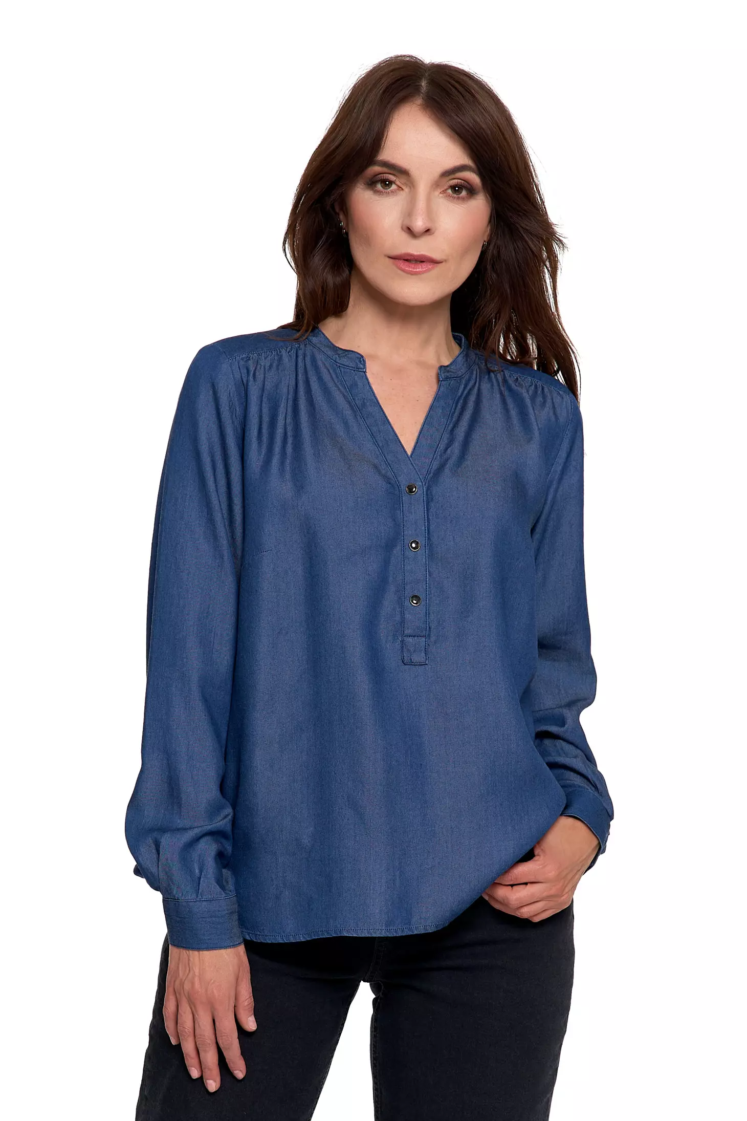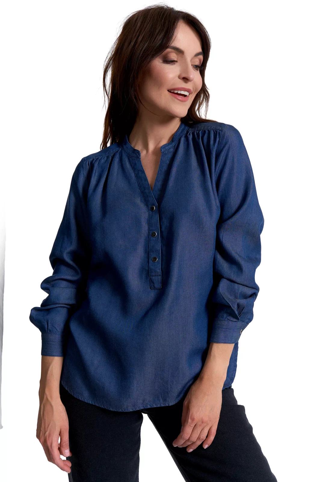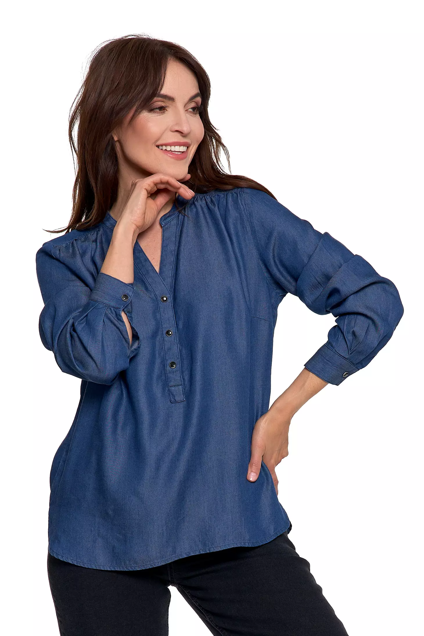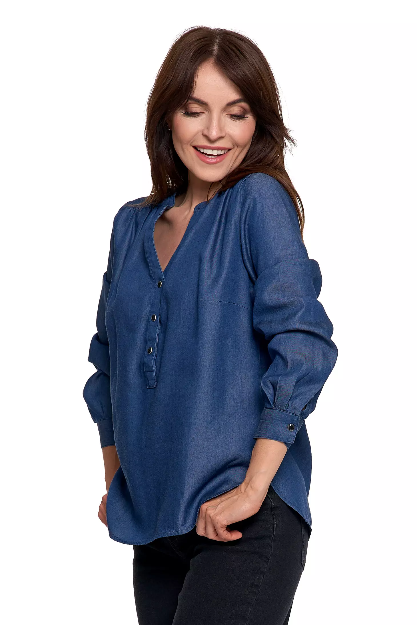 Ta damska bluzka to połączenie lekkości, przewiewności i wyjątkowej wygody. Uszyta w 100% z lyocellu, oferuje komfort naturalnego, miękkiego materiału, który subtelnie układa się na sylwetce przez cały dzień.