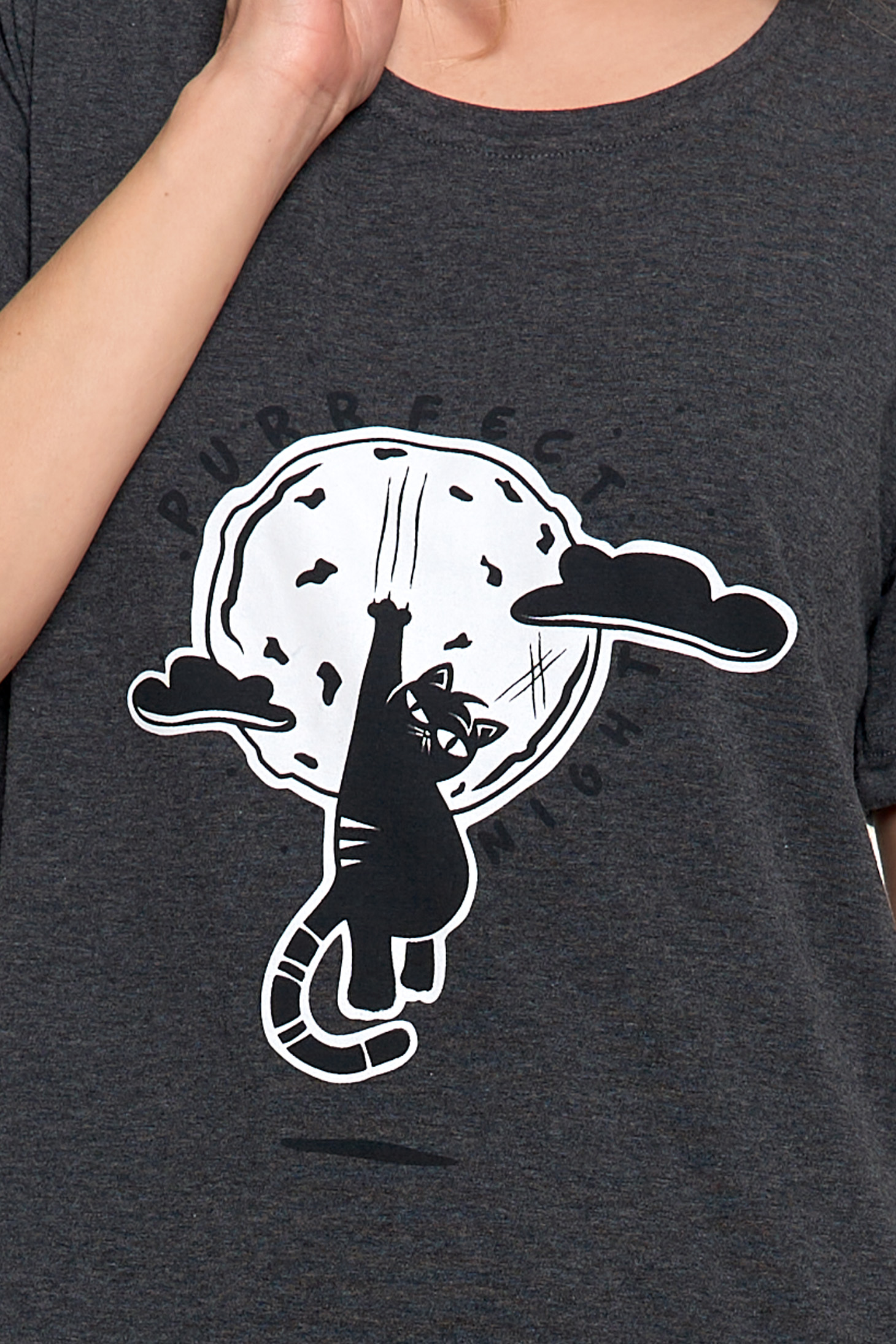 • Design: Koszula w kolorze grafitowego melanżu ozdobiona jest uroczym nadrukiem kota na tle księżyca, co nadaje jej magicznego charakteru.