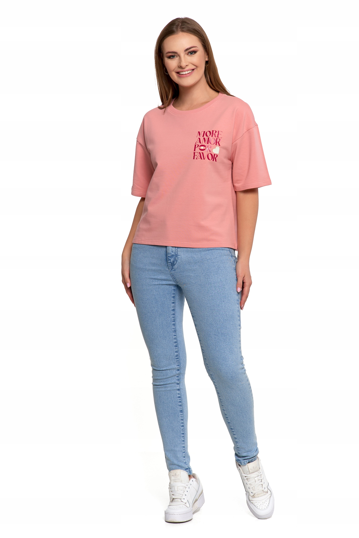- Nadruk "MORE AMOR POR FAVOR" w żywych kolorach przyciąga wzrok.