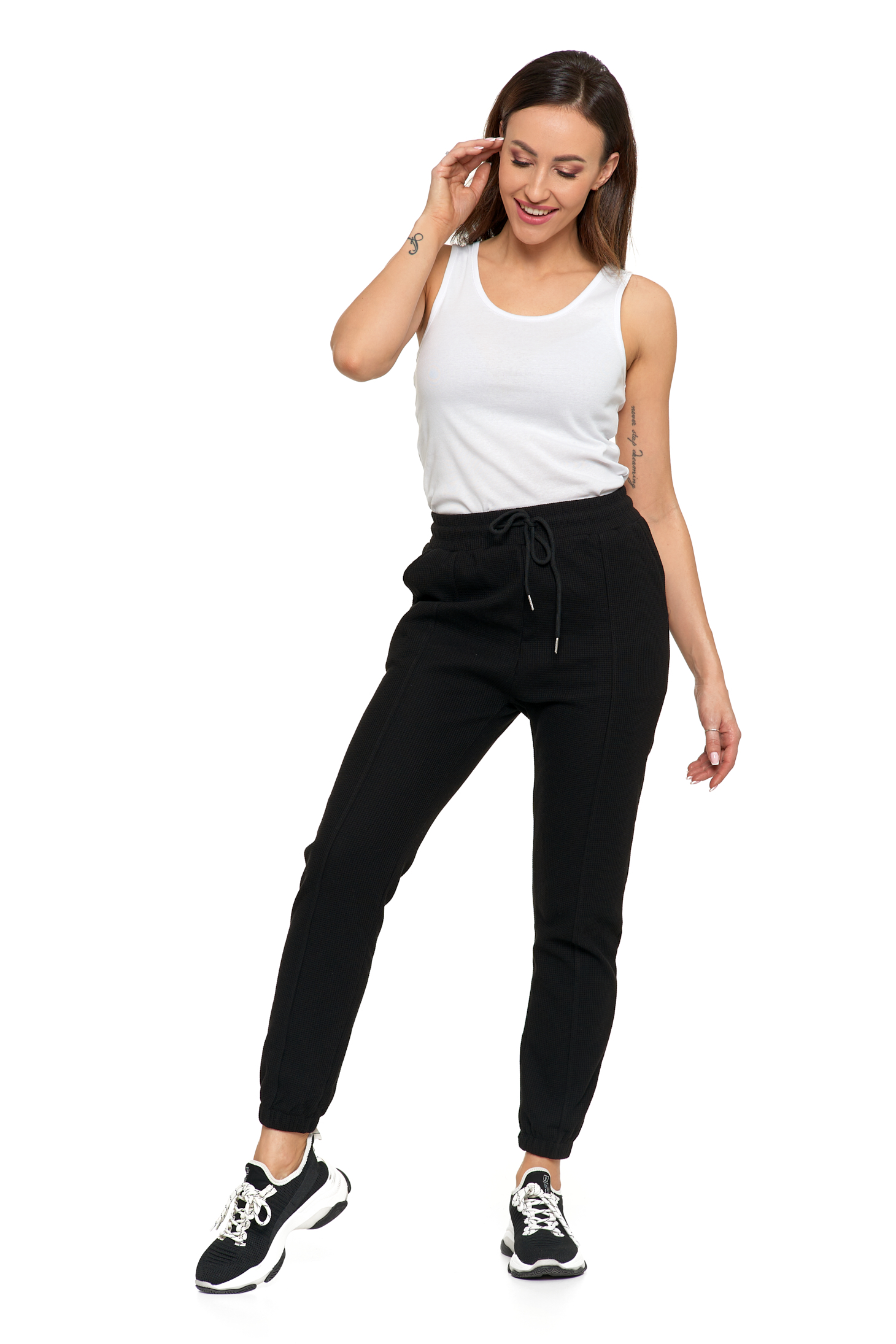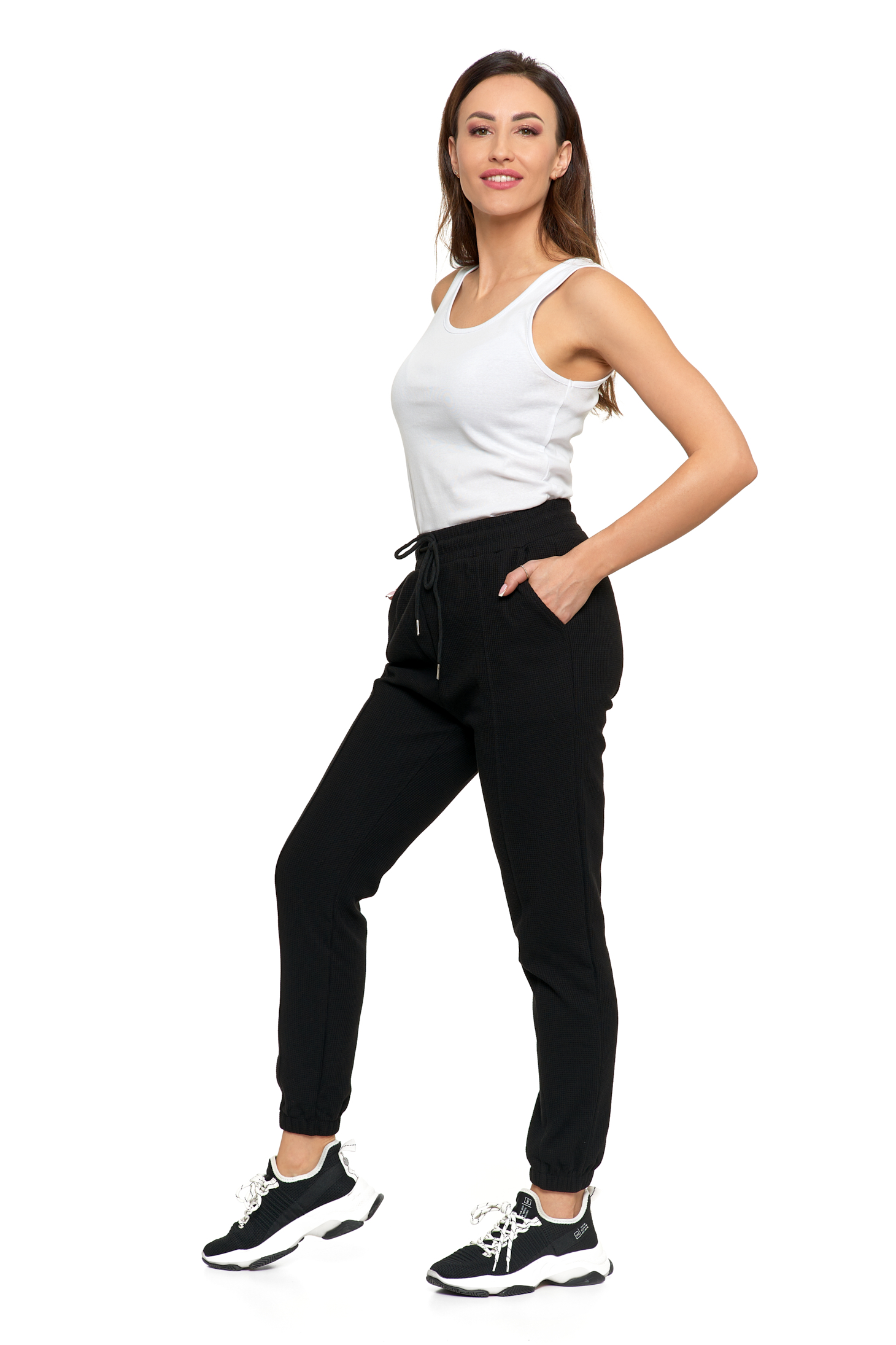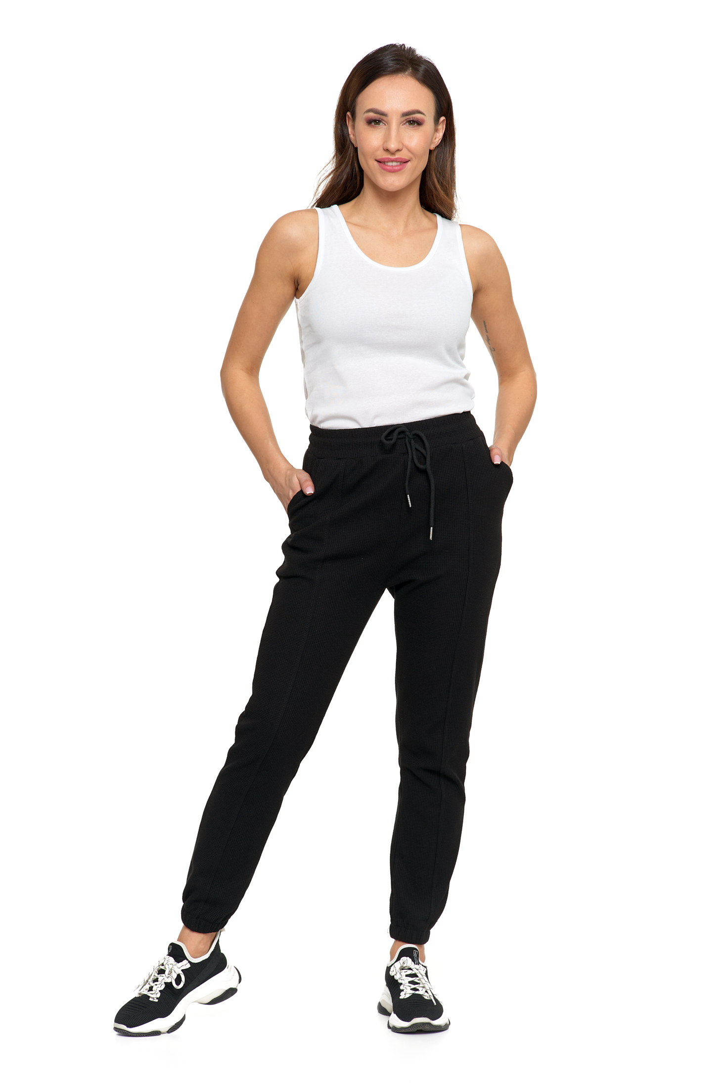 Spodnie damskie dresowe, wykonane z wysokogatunkowych materiałów. Są miękkie i przyjemne w dotyku. W pasie posiadają wygodną, elastyczną gumę z praktycznym wiązaniem na sznurek. Nogawki zakończone są prosto. Z przodu są stylowe, skośne kieszenie.  Model świetnie nada się zarówno do tworzenia codziennych stylizacji, eleganckich, jak i do treningu.