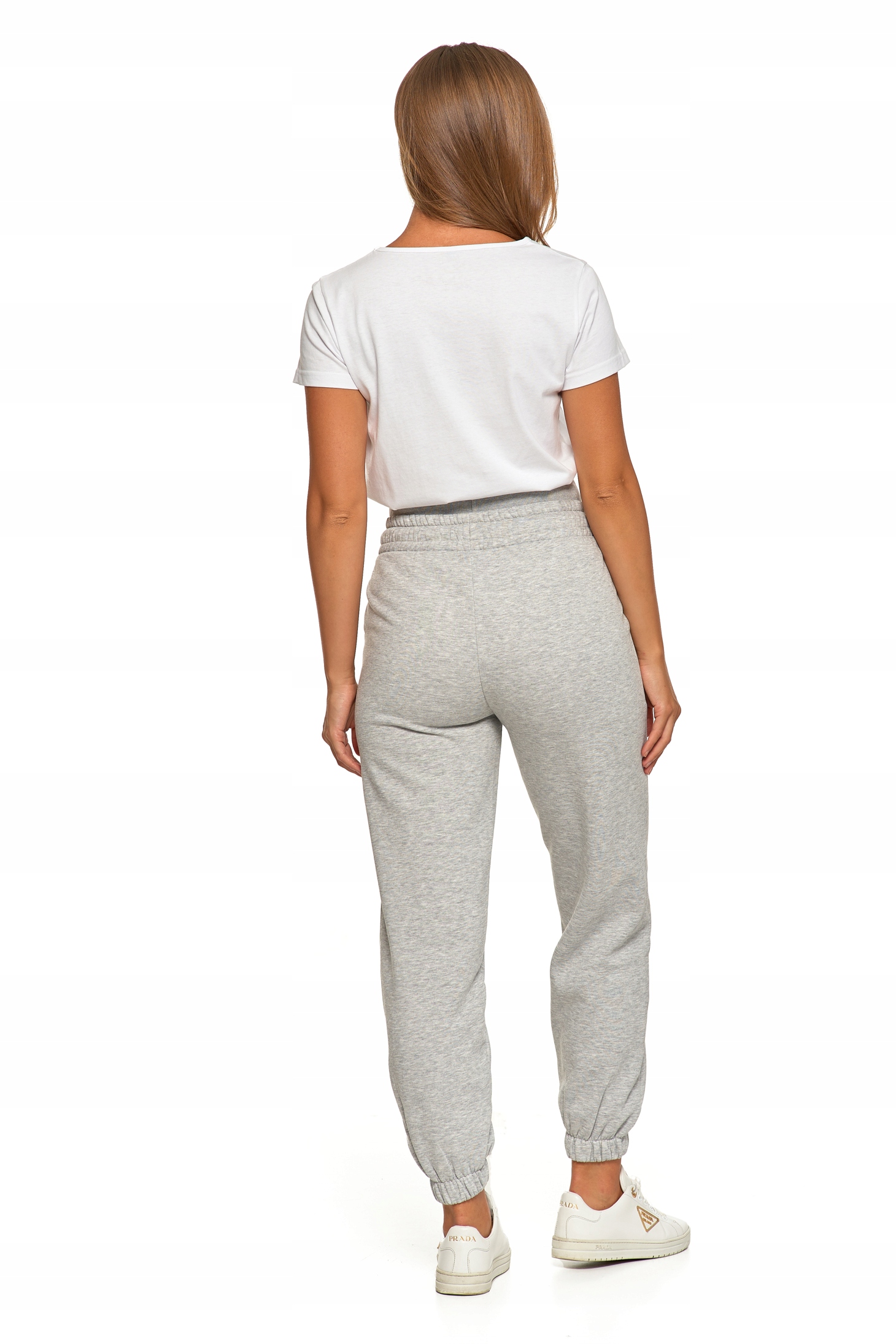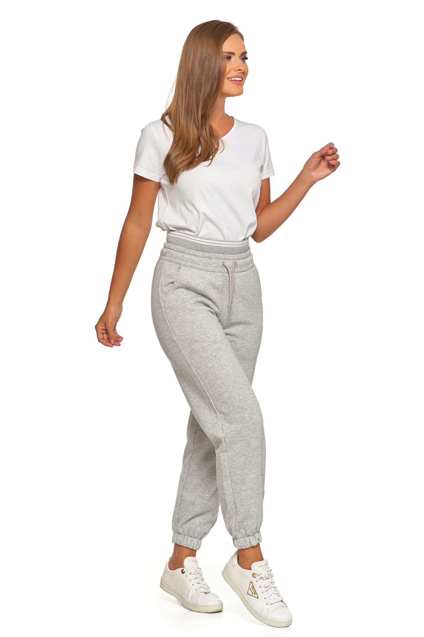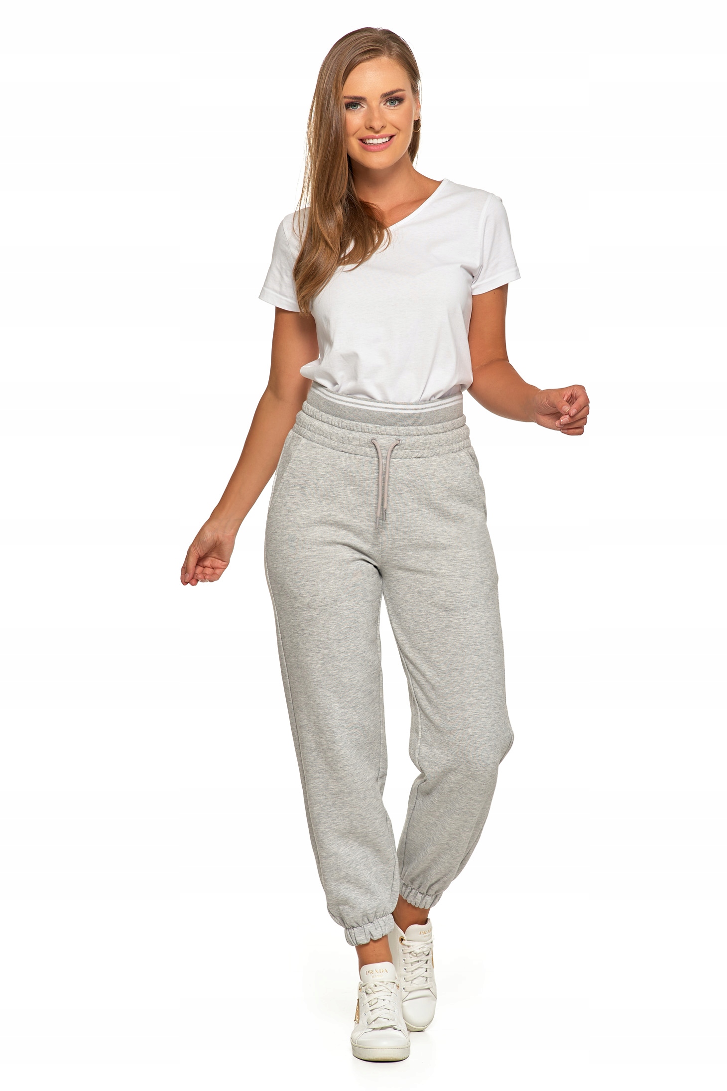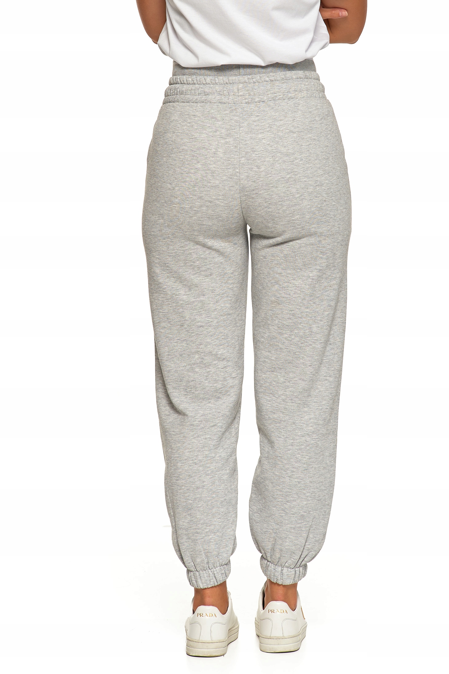 Wykonane z bawełnianej dzianiny z domieszką, zapewniają miękkość, trwałość oraz odpowiednie dopasowanie do sylwetki. Wnętrze spodni wyściełane jest ciepłym materiałem, co sprawia, że są one doskonałe na zimowe spacery lub leniwe dni w domu. Model ten posiada szeroką, elastyczną gumkę w pasie, która zapewnia wygodę noszenia i stabilność. Dodatkowo, w pasie znajduje się regulowane wiązanie, pozwalające na indywidualne dopasowanie. Nogawki zakończone są elastycznym ściągaczem, który dodaje sportowego charakteru i sprawia, że spodnie idealnie przylegają do kostek, chroniąc przed chłodem.