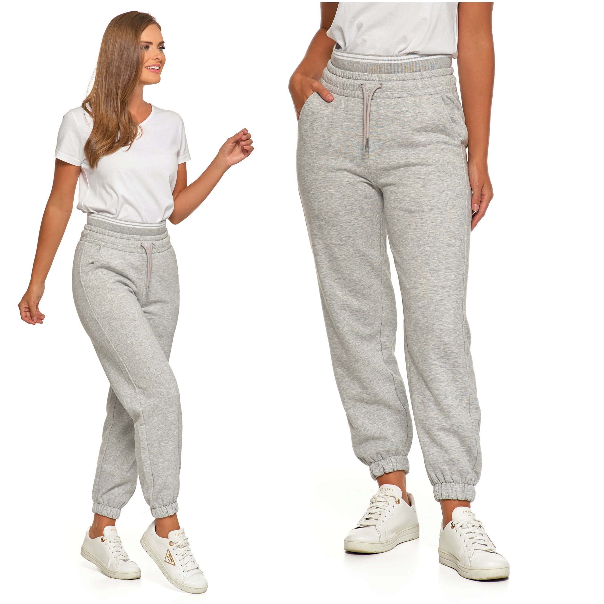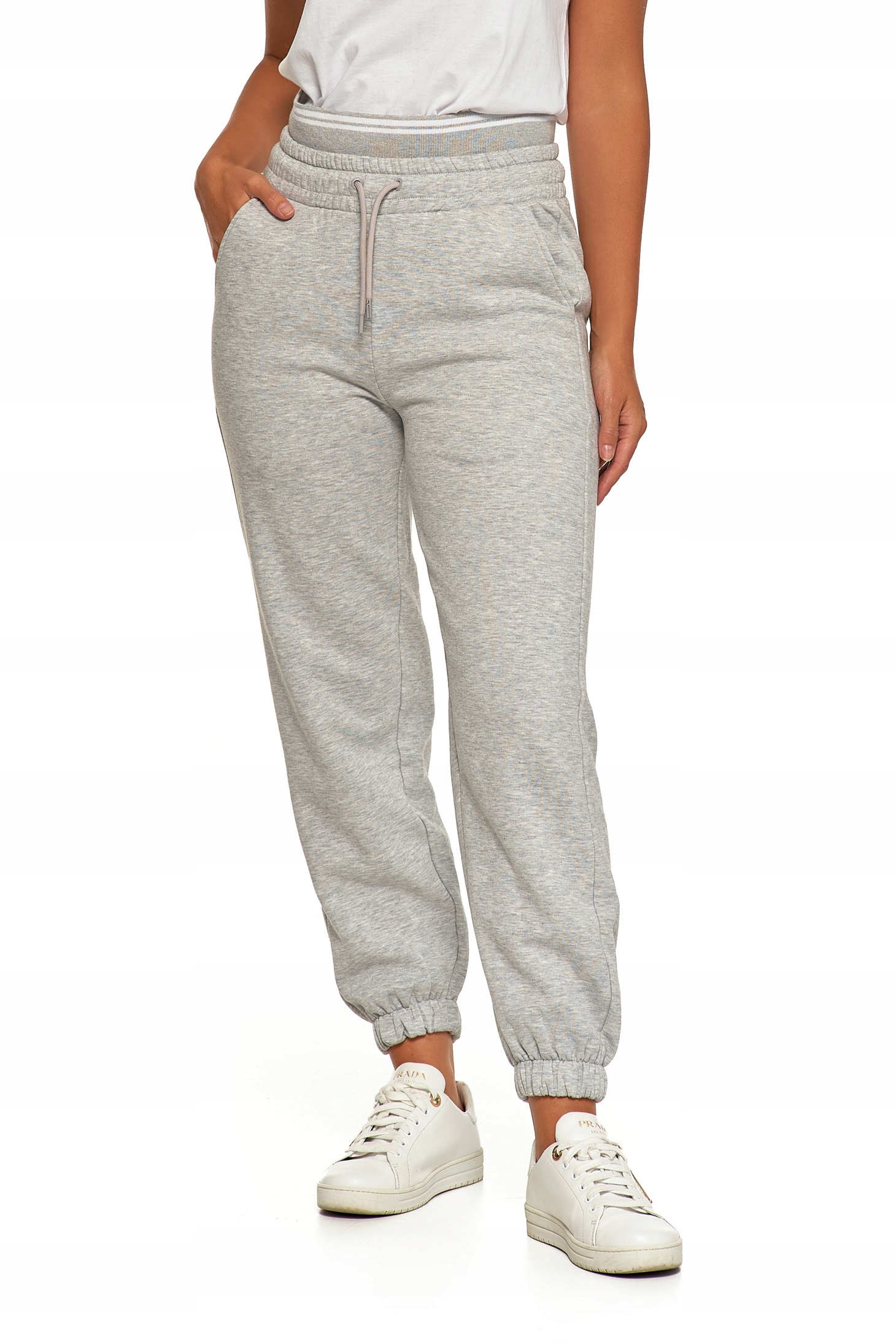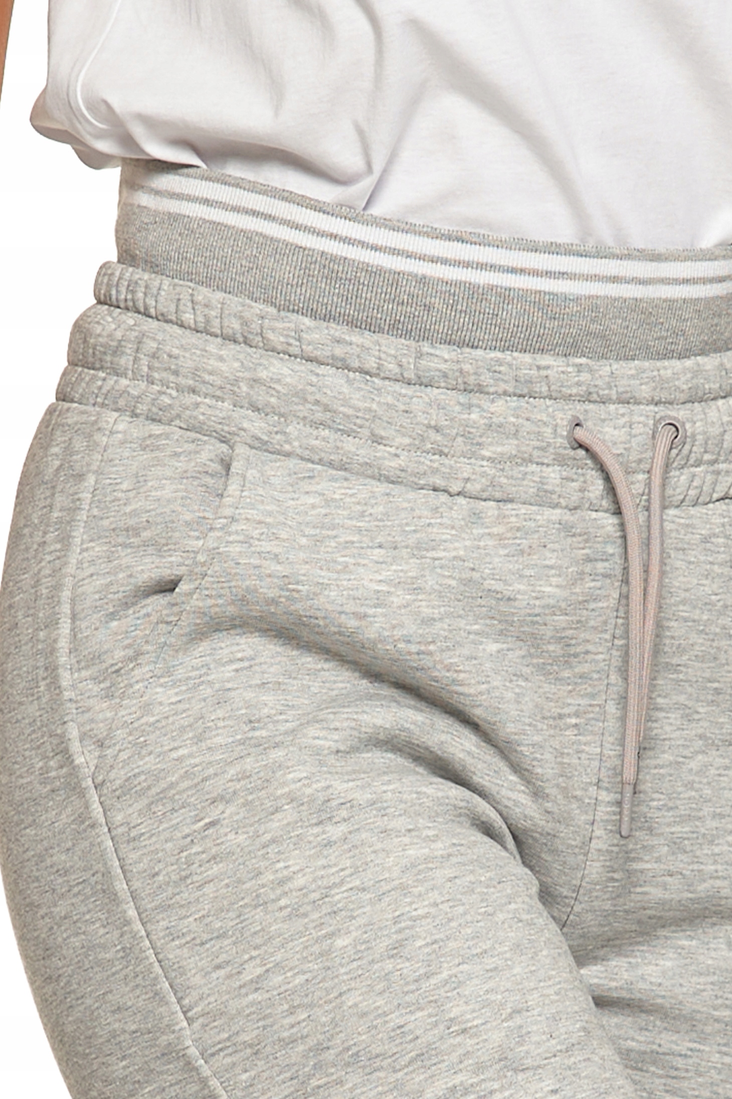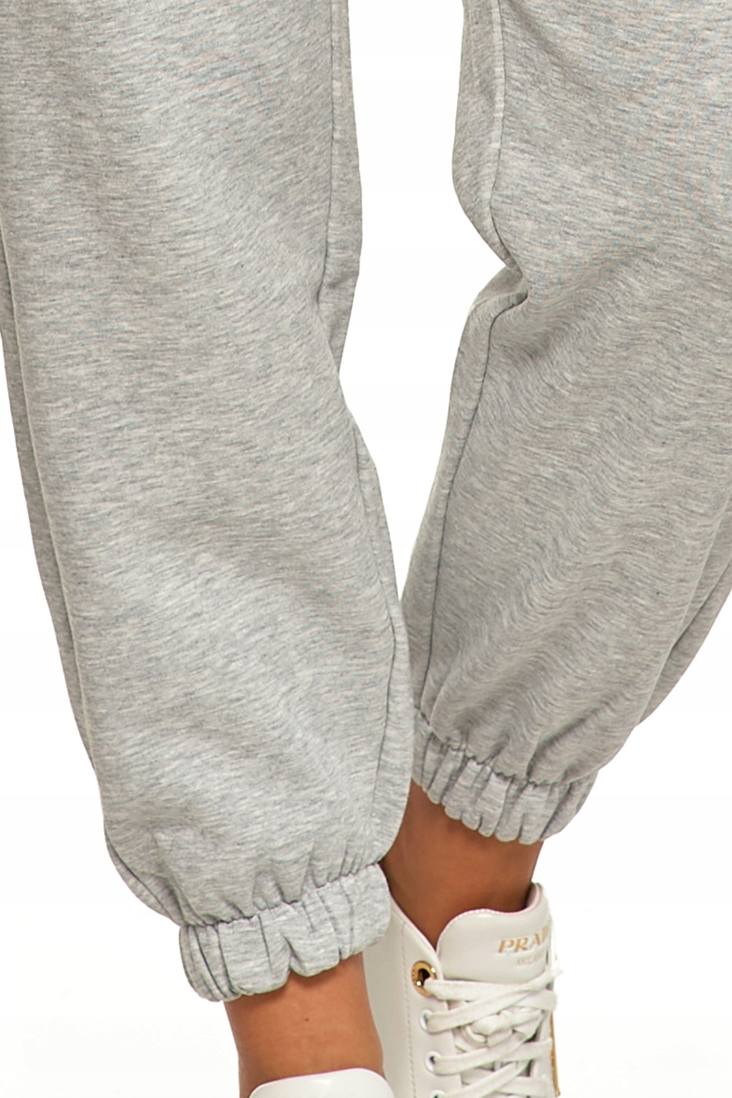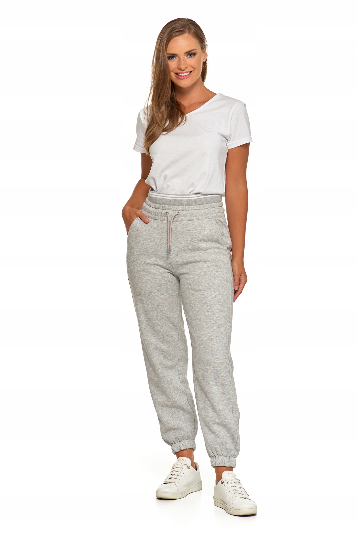 Wykonane z bawełnianej dzianiny z domieszką, zapewniają miękkość, trwałość oraz odpowiednie dopasowanie do sylwetki. Wnętrze spodni wyściełane jest ciepłym materiałem, co sprawia, że są one doskonałe na zimowe spacery lub leniwe dni w domu. Model ten posiada szeroką, elastyczną gumkę w pasie, która zapewnia wygodę noszenia i stabilność. Dodatkowo, w pasie znajduje się regulowane wiązanie, pozwalające na indywidualne dopasowanie. Nogawki zakończone są elastycznym ściągaczem, który dodaje sportowego charakteru i sprawia, że spodnie idealnie przylegają do kostek, chroniąc przed chłodem.