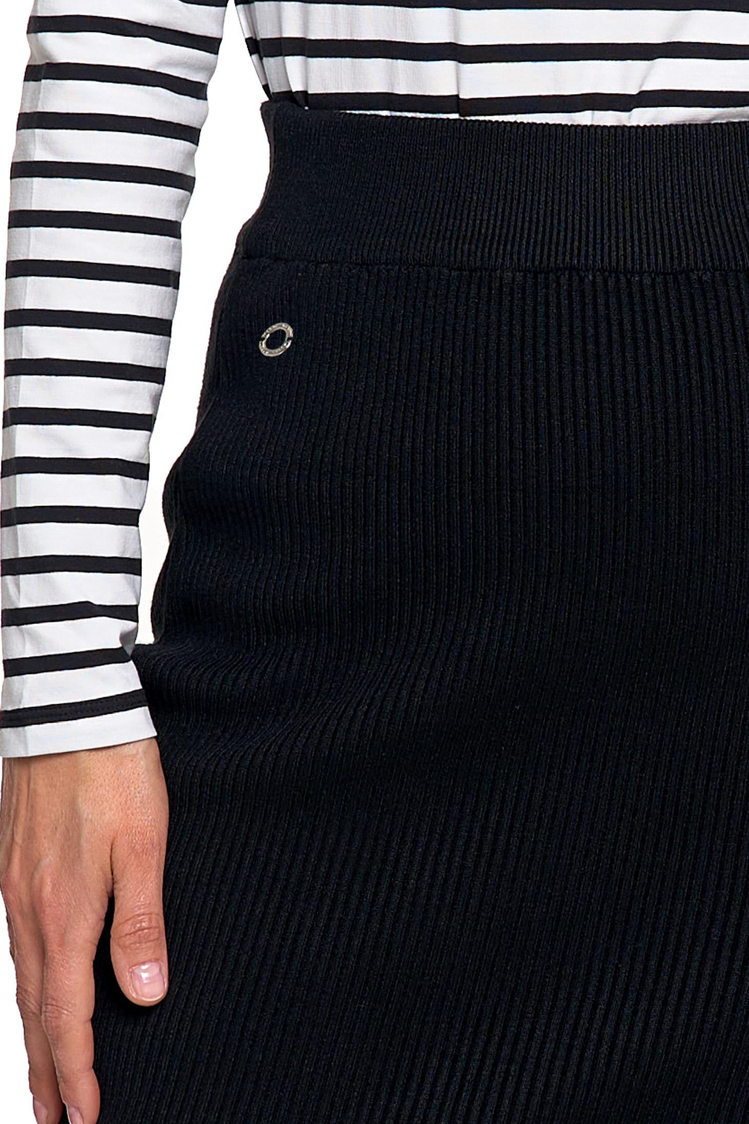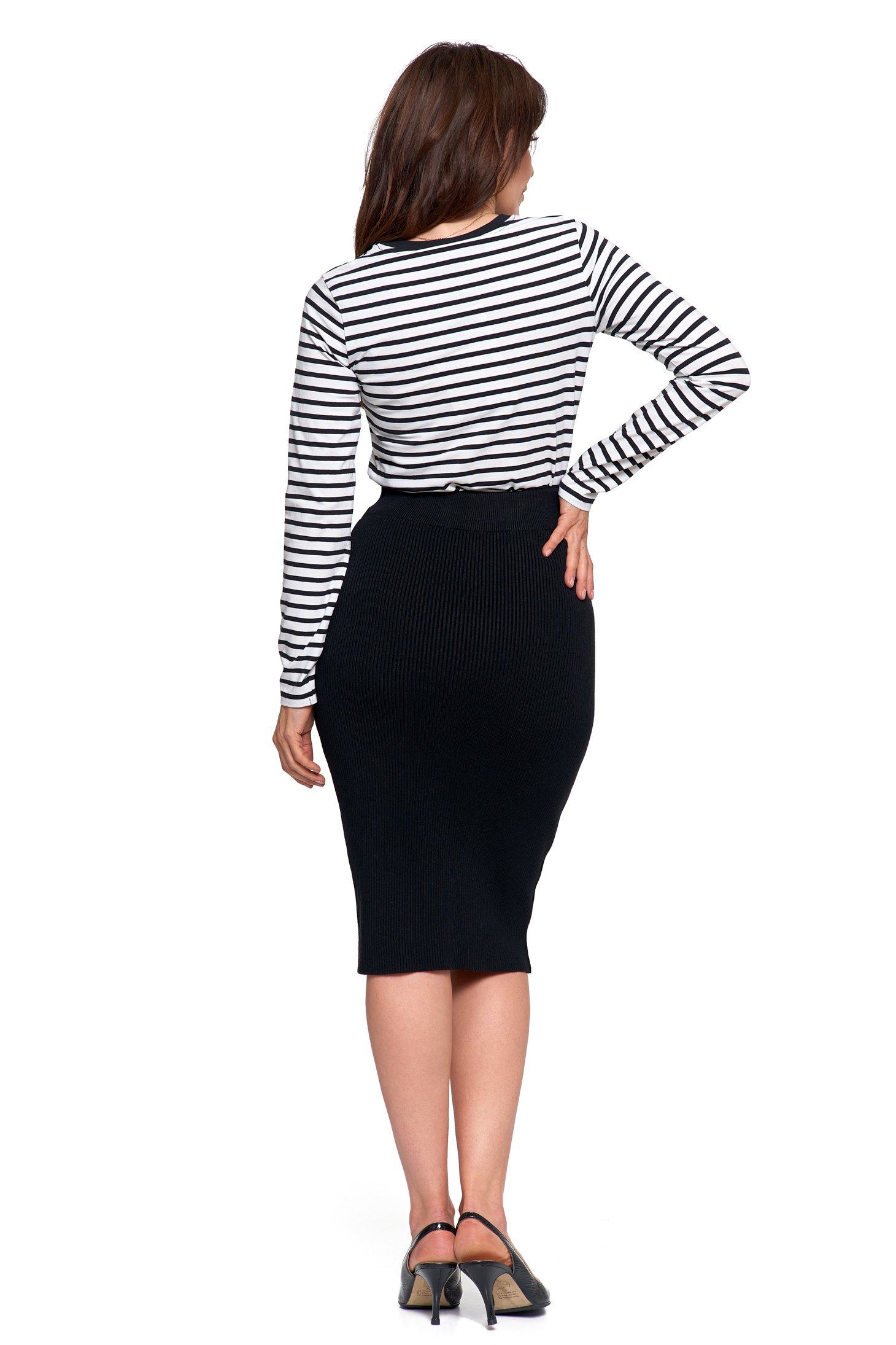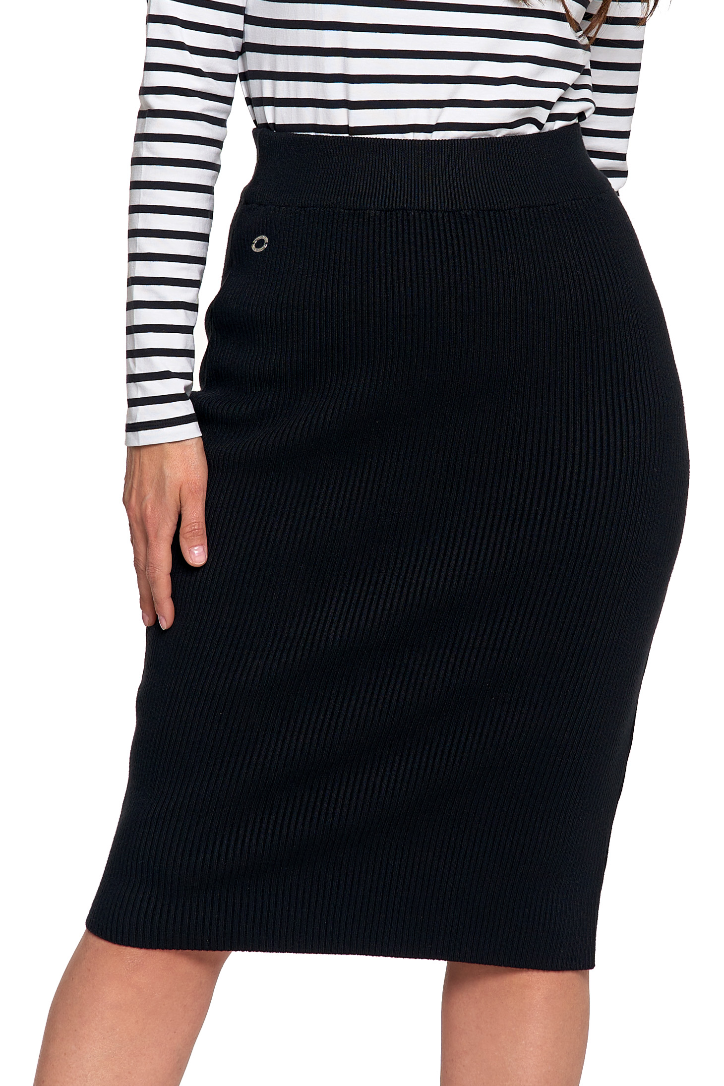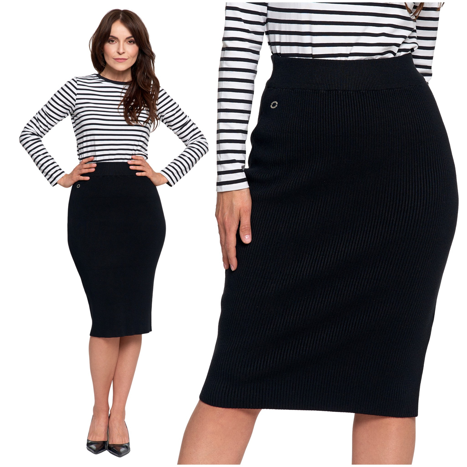 Spódnica ołówkowa midi z prążkowanej dzianiny świetnie sprawdzi się w wielu stylizacjach – od biurowych zestawów z koszulą czy marynarką, po codzienne outfity z t-shirtem lub swetrem. Elegancja i wygoda w jednym, zawsze w stylu.