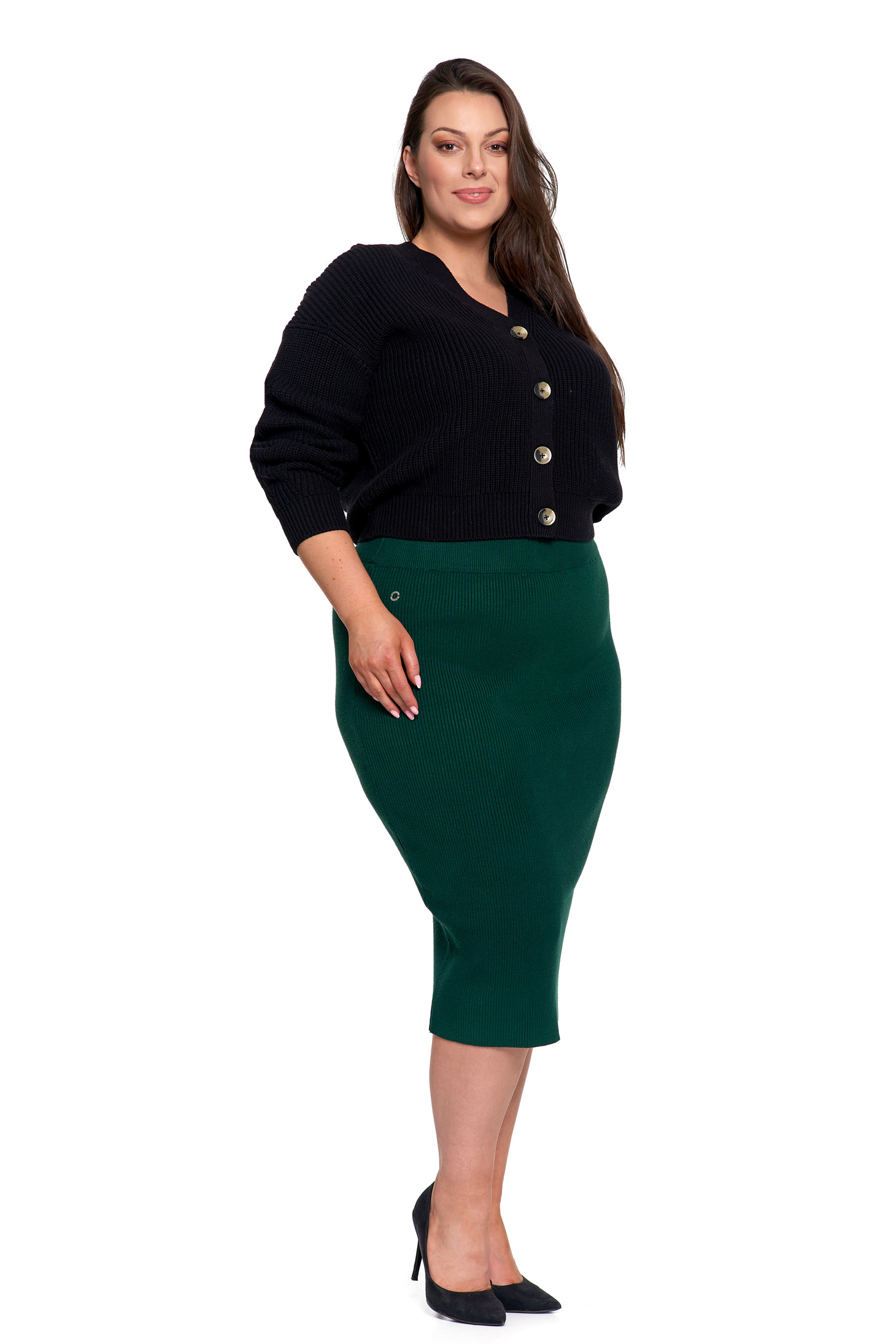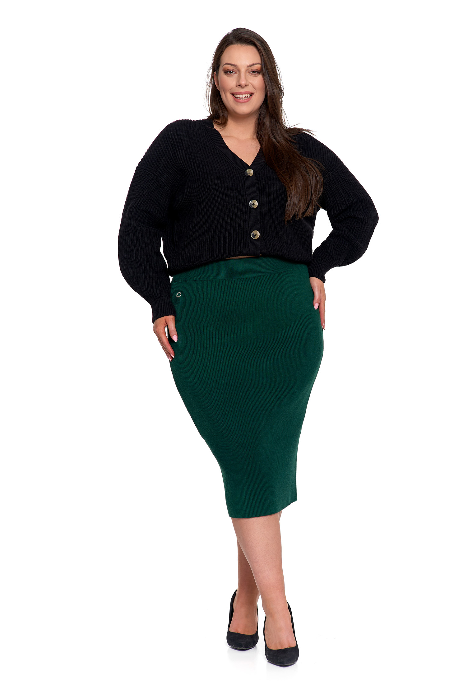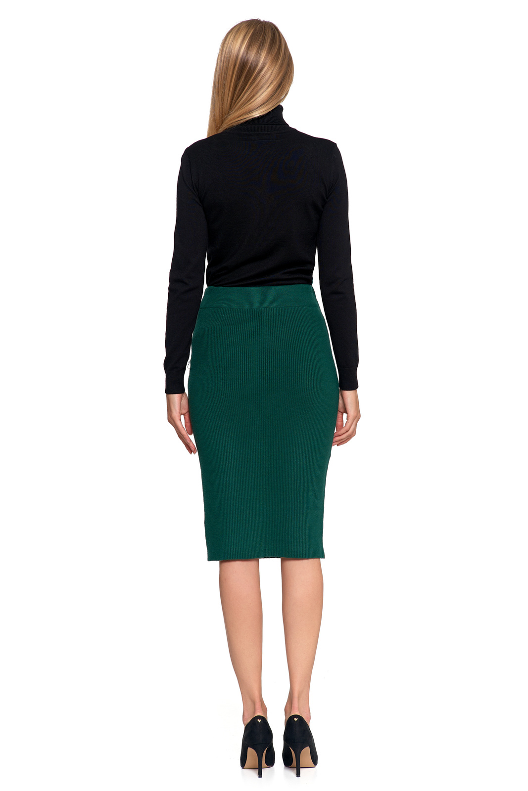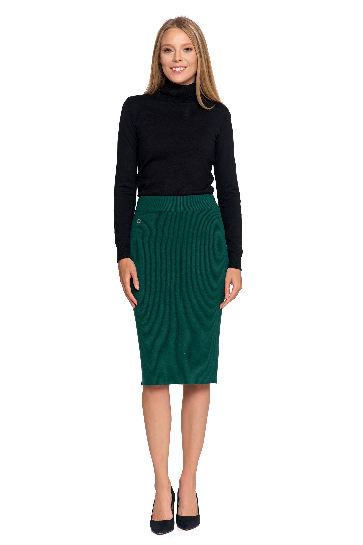 Spódnica ołówkowa midi z prążkowanej dzianiny świetnie sprawdzi się w wielu stylizacjach – od biurowych zestawów z koszulą czy marynarką, po codzienne outfity z t-shirtem lub swetrem. Elegancja i wygoda w jednym, zawsze w stylu.