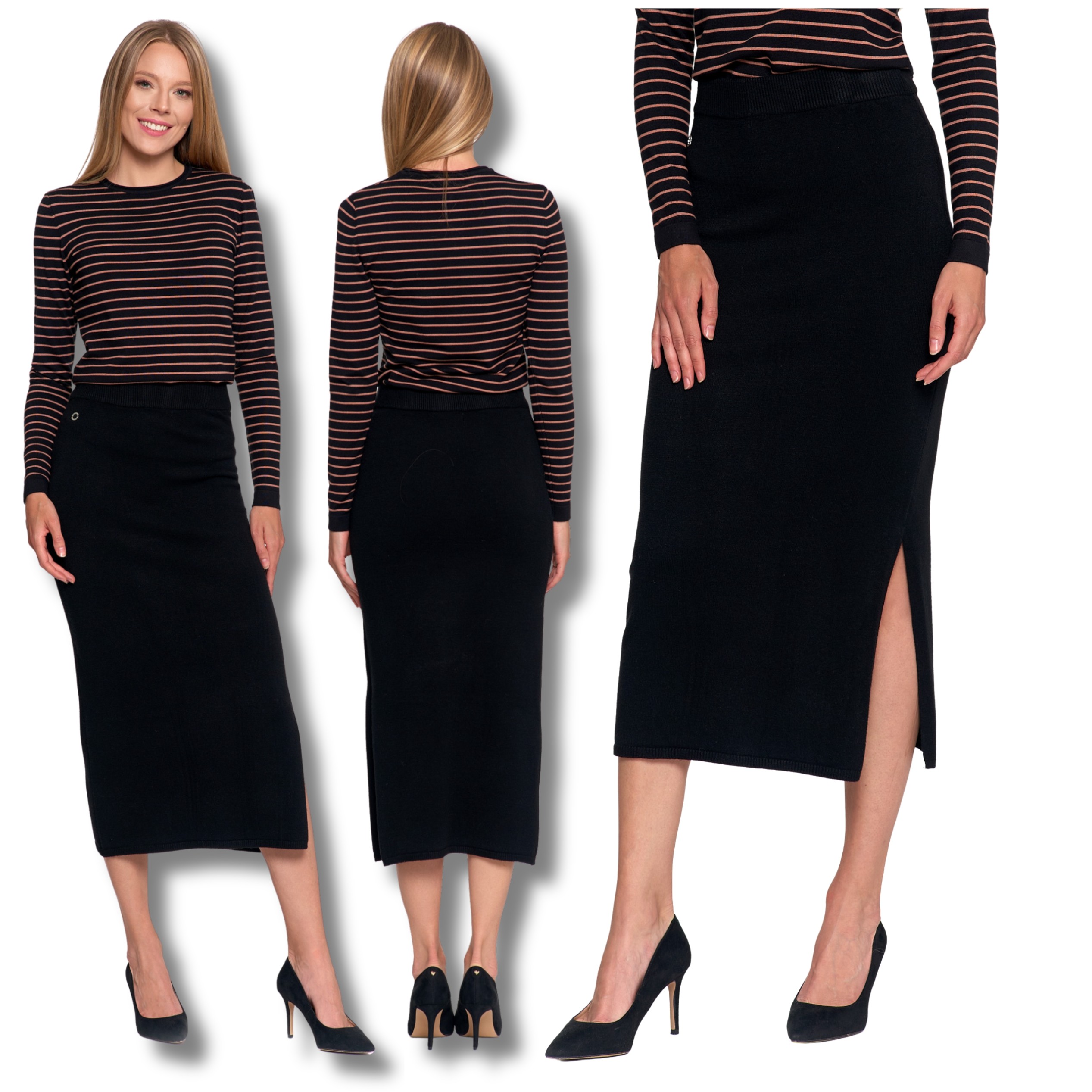 • Elegancki krój: Klasyczna długość midi z subtelnym rozcięciem po boku dodaje kobiecego charakteru.