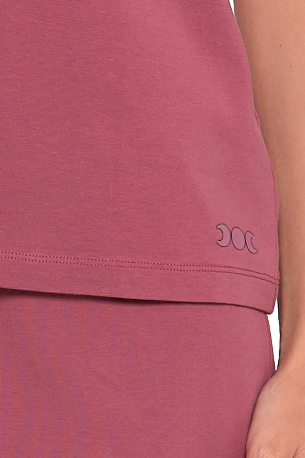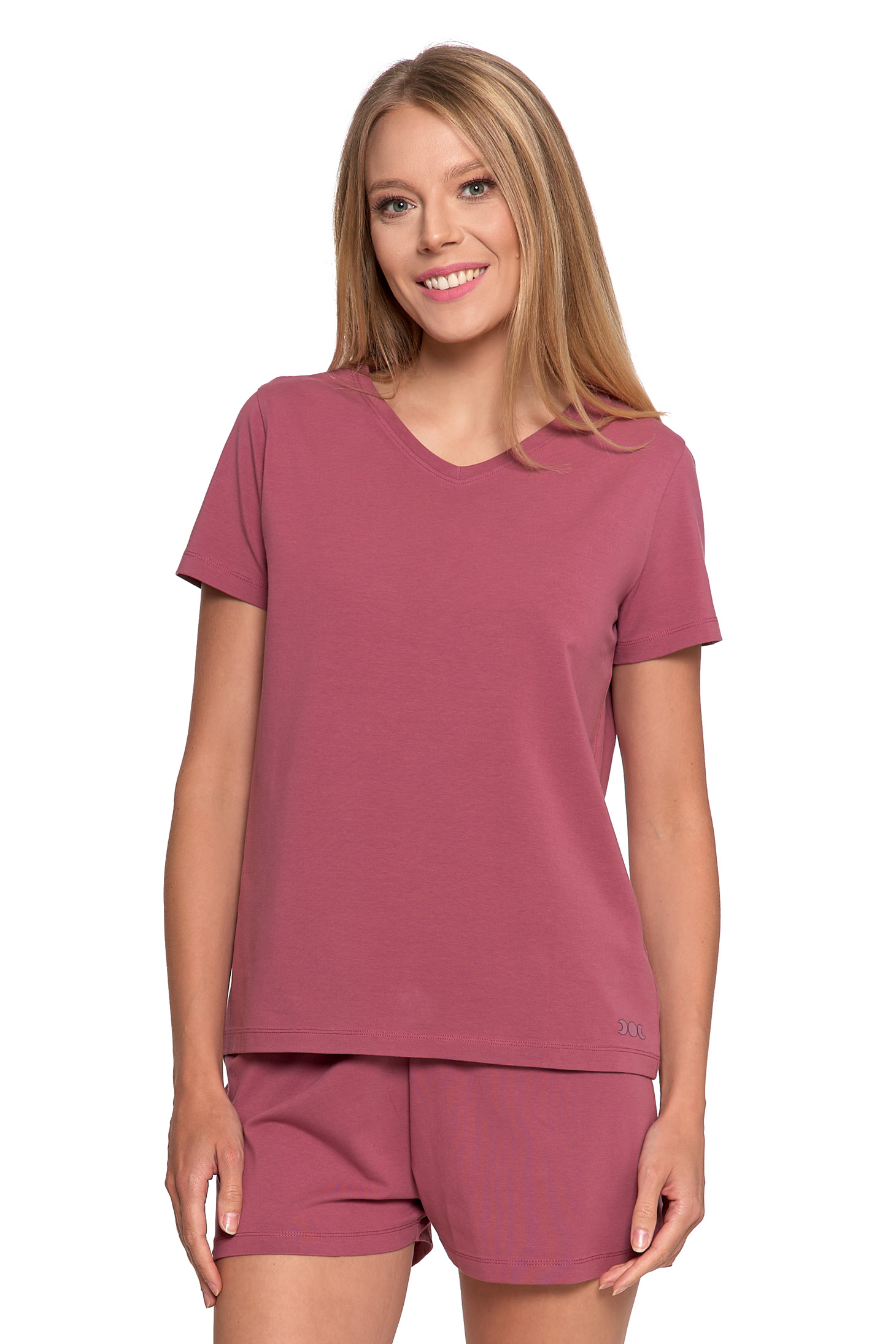 Góra: Klasyczna koszulka z dekoltem w kształcie litery V i krótkim rękawem. Wyróżnia się minimalistycznym kolorem i subtelnym nadrukiem na dole, który dodaje kobiecej lekkości.
