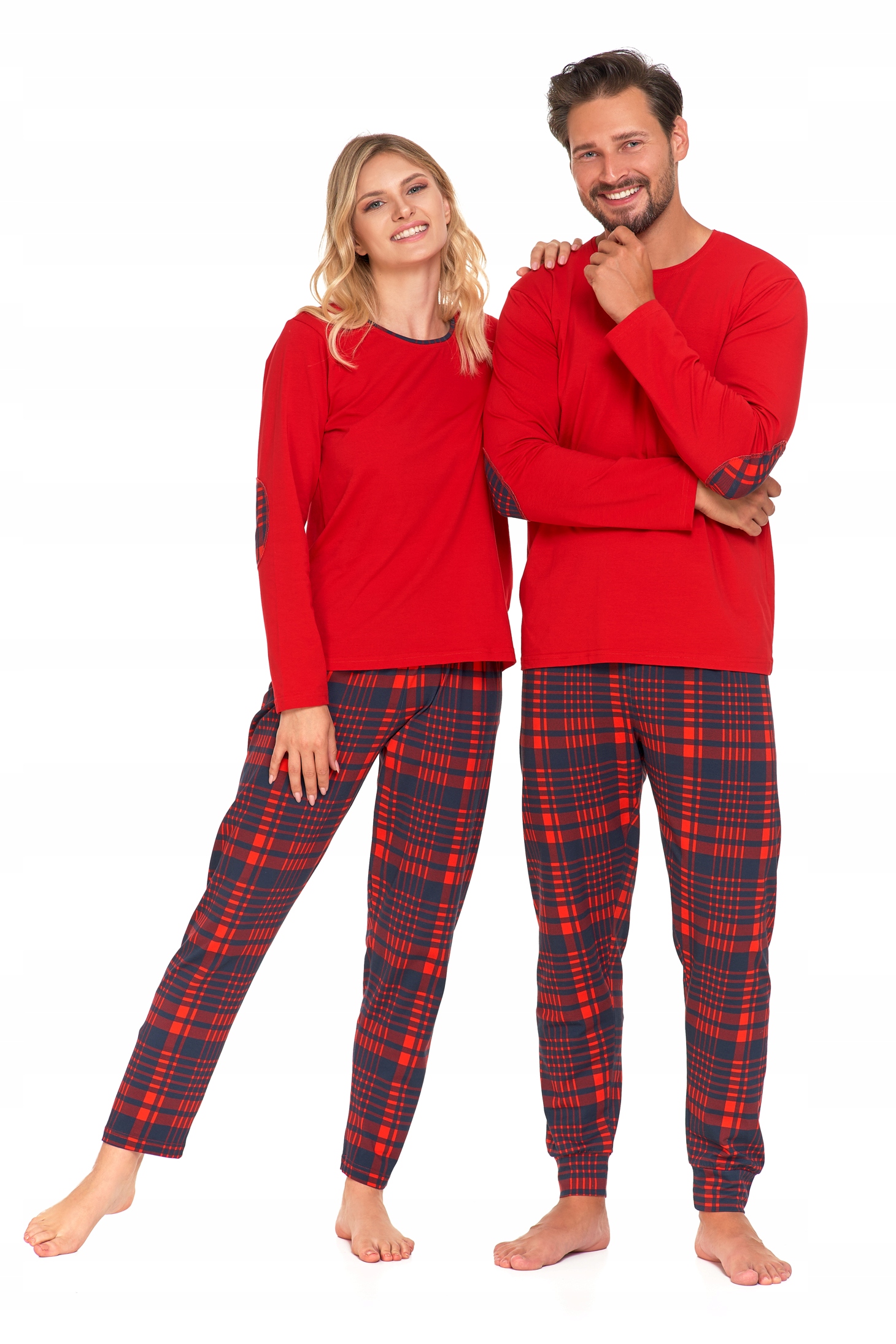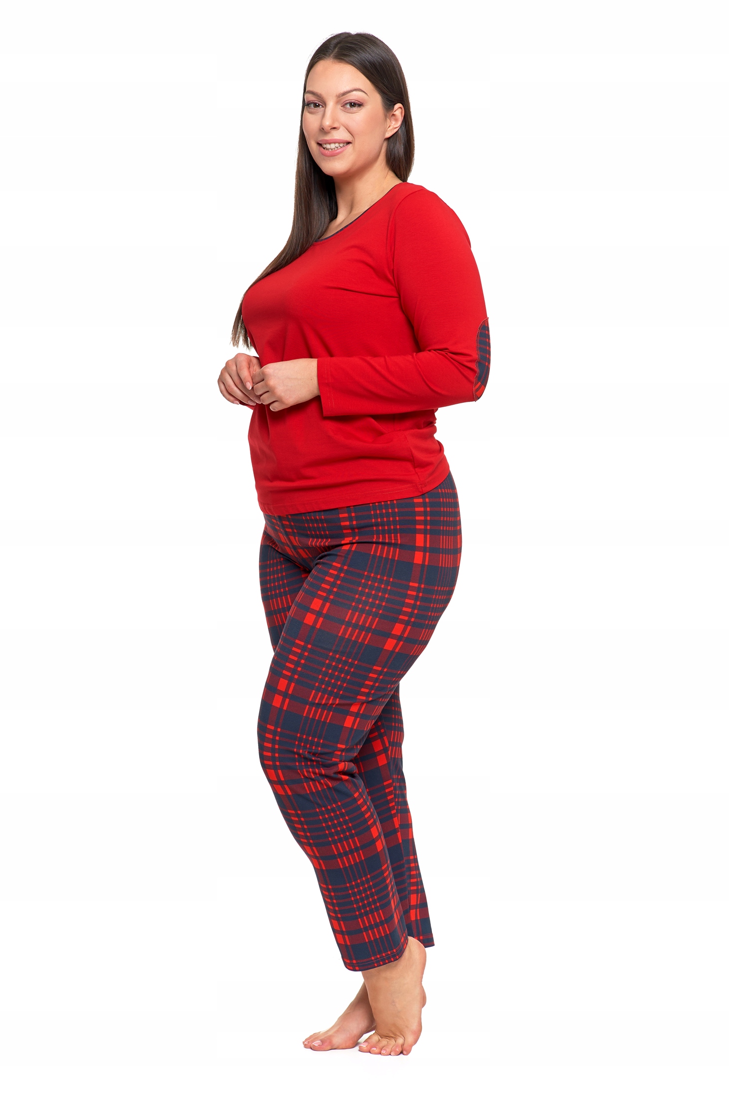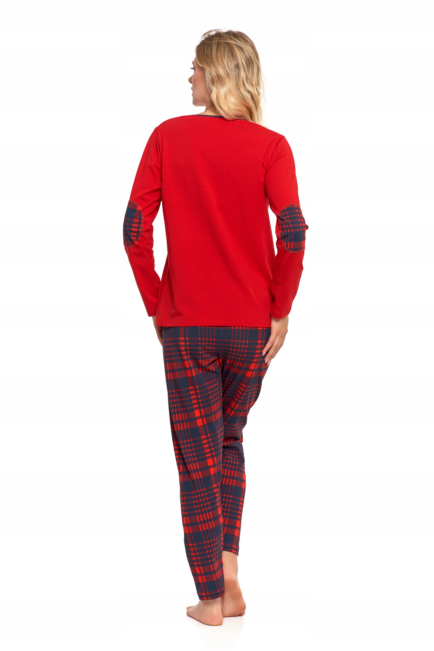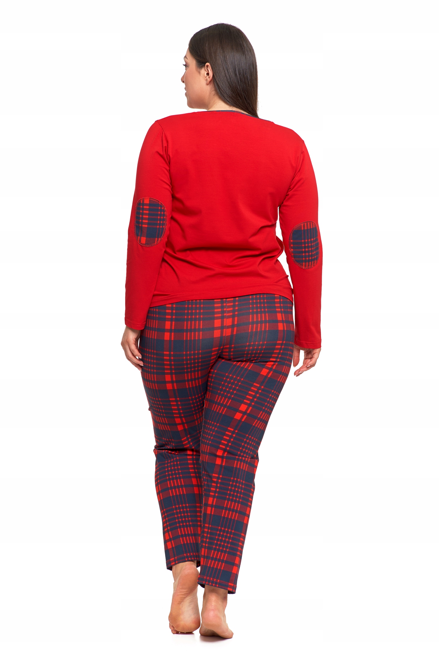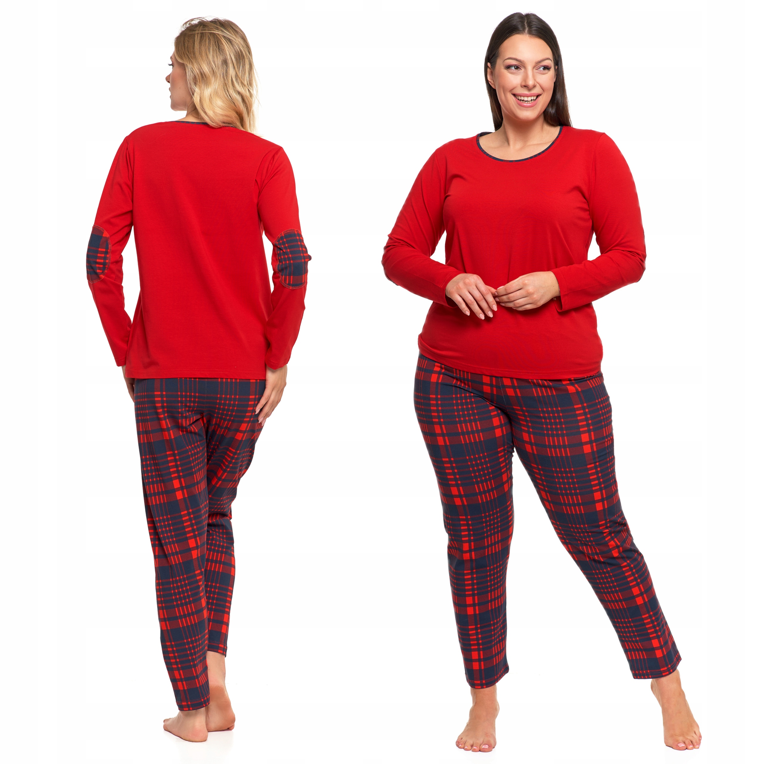 Koszulka z długim rękawem w klasycznej czerwieni wyróżnia się eleganckim kolorem i oraz kontrastującymi naszywkami na łokciach w tym samym wzorze co spodnie, co nadaje całości spójnego wyglądu. Spodnie w kratę posiadają elastyczny pas zapewniając wygodę i idealne dopasowanie.