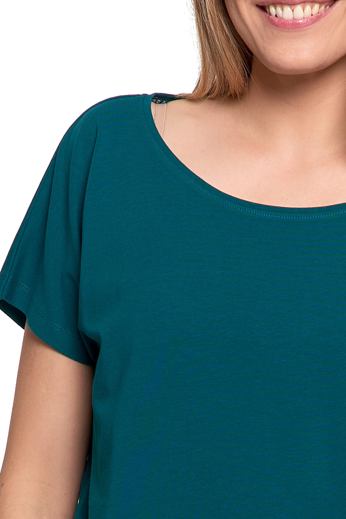 • Góra: Gładka koszulka z krótkim rękawem i klasycznym dekoltem w kształcie litery V, gwarantująca wygodę i swobodę noszenia.