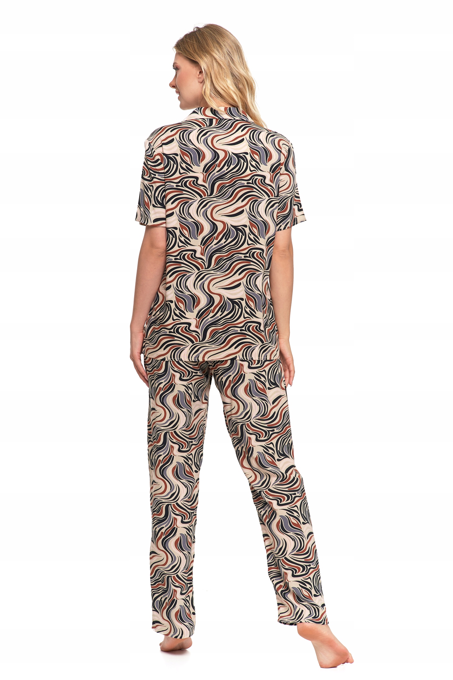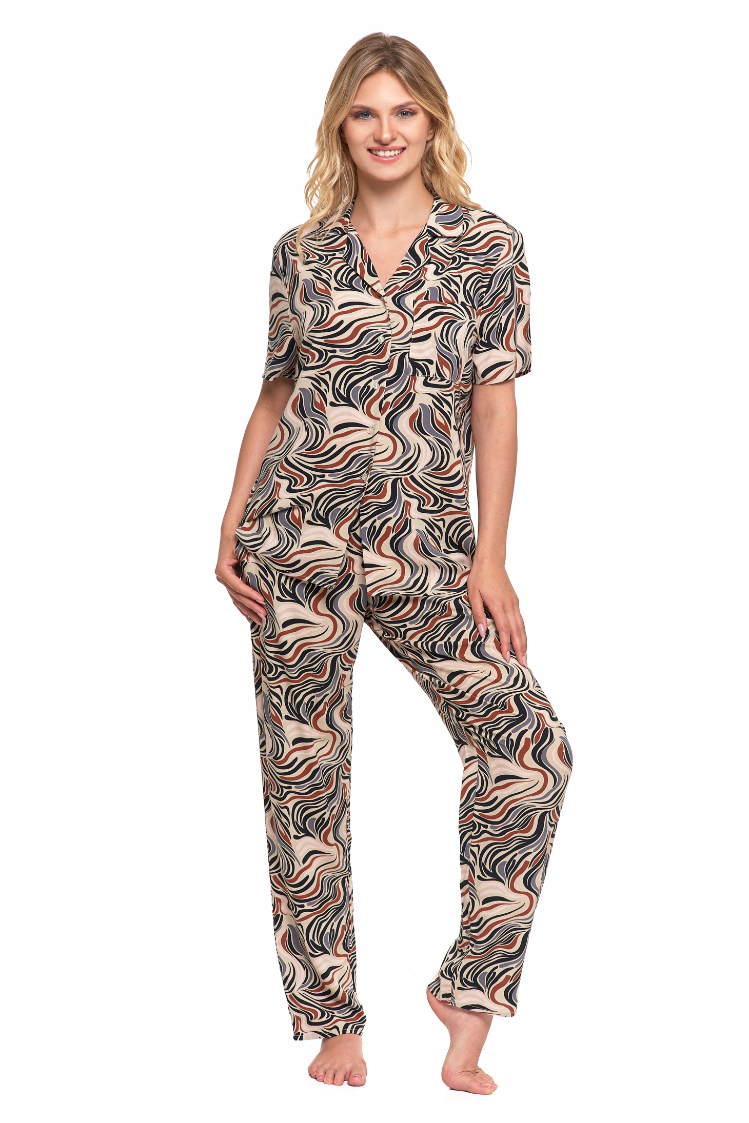 Zaprojektowana z myślą o komforcie i stylu, piżama łączy w sobie nowoczesny, falisty motyw w odcieniach beżu, brązu, czerni i pomarańczy, który nadaje całości oryginalnego charakteru. Idealna na każdą noc, piżama zapewnia pełną swobodę i wygodę.