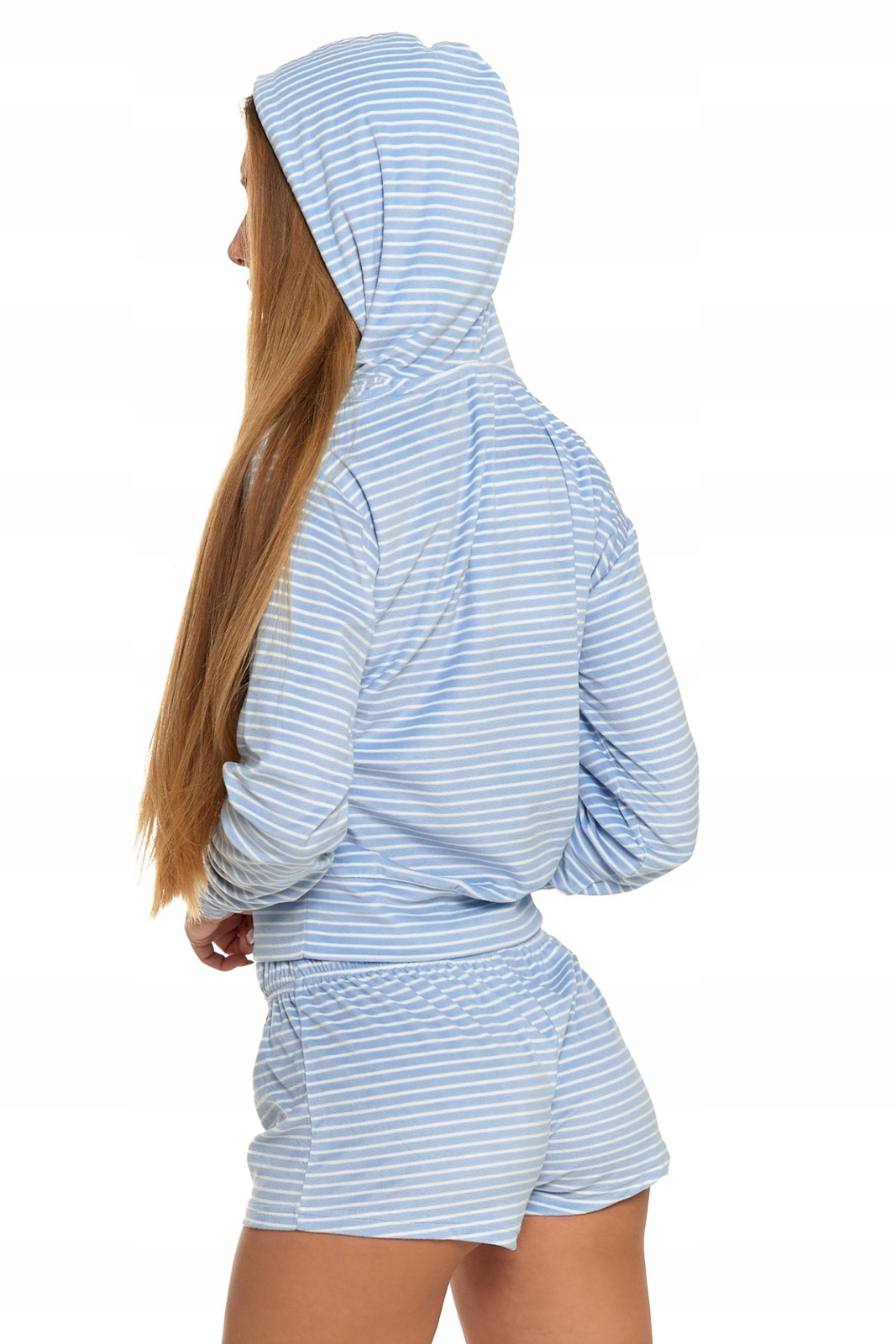 Górna część piżamy to bluza z kapturem, dodająca nie tylko przytulności, ale także nowoczesnego uroku. Welurowy materiał sprawia, że każdy dotyk z nią to czysta rozkosz dla skóry. Paski dodają elementu elegancji, nadając całości lekkości i uroku.