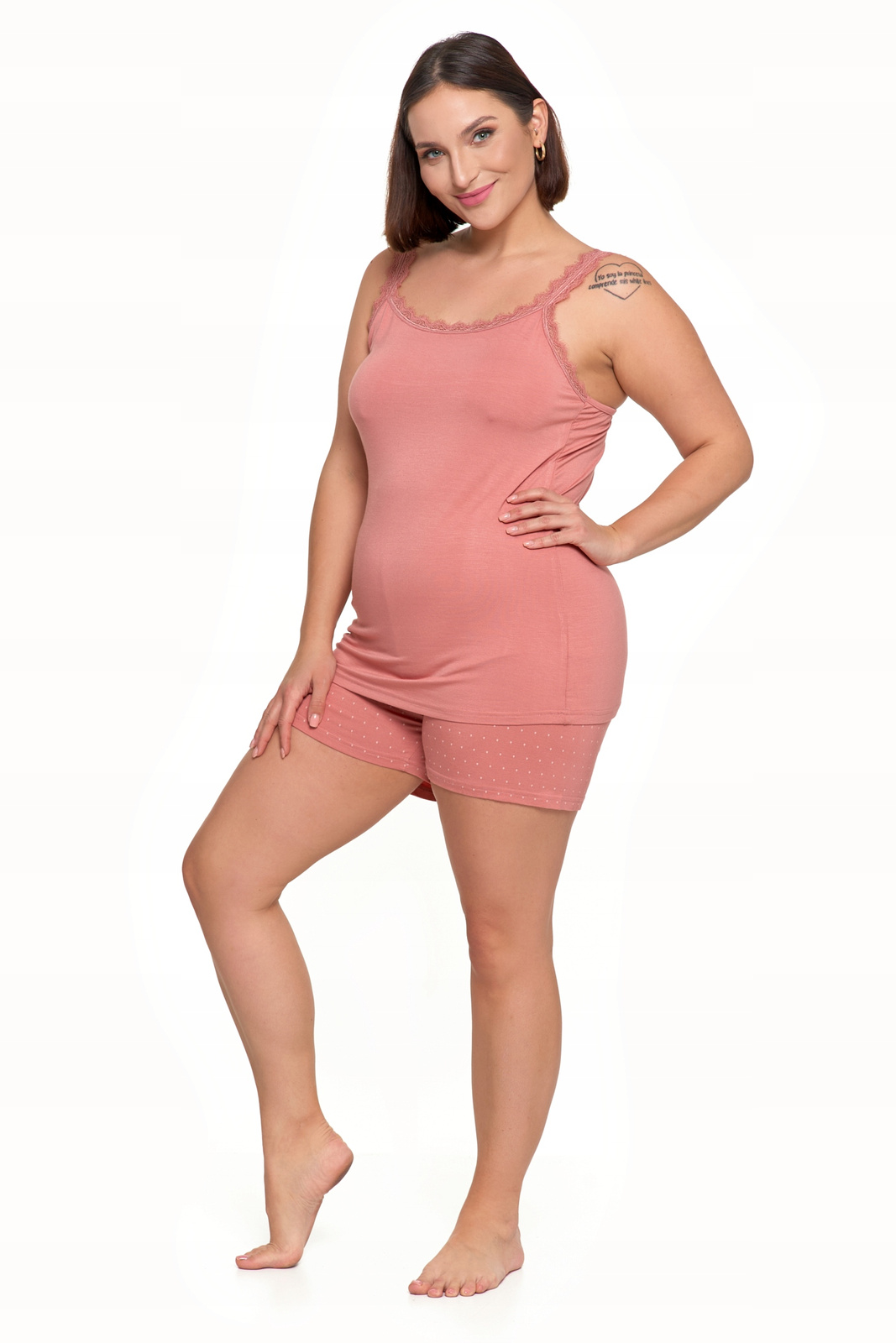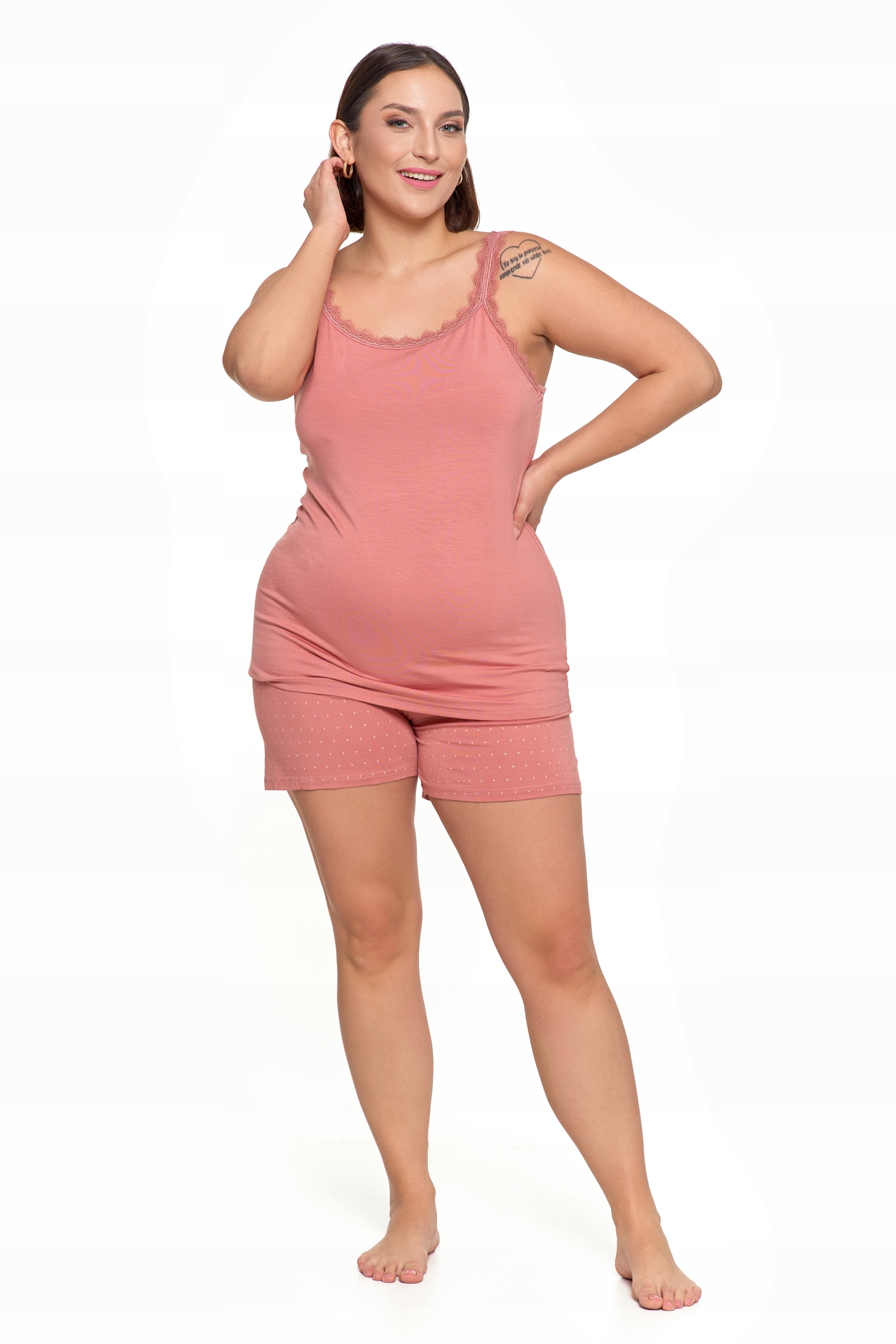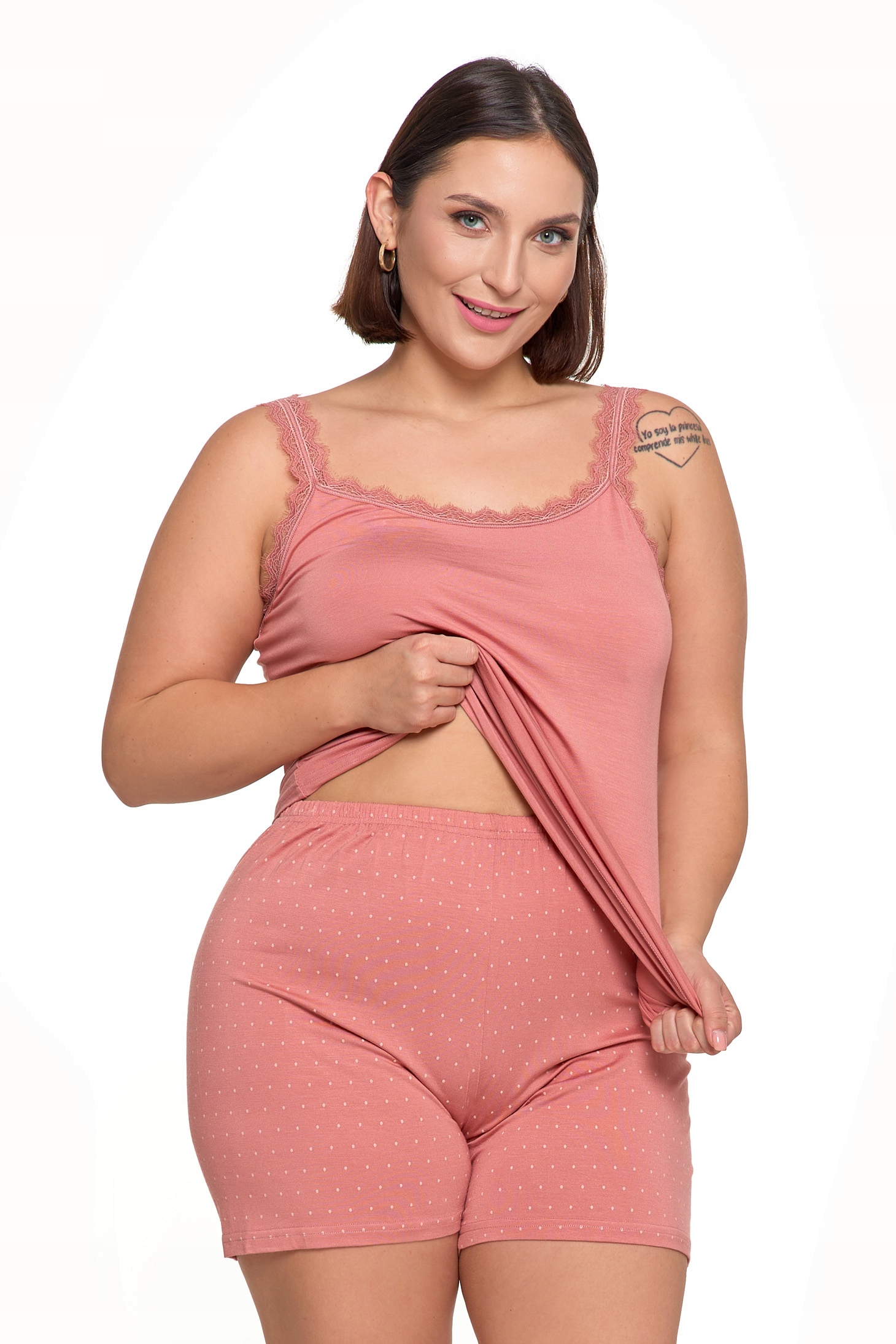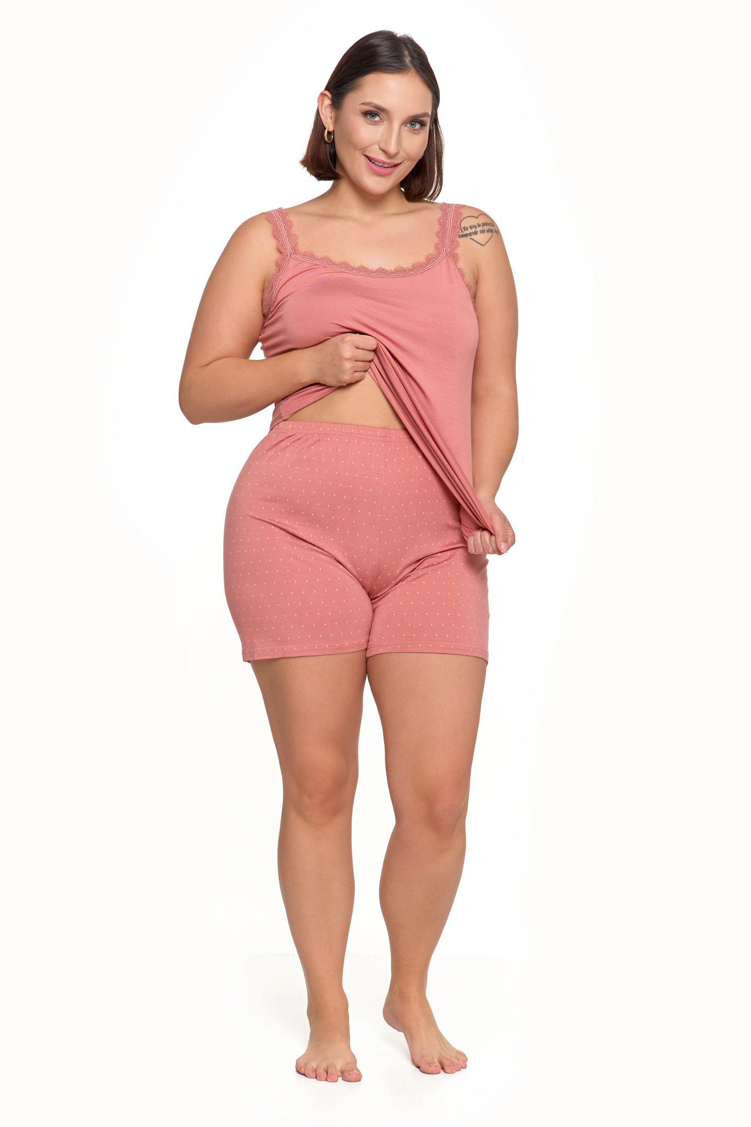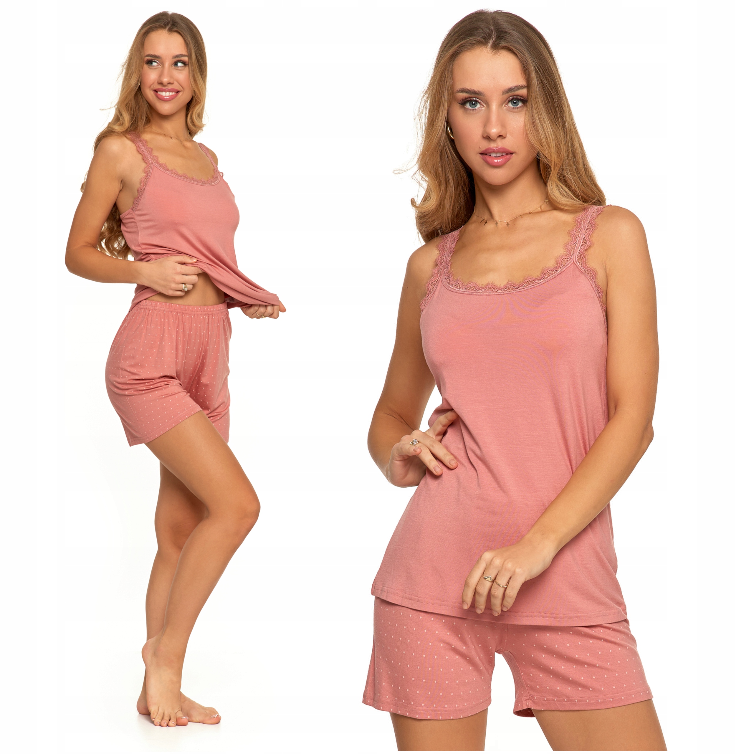 - Stylowy design: Różowa koszulka na ramiączkach ozdobiona subtelną koronką oraz krótkie spodenki w delikatne kropeczki tworzą elegancki i kobiecy komplet.
