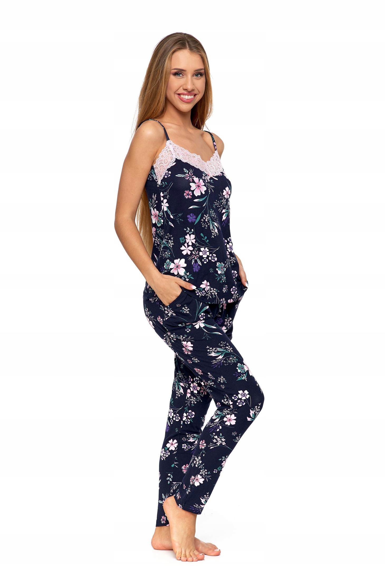 Damska piżama na ramiączkach z długimi spodniami, uszyta z miękkiej w dotyku wiskozy. Ramiączka są regulowane. Dzięki niewielkiej domieszce elastanu materiał jest sprężysty i dobrze układa się na sylwetce. Spodnie w pasie mają elastyczną gumę, co korzystnie wpływa na komfort użytkowania. Górna część piżamy wykończona jest efektowną koronką. Model zdobi niezwykle kobiecy, kwiatowy wzór.