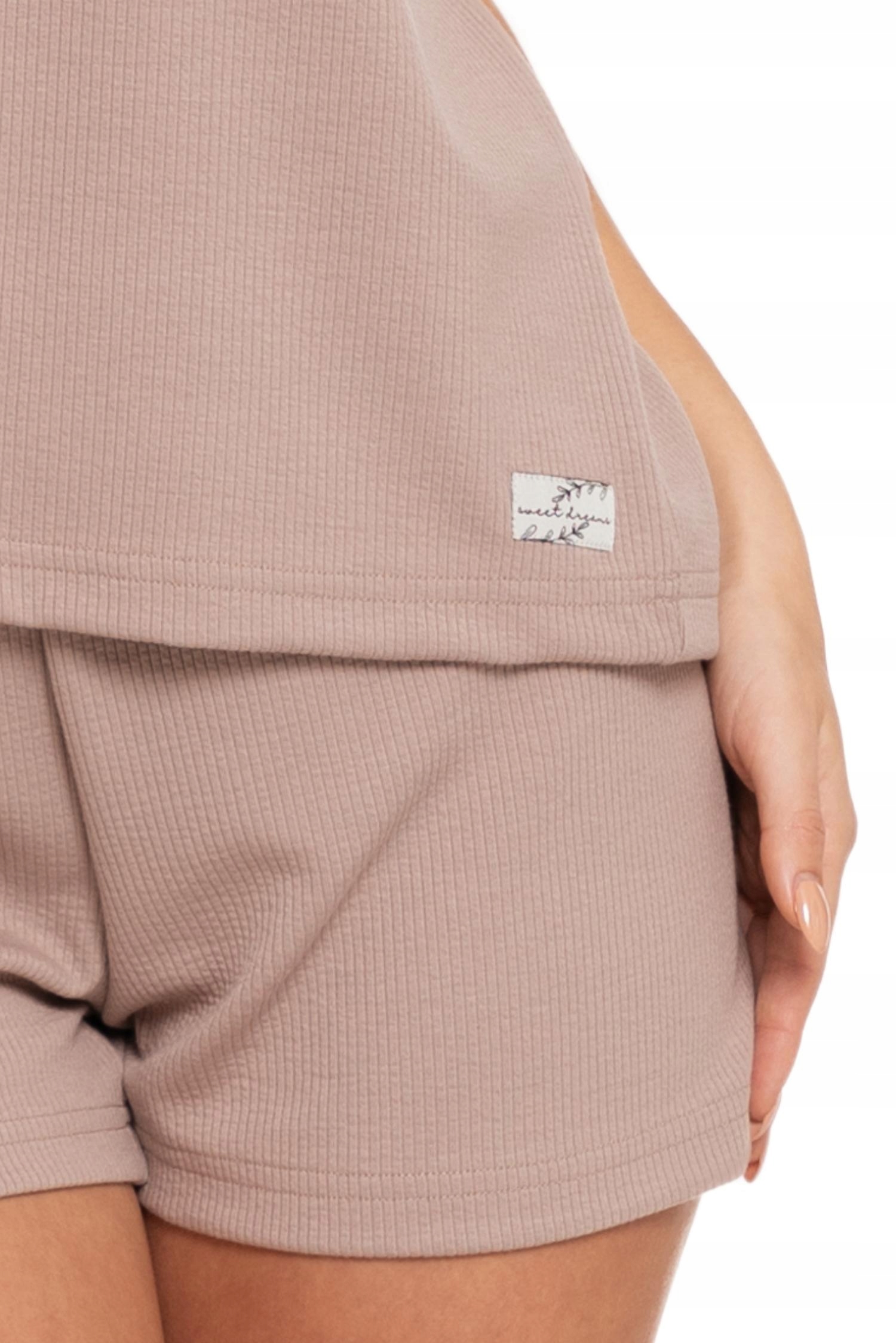 Beżowa, prążkowana tkanina dodaje elegancji i subtelności, czyniąc tę piżamę nie tylko wygodną, ale także modną opcją na nocny odpoczynek.