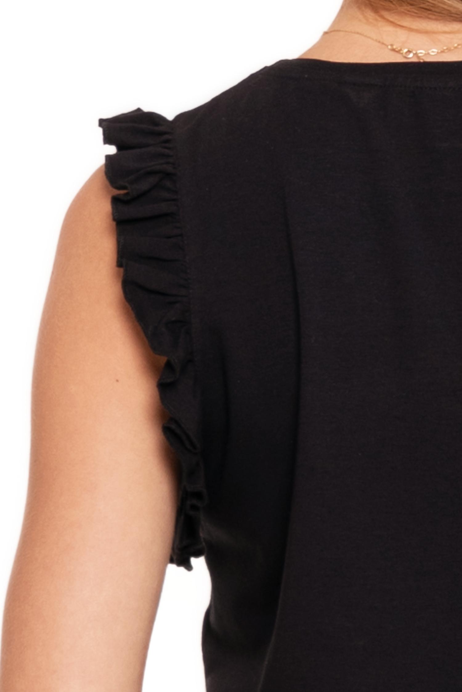 Koszulka bez rękawów w kolorze czarnym dodaje piżamie elegancji, podkreślając delikatność szyi. Dodatkowo, falbanki nadają koszulce dziewczęcego uroku, tworząc efektowny detal.