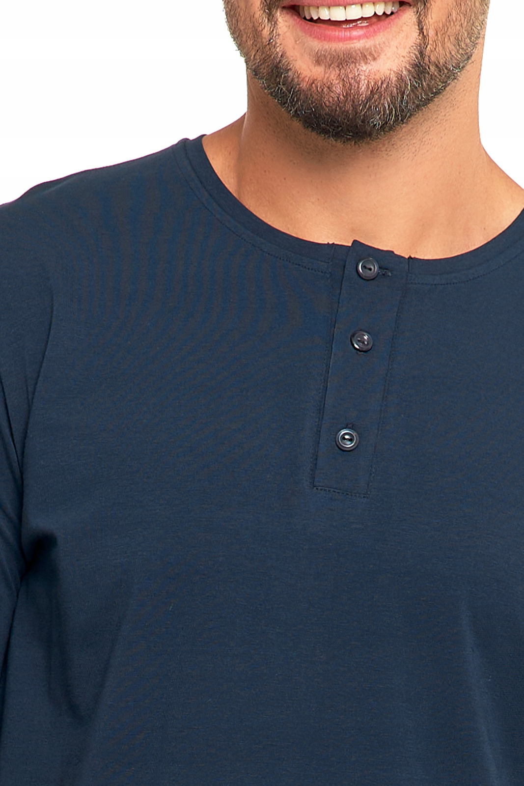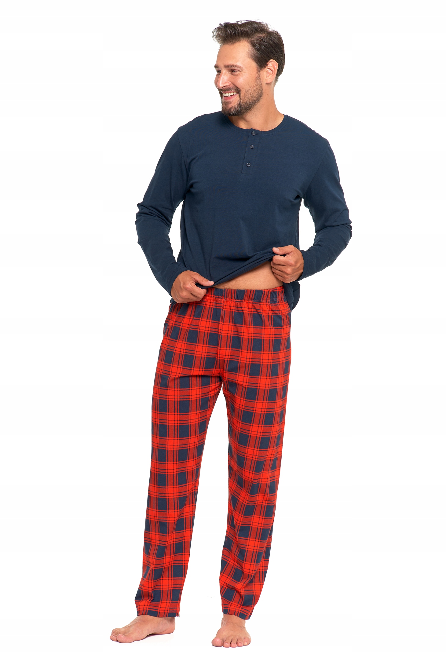 Stylowa męska piżama składająca się z dwóch części: gładkiej, granatowej koszulki z długim rękawem oraz spodni w klasyczny wzór w kratę.