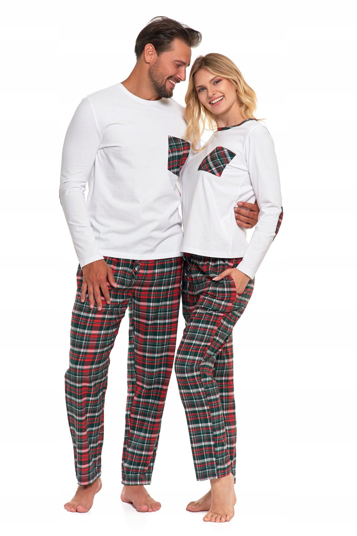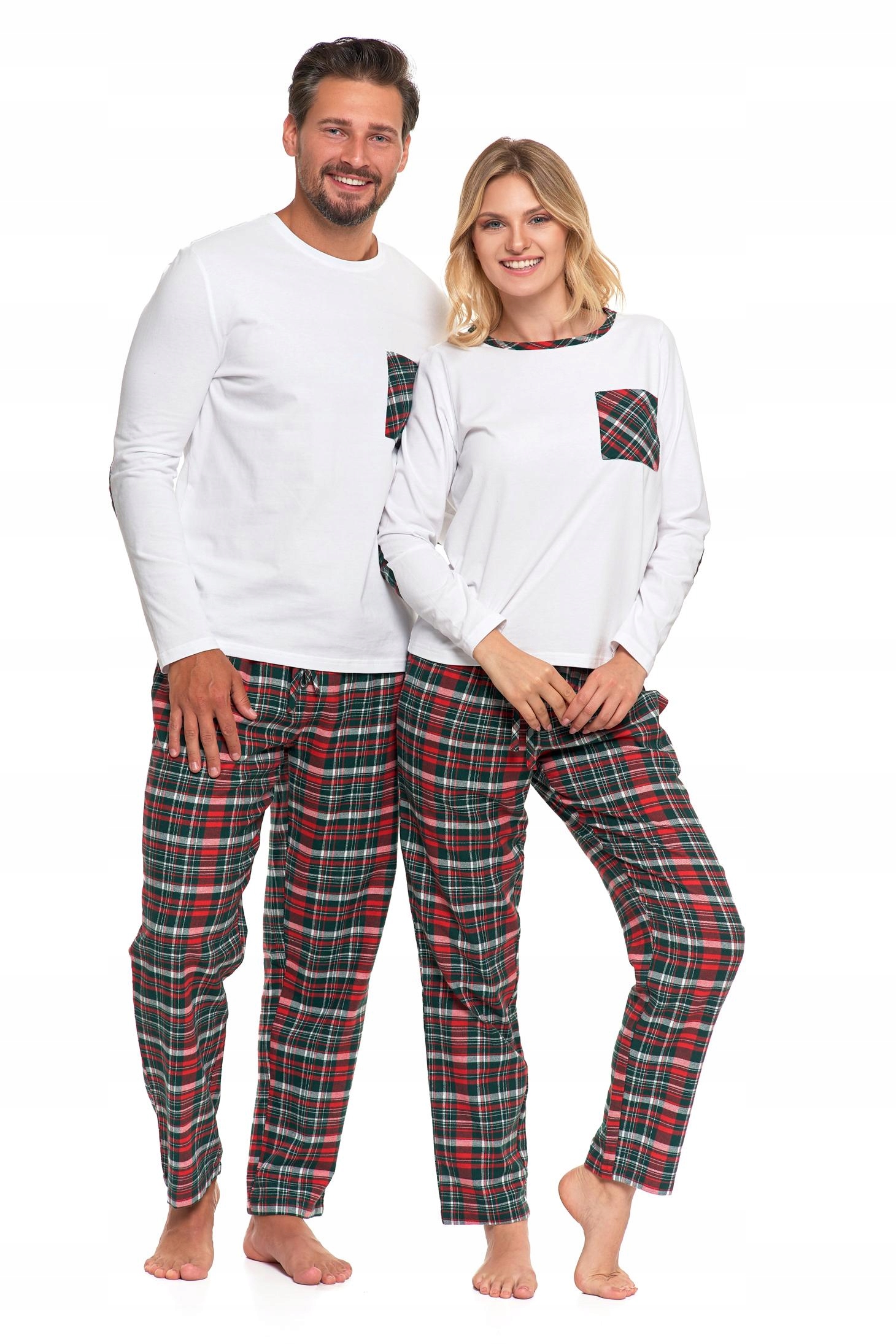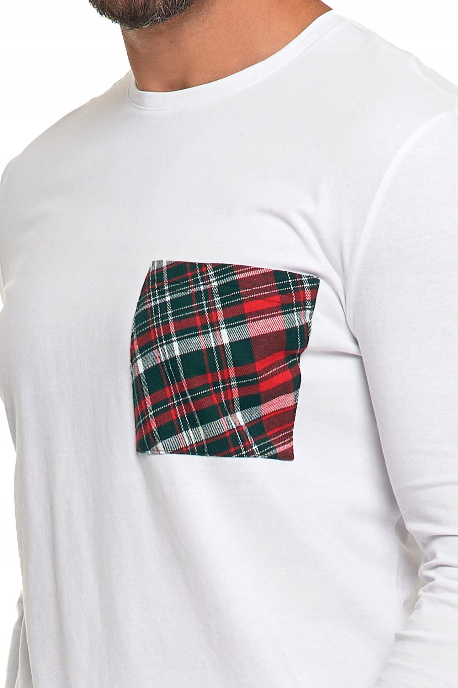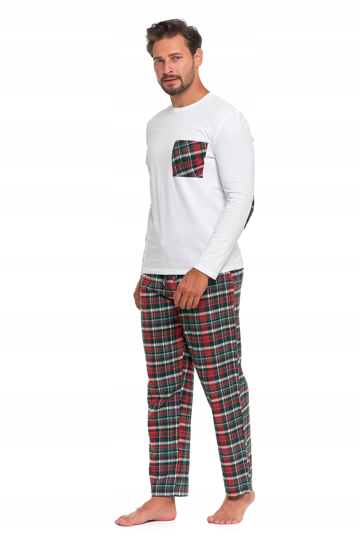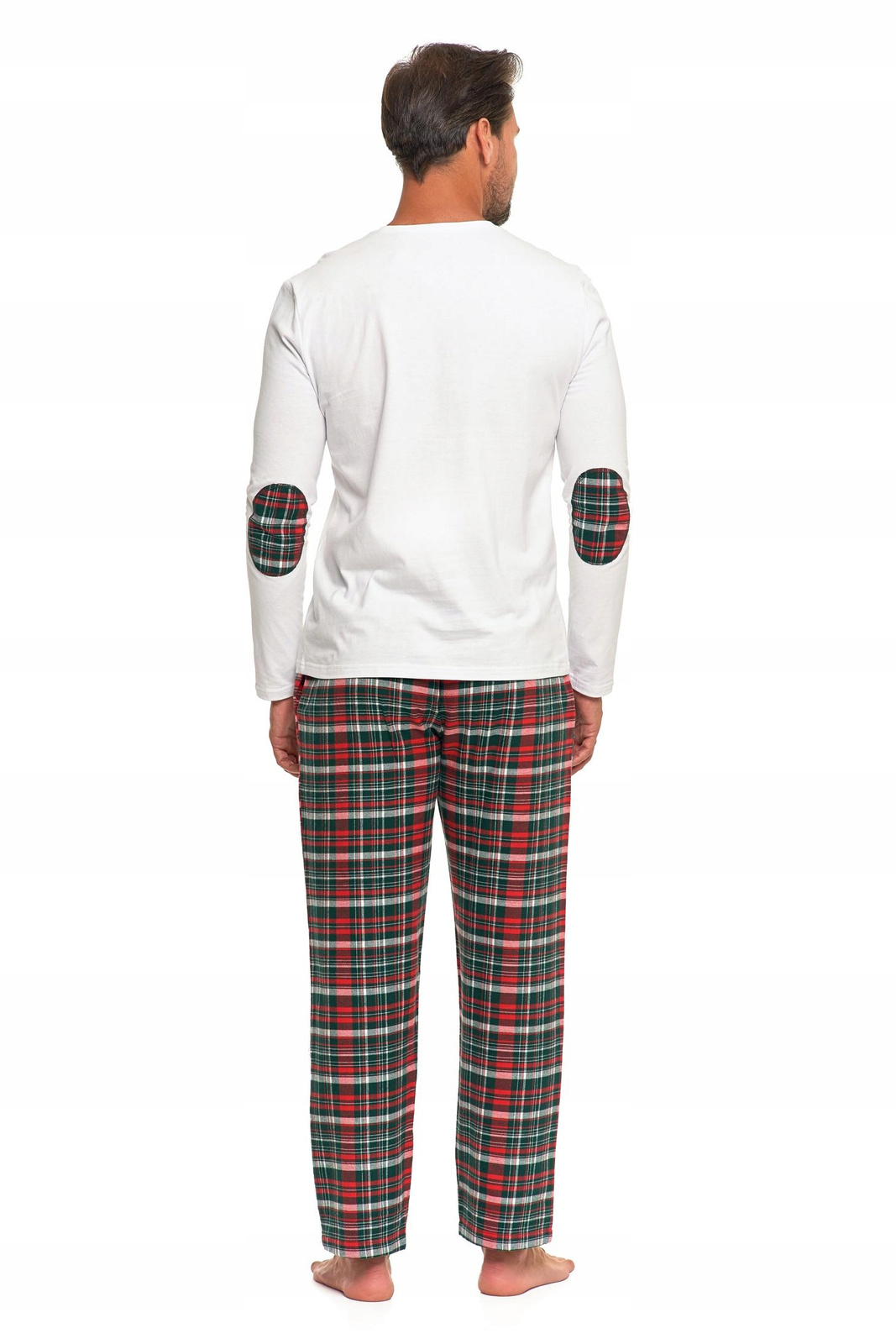 Stylowa męska piżama składająca się z dwóch części: gładkiej, białej koszulki z długim rękawem i kontrastującymi naszywkami w kratkę na łokciach oraz spodni w klasyczny wzór w czerwono-zieloną kratę.