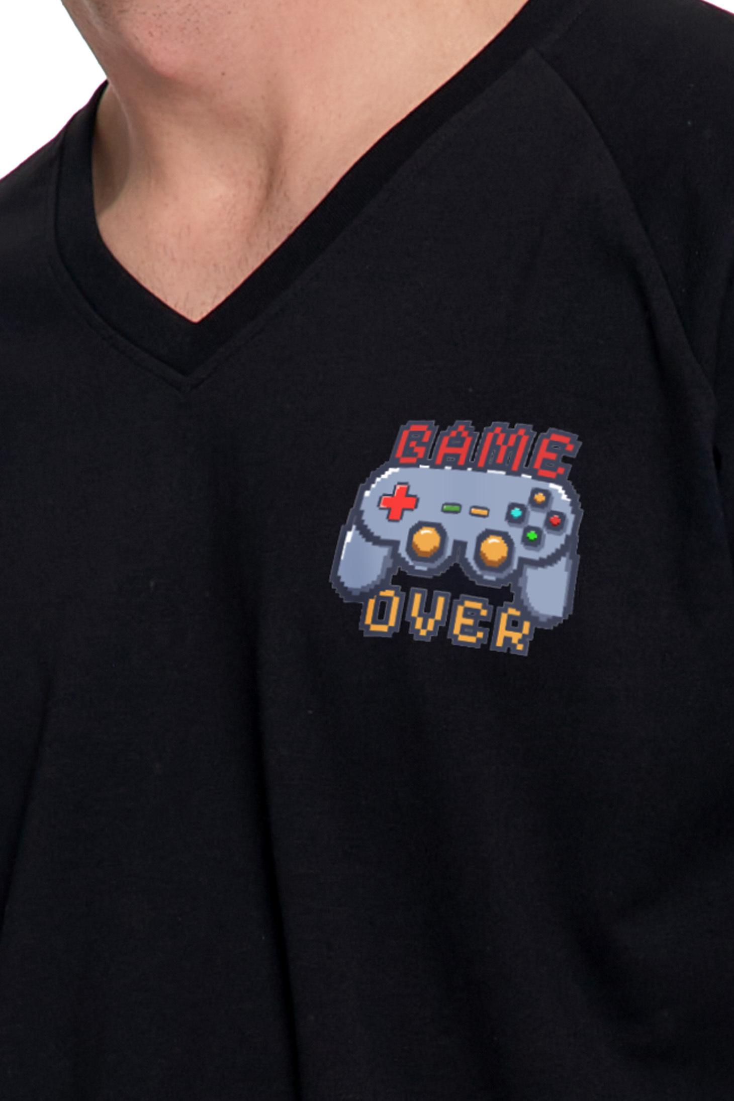 Góra (Koszulka): Czarna koszulka z dekoltem w serek. Nadruk z motywem konsoli i hasłem "Game Over" idealnie oddaje klimat wypoczynku.