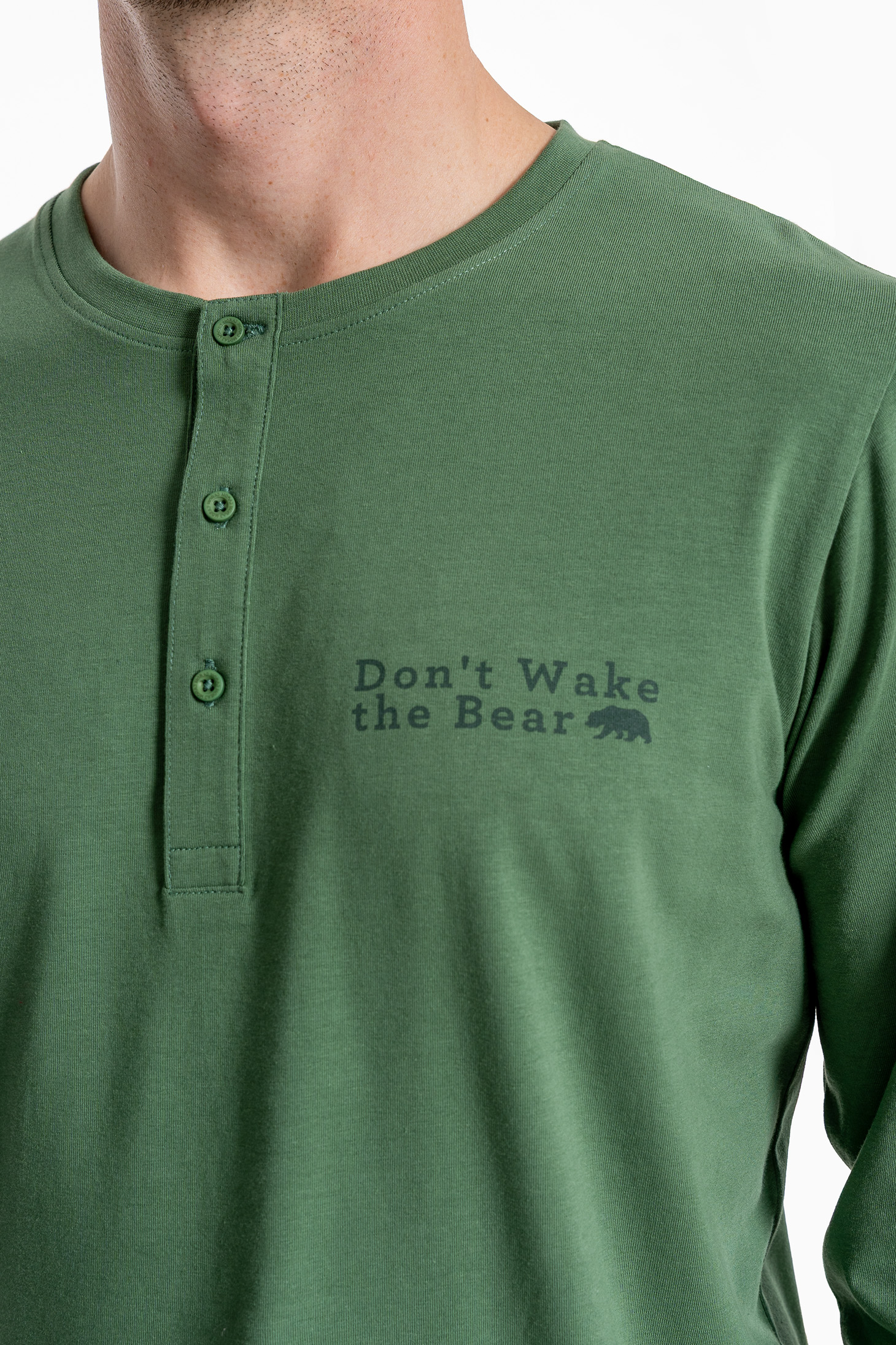 Góra (Koszulka): Długi rękaw i okrągły dekolt w stonowanym odcieniu zieleni. Praktyczne zapięcie na guziki oraz subtelny nadruk "Don't Wake the Bear" na piersi dodają charakteru.