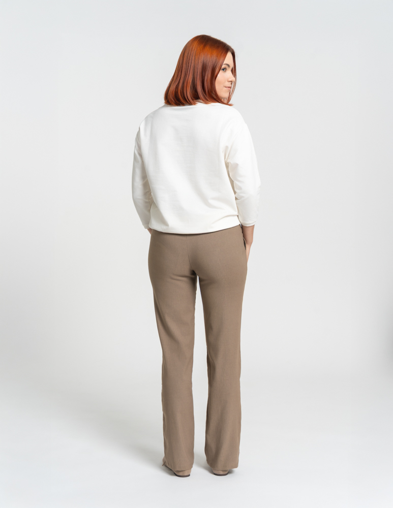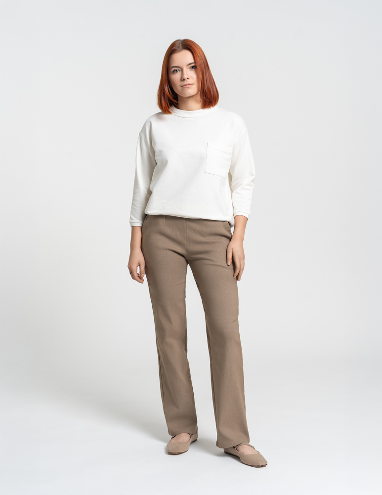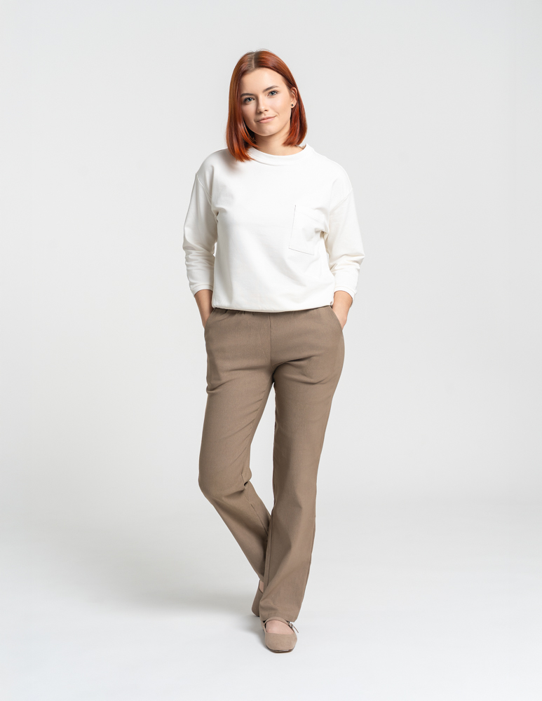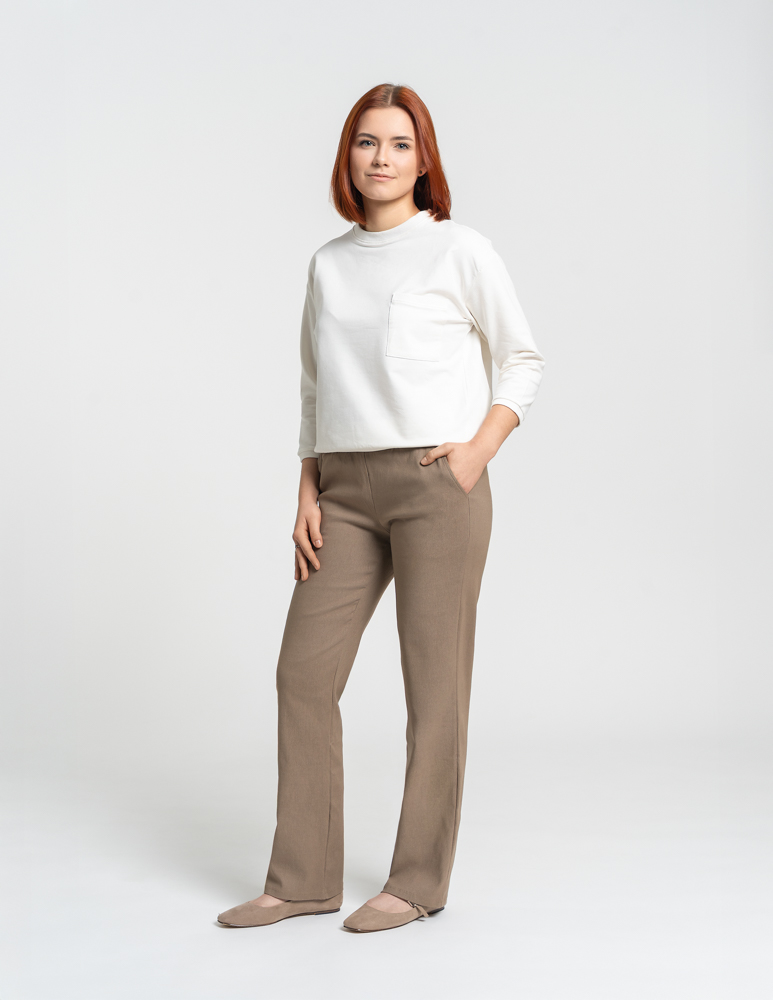 • Krój: Proste nogawki oraz luźniejsza góra tworzą klasyczną, uniwersalną sylwetkę.