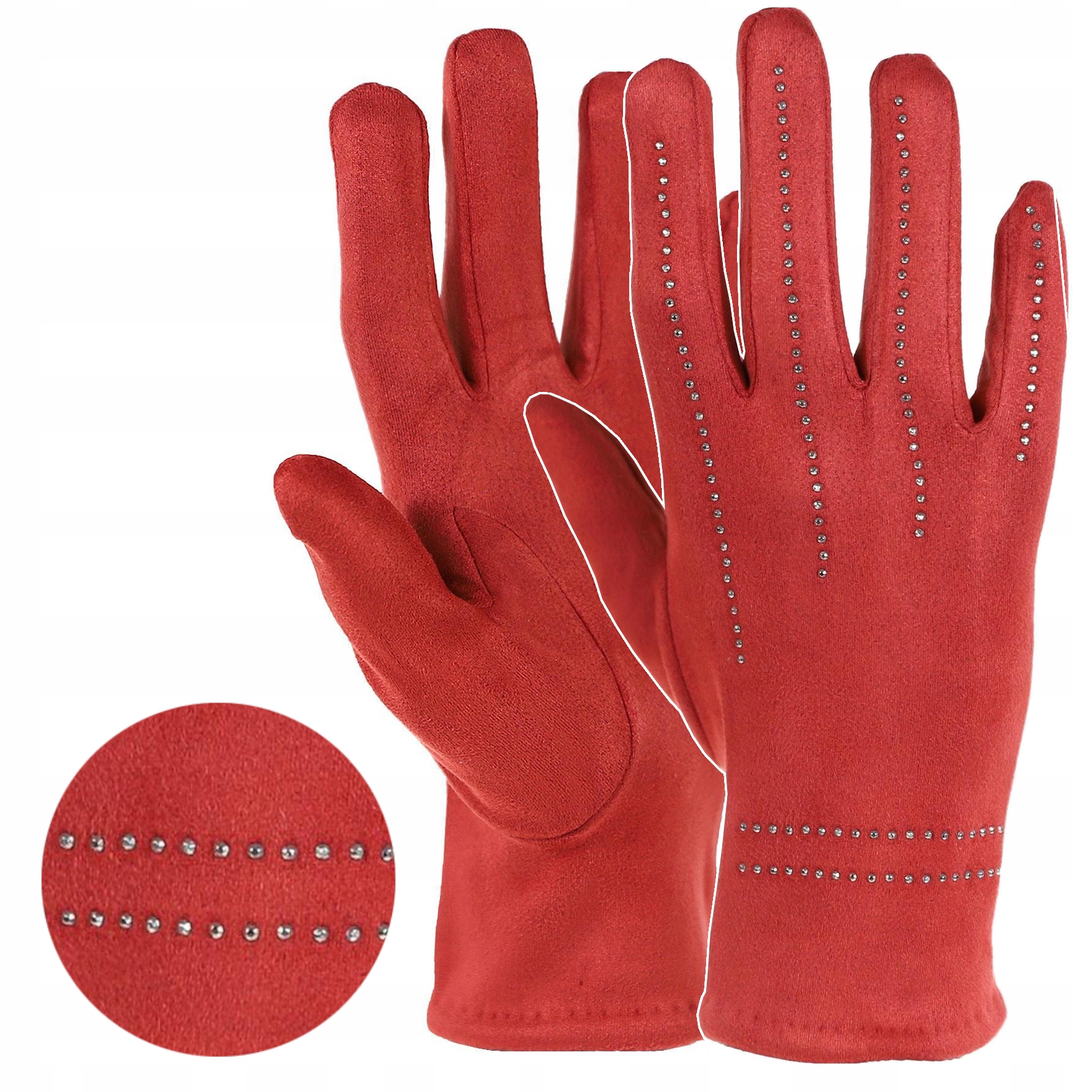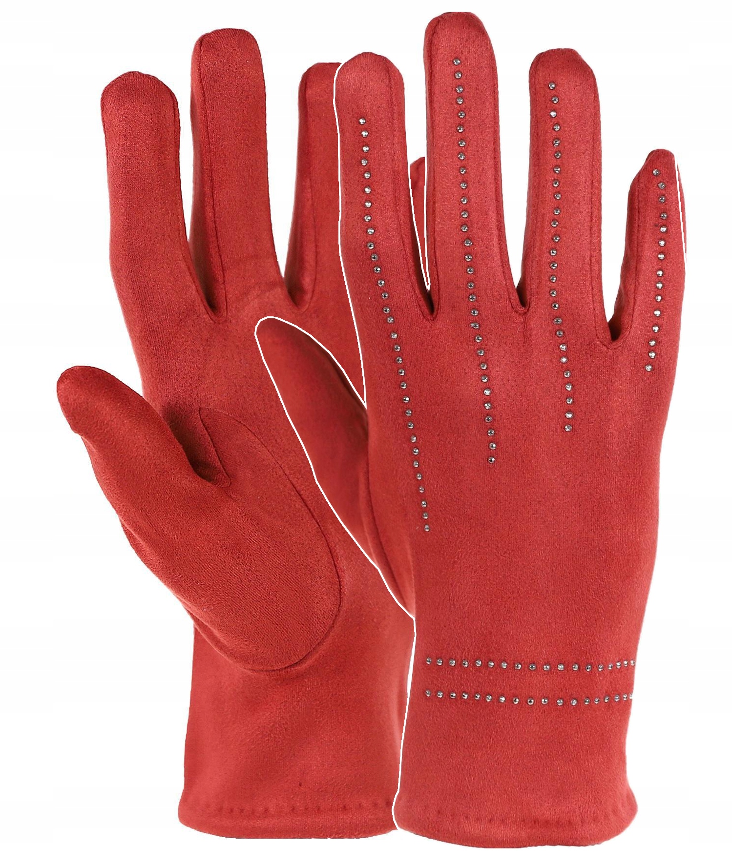 Rękawiczki damskie wykonane z cienkiej dzianiny. Sprawdzą się znakomicie w okresie jesienno-zimowym. Skutecznie ochronią dłonie podczas mroźnych dni. Są przyjemne w dotyku, a elastyczny materiał nie krępuje ruchów. Model zdobiony jest drobnymi diamencikami. Materiał przypomina zamsz.