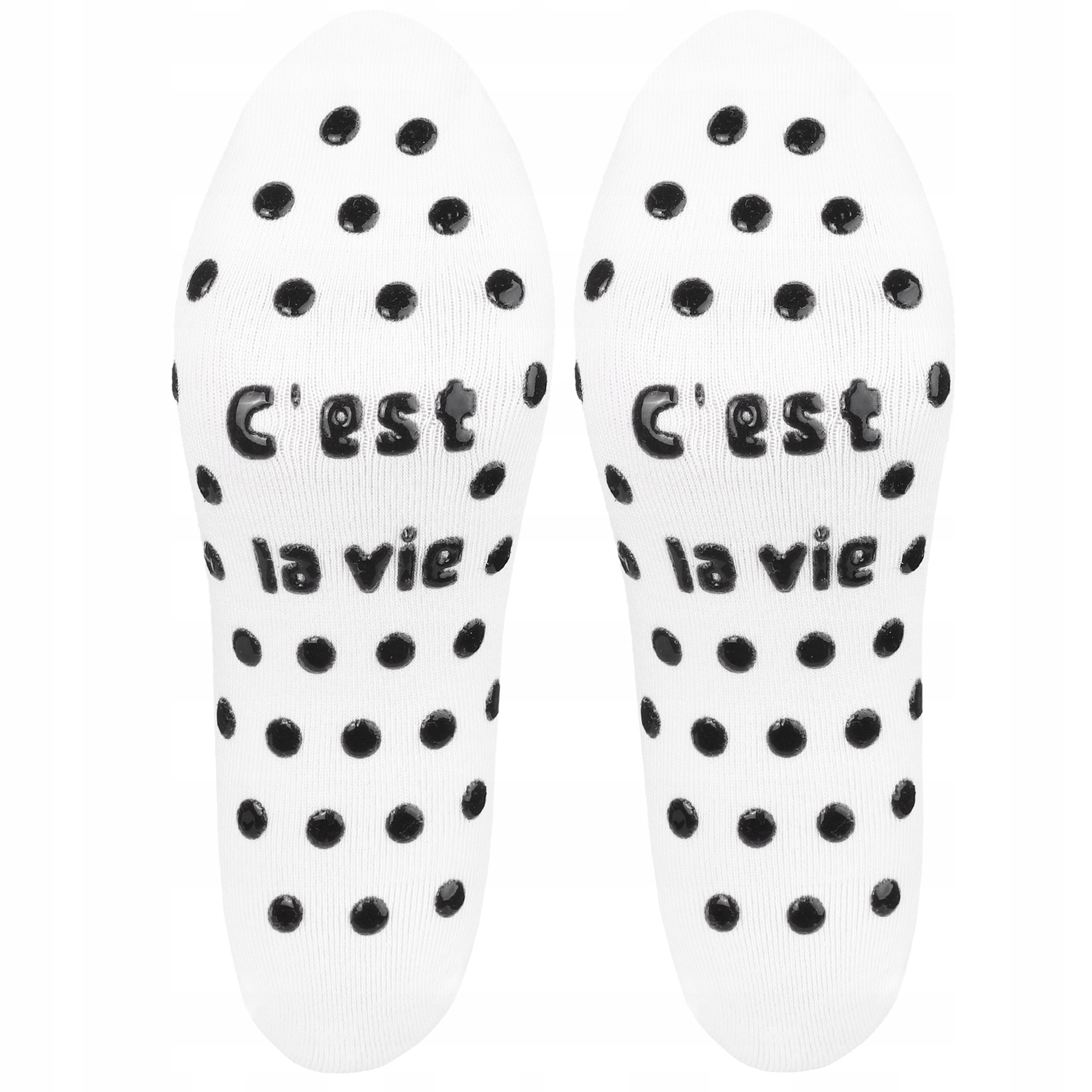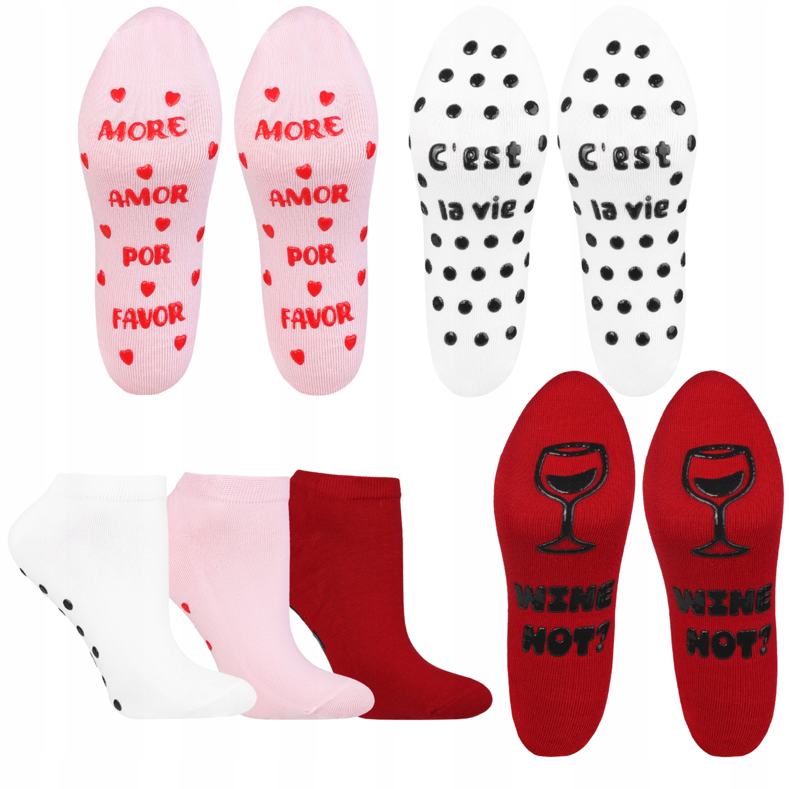 Postaw na wygodę i styl z kolorowymi damskimi stopkami MORAJ z antypoślizgowym spodem (ABS). Zestaw 3 par w radosnych kolorach i z zabawnymi napisami to idealny wybór do chodzenia po domu – bez ryzyka poślizgu.