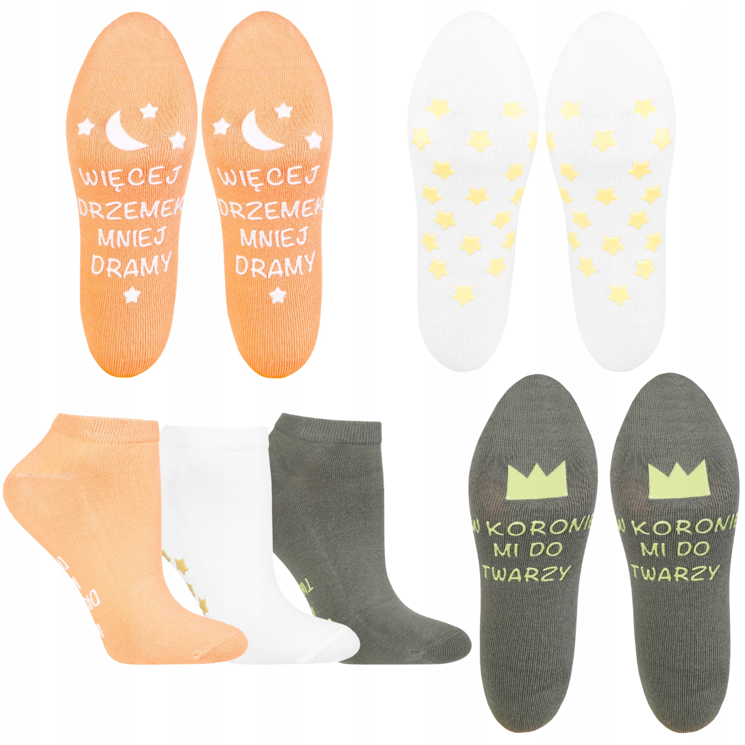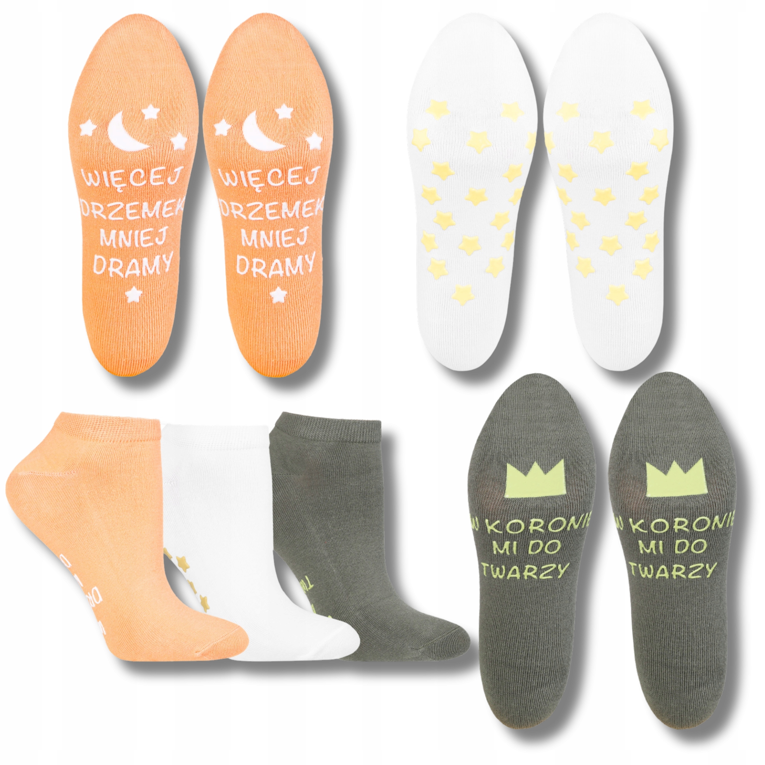 Postaw na wygodę i styl z kolorowymi damskimi stopkami MORAJ z antypoślizgowym spodem (ABS). Zestaw 3 par w radosnych kolorach i z zabawnymi napisami to idealny wybór do chodzenia po domu – bez ryzyka poślizgu.