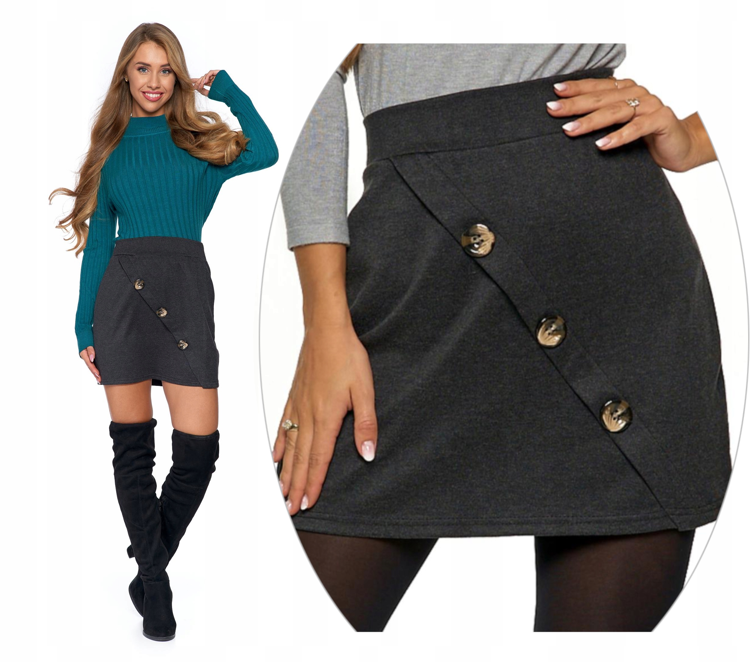 Spódnica damska z asymetryczną zakładką z trzema guzikami z przodu, która nadaje ciekawego wyglądu. Materiał z którego została wykonana jest ciepły oraz elastyczny zapewniając ciepło w chłodne dni. Idealna jako część biurowego outfitu jak i wyjścia na miasto. Tył spódnicy jest gładki, bez żadnych zdobień.