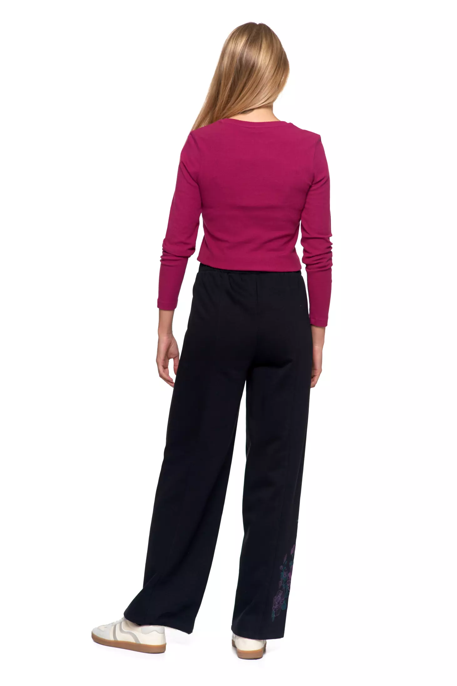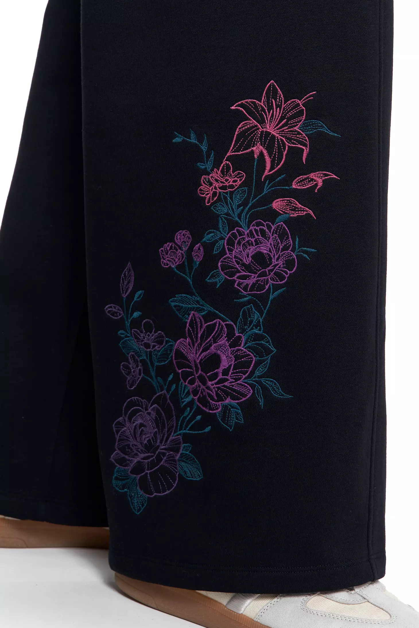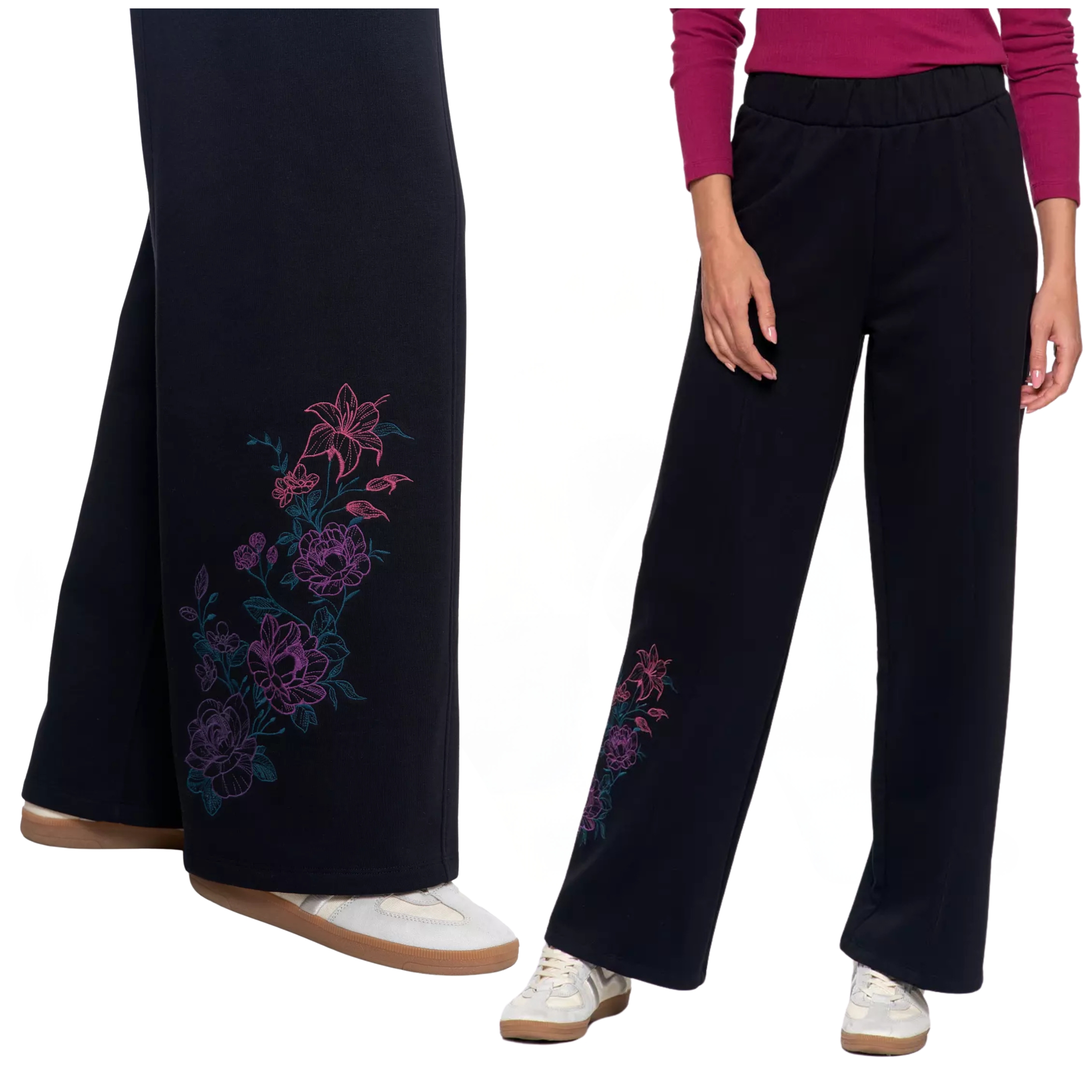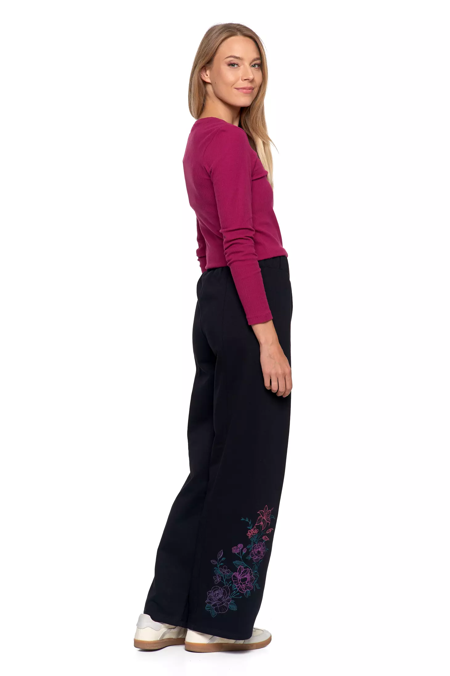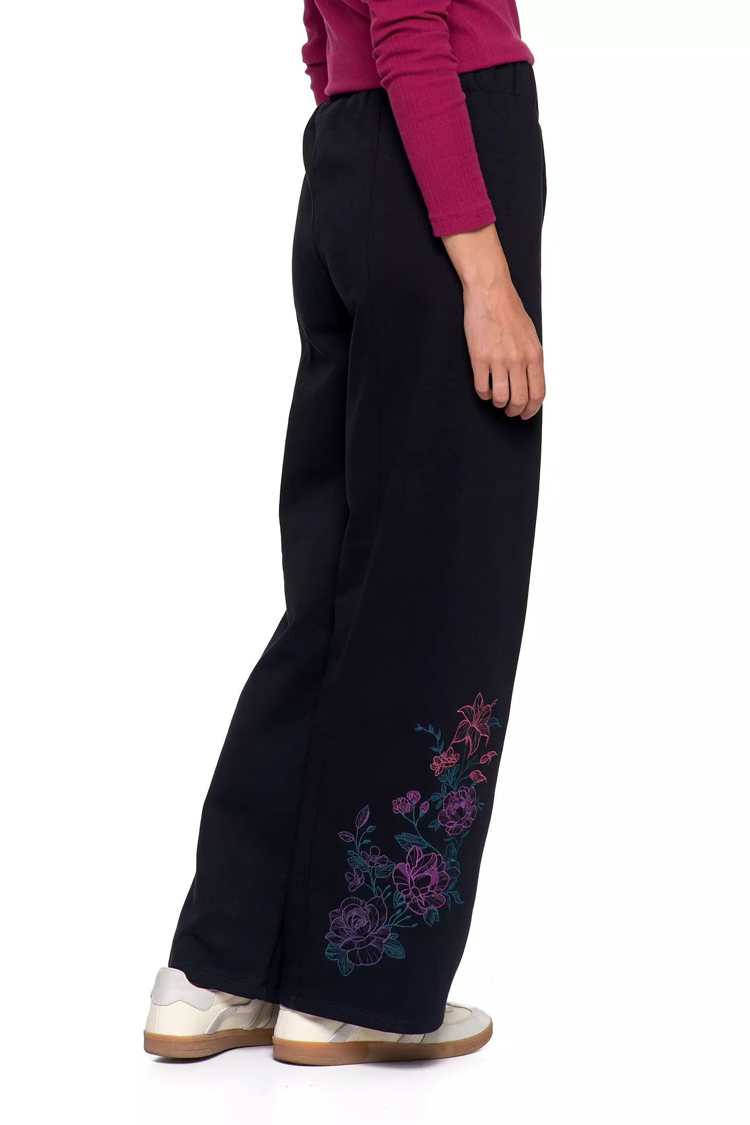 SPODNIE DAMSKIE DRESOWE OCIEPLANE Z SZEROKĄ NOGAWKĄ I HAFTEM MORAJ
