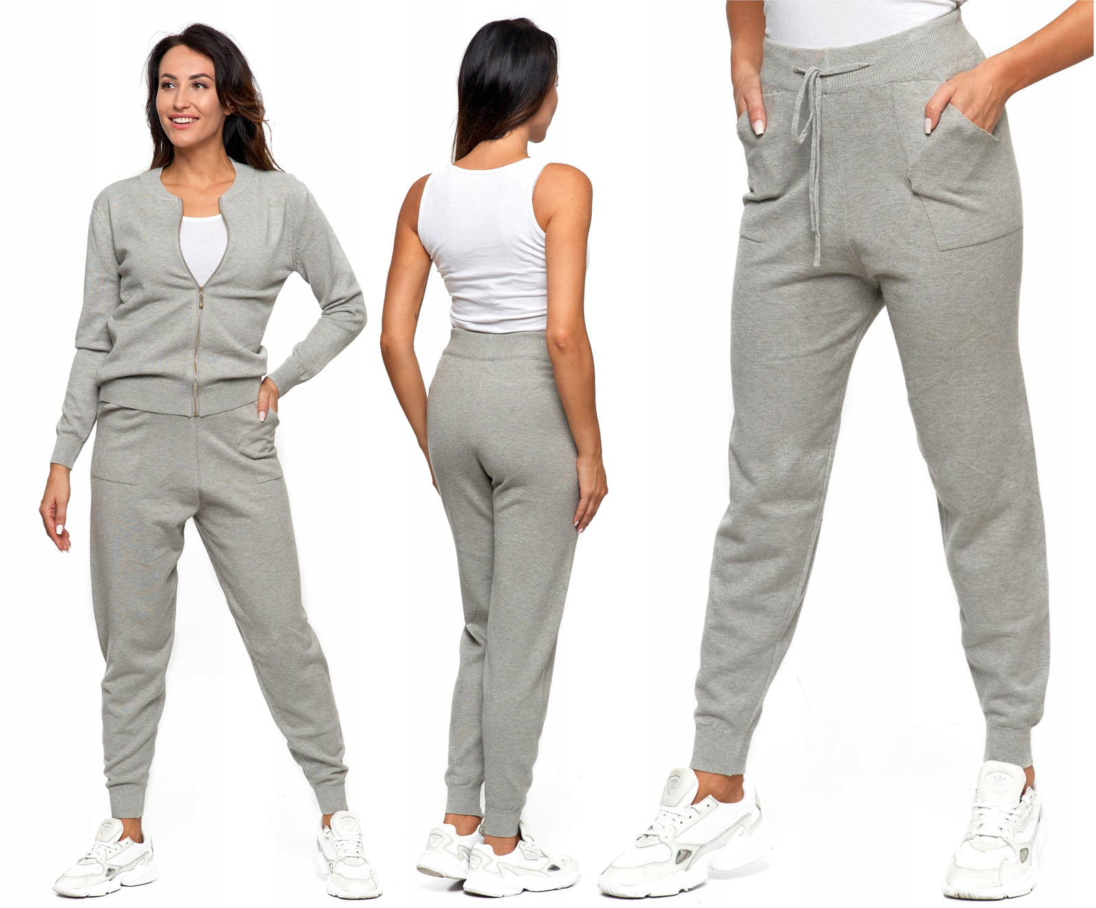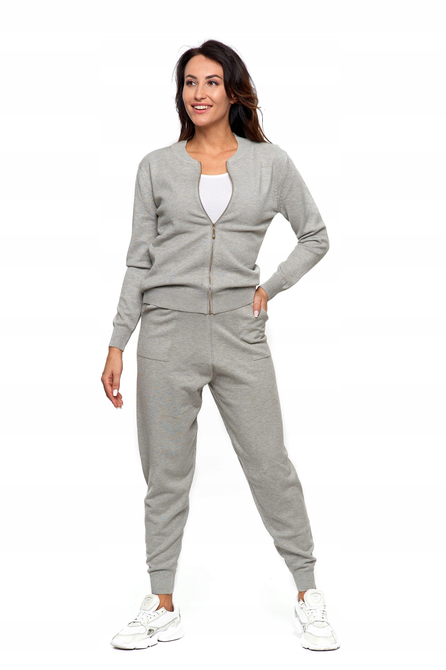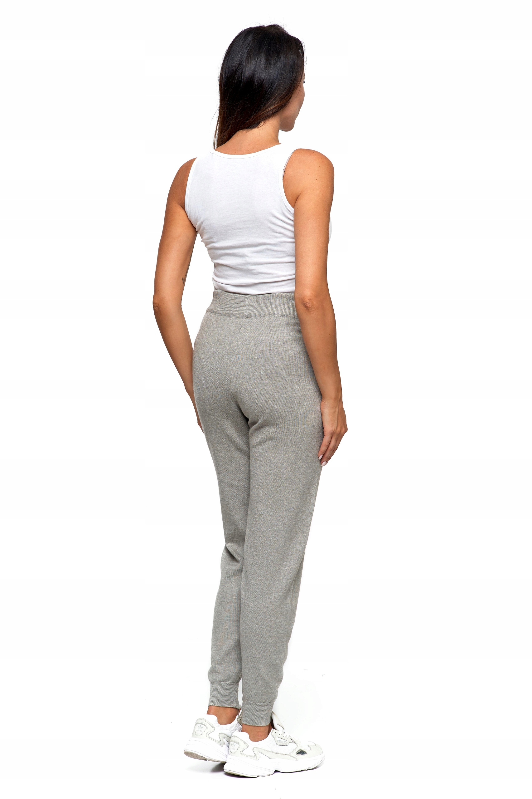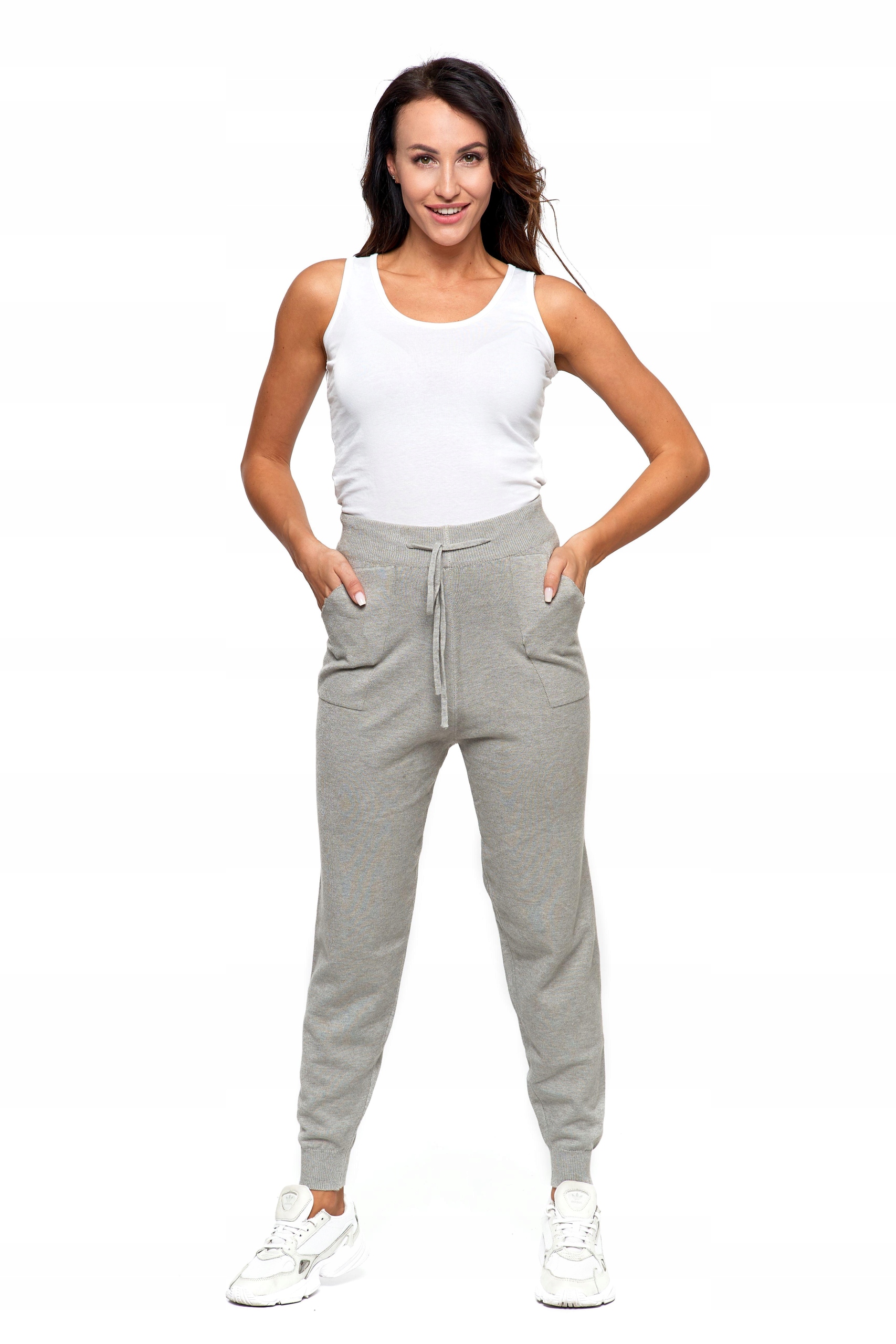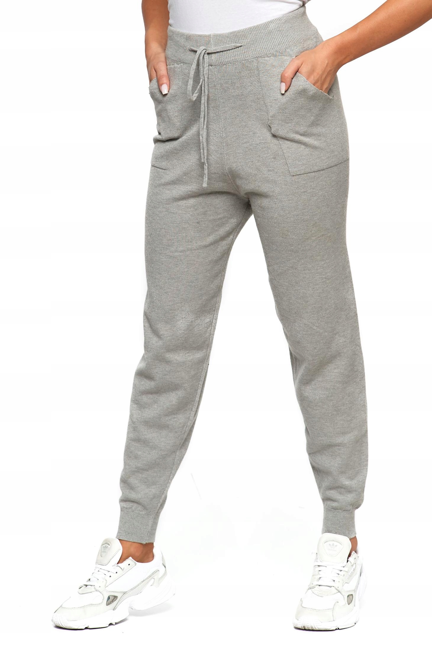 Spodnie damskie dzianinowe z miękkiej, sprężystej dzianiny. Zakończone są elastycznym ściągaczem. Prezentowany model spodni jest świetnym przykładem sportowej elegancji.