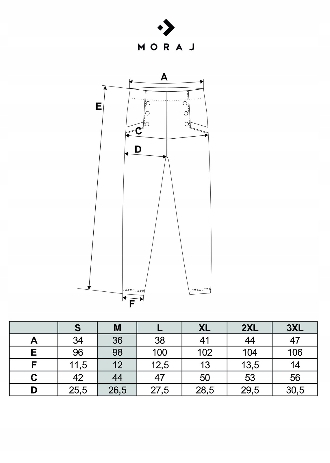Rozmiar | SZEROKOŚĆ W PASIE | DŁUGOŚĆ CAŁKOWITA | SZEROKOŚĆ W BIODRACH | SZEROKOŚĆ NOGAWKI W UDACH | SZEROKOŚĆ NOGAWKI |