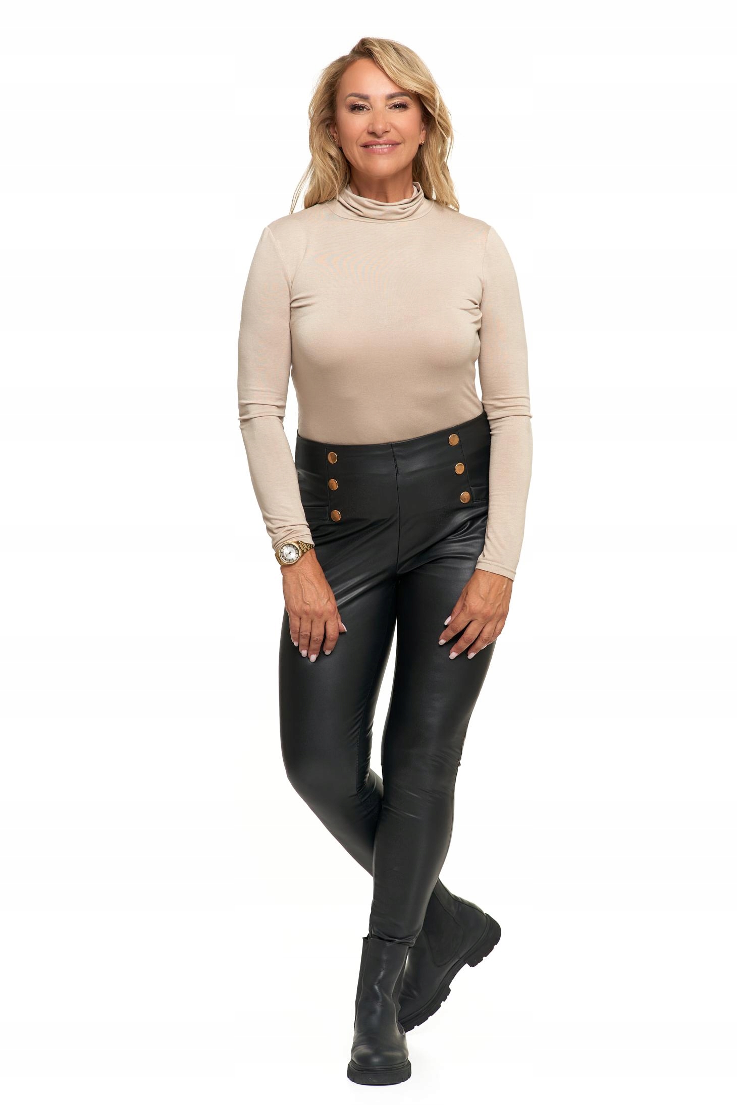 Spodnie są wykonane z imitacji skóry, która jest niezywkle wygodna i elegancka. Spodnie mają przylegający fason, który pasuje zarówno do formalnych, jak i nieco bardziej swobodnych okazji. Idealne na spotkania biznesowe, wieczorne kolacje czy specjalne wydarzenia. Dzięki starannej konstrukcji spodnie doskonale dopasowują się do sylwetki, zapewniając wygodę przez cały dzień. Spodnie posiadają elastyczną gumę w pasie oraz wysoki stan.