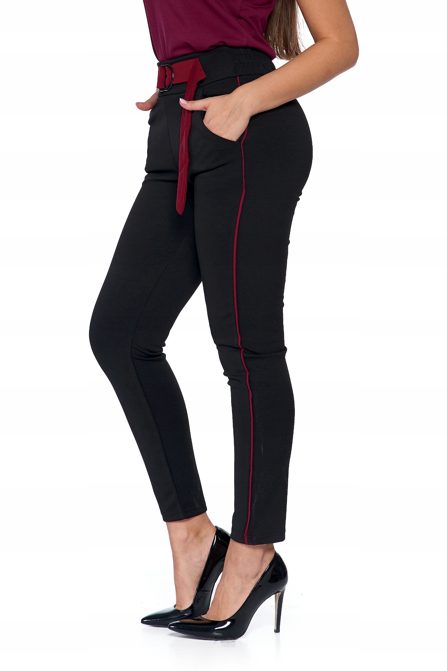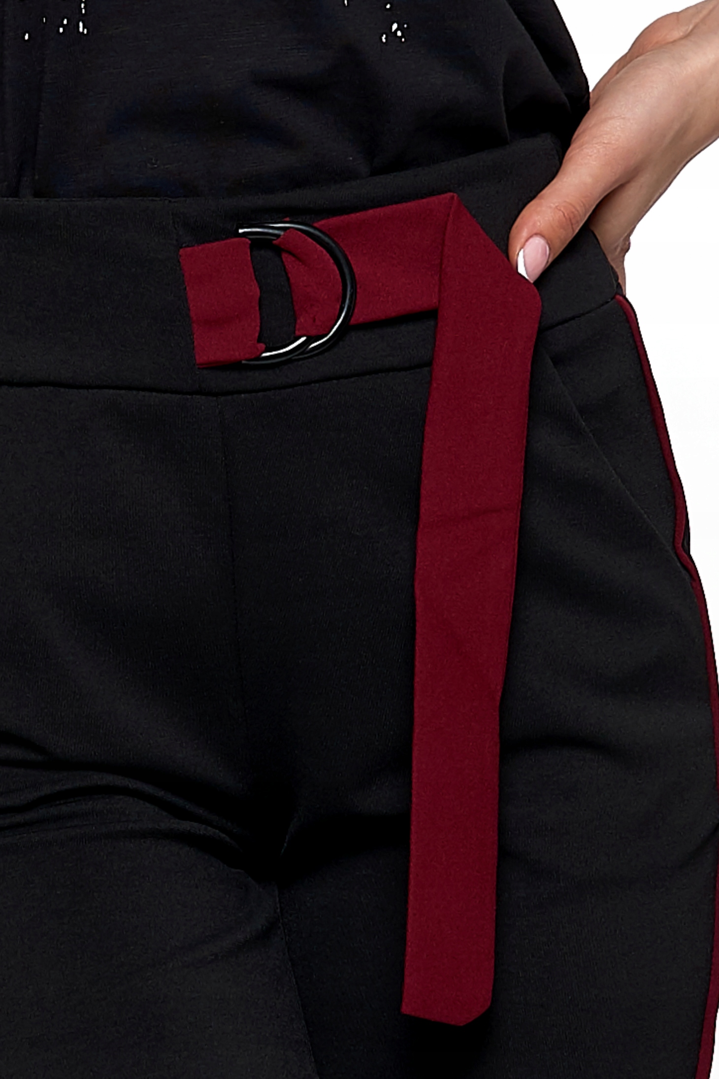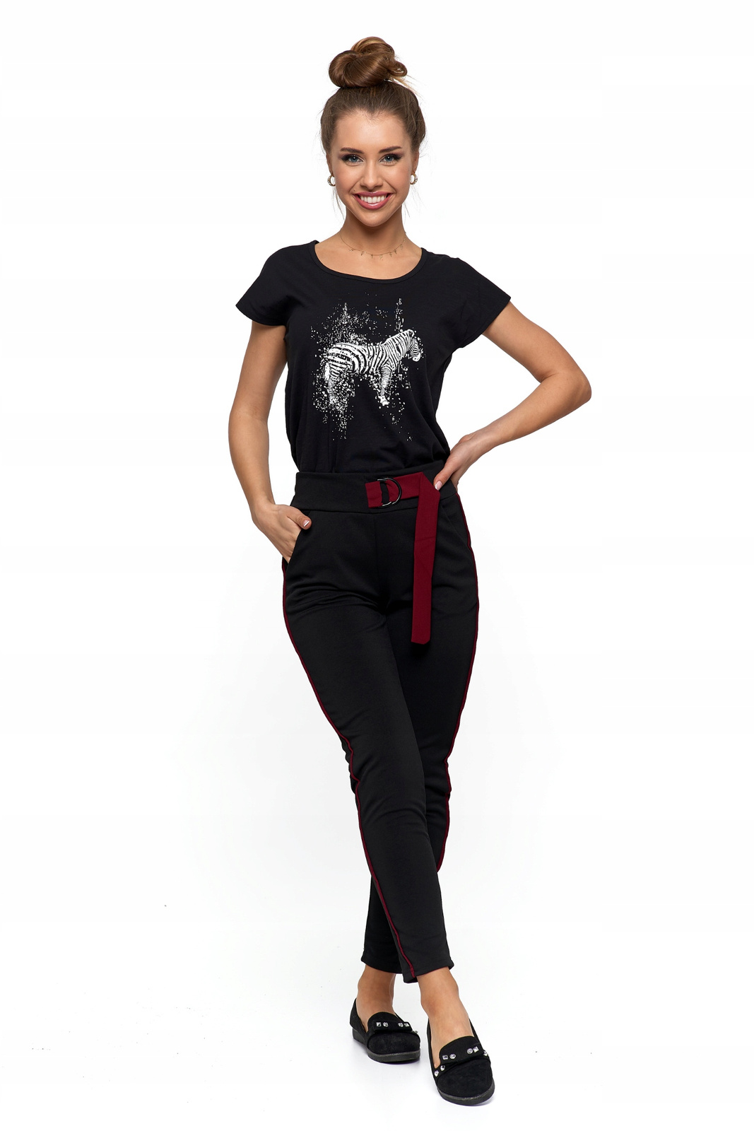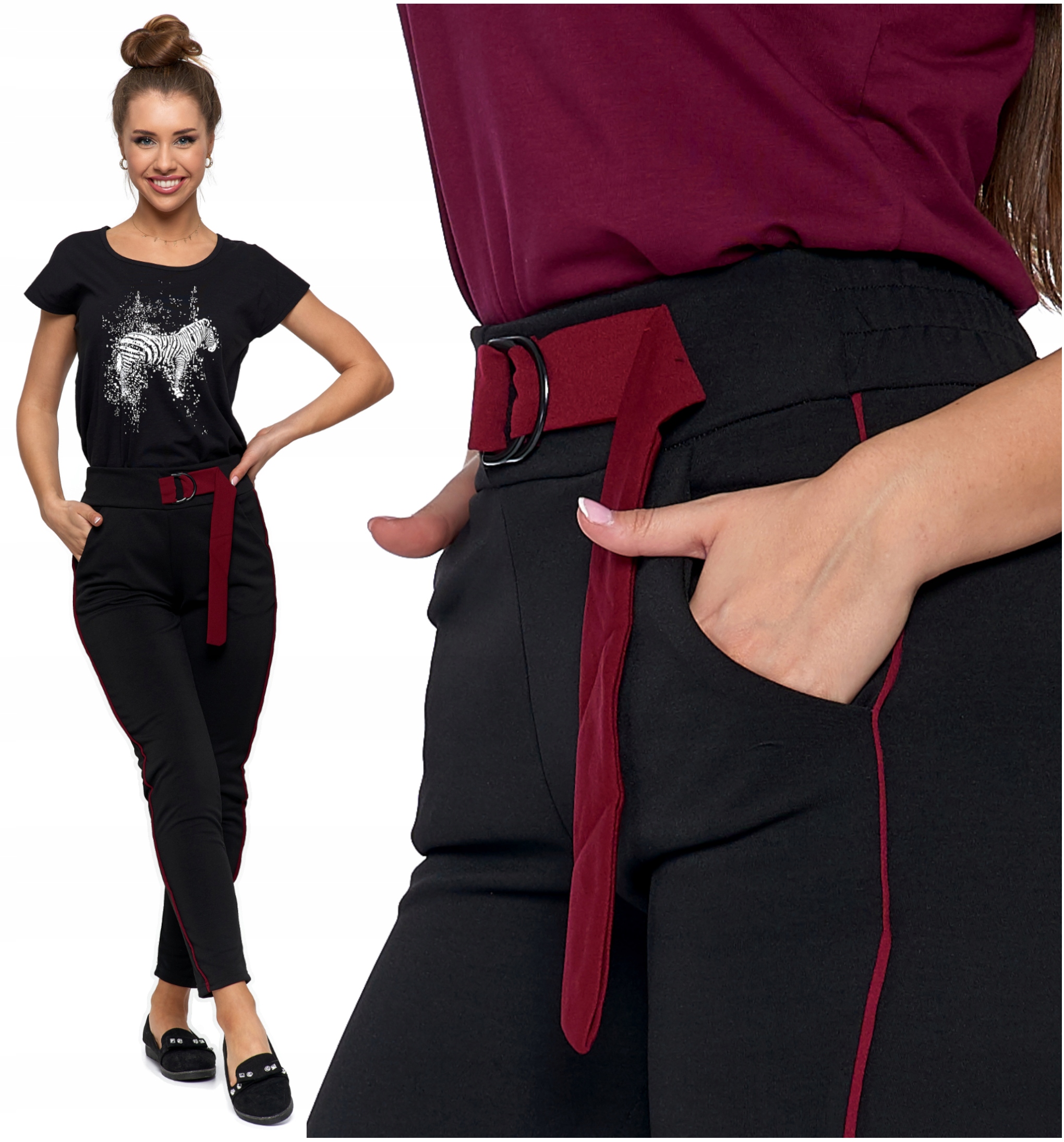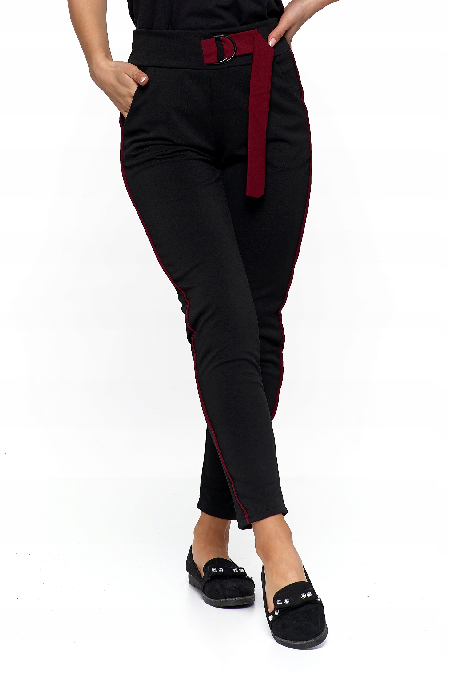 SPODNIE DAMSKIE z Ozdobnym Bordowym Paskiem Czarne Modne MORAJ