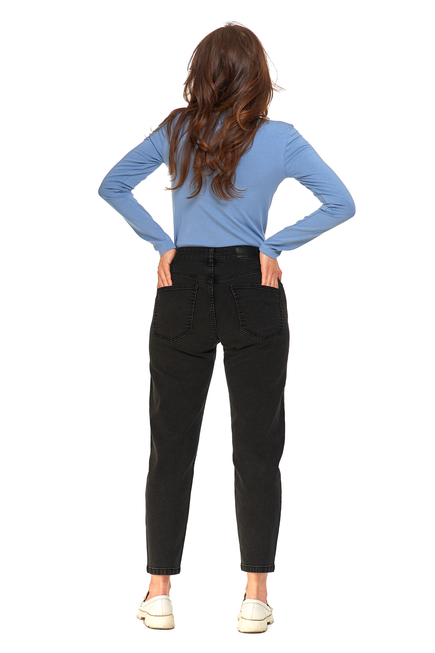 Krój mom fit charakteryzuje się luźniejszymi nogawkami, które zwężają się ku dołowi, podkreślając talię i nadając sylwetce stylowy wygląd. Spodnie posiadają 5 funkcjonalnych kieszeni, w tym małą kieszonkę na drobiazgi. Zapięcie na zamek błyskawiczny zapewnia łatwe zakładanie i zdejmowanie, a ich klasyczny, nieco wyższy stan doskonale wpisuje się w modowe trendy. Materiał z bawełny z elastanem sprawia, że spodnie są nie tylko wytrzymałe, ale i elastyczne, co zwiększa komfort noszenia na co dzień.