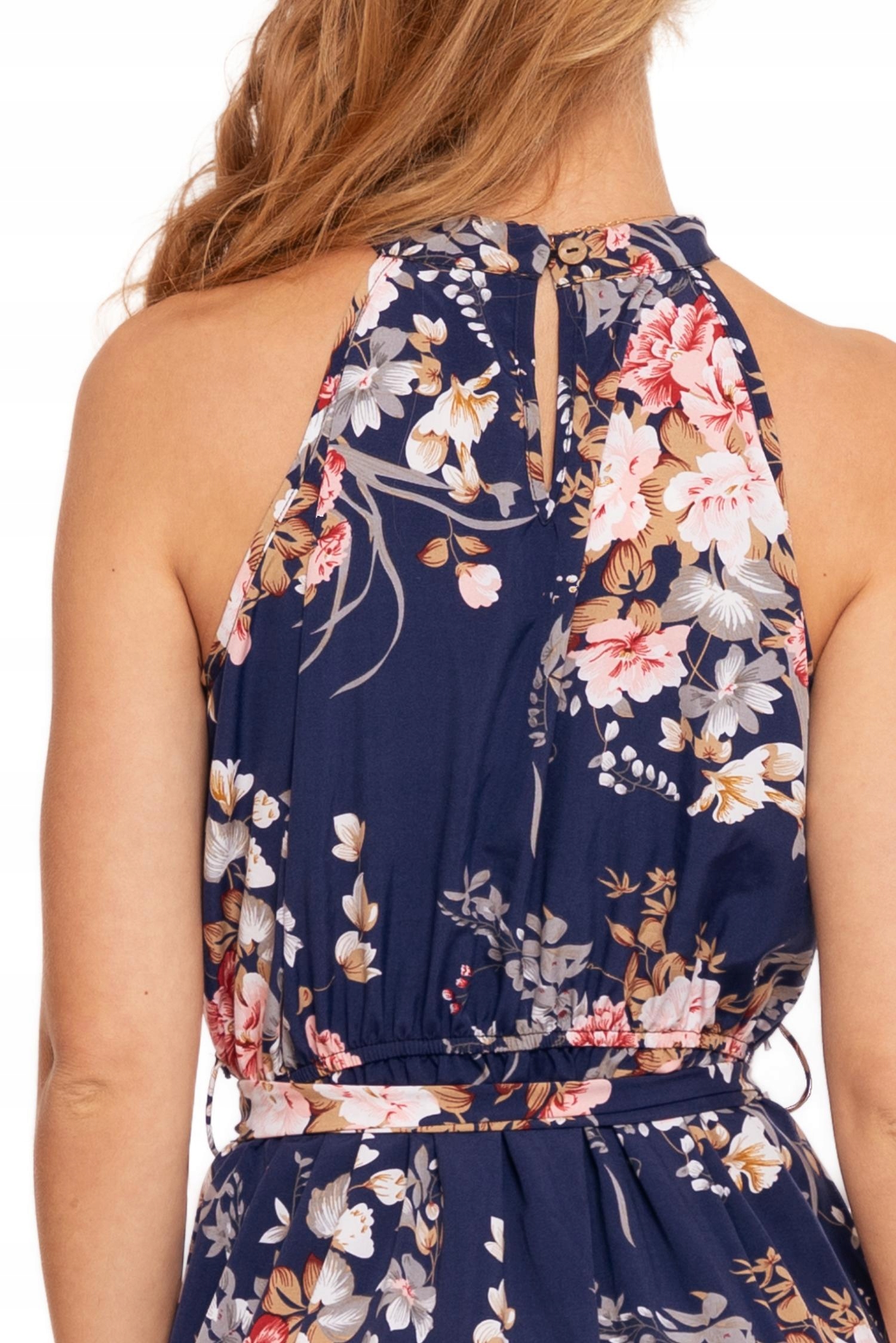 Odkryj urok letnich dni w tej zwiewnej sukience maxi. Projekt bez rękawów jest doskonałym wyborem na ciepłe, słoneczne dni. Delikatna stójka i subtelne zapięcie na guziczek z tyłu nadają jej wyrafinowanego charakteru, zaś elastyczny dekolt zapewnia wygodę i dopasowanie.