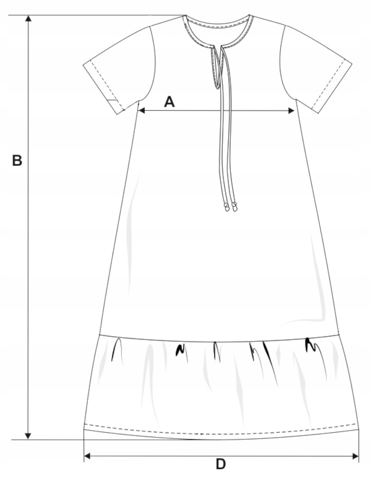 • Sukienka ma krótkie rękawy, które dodają jej lekkości i swobody. Wiązany dekolt z delikatną łezką przyciąga uwagę i nadaje wyrafinowanego charakteru, a jednocześnie umożliwia indywidualne dopasowanie. Falbanka u dołu sukienki to subtelny detal, który dodaje gracji i ruchu przy każdym kroku.