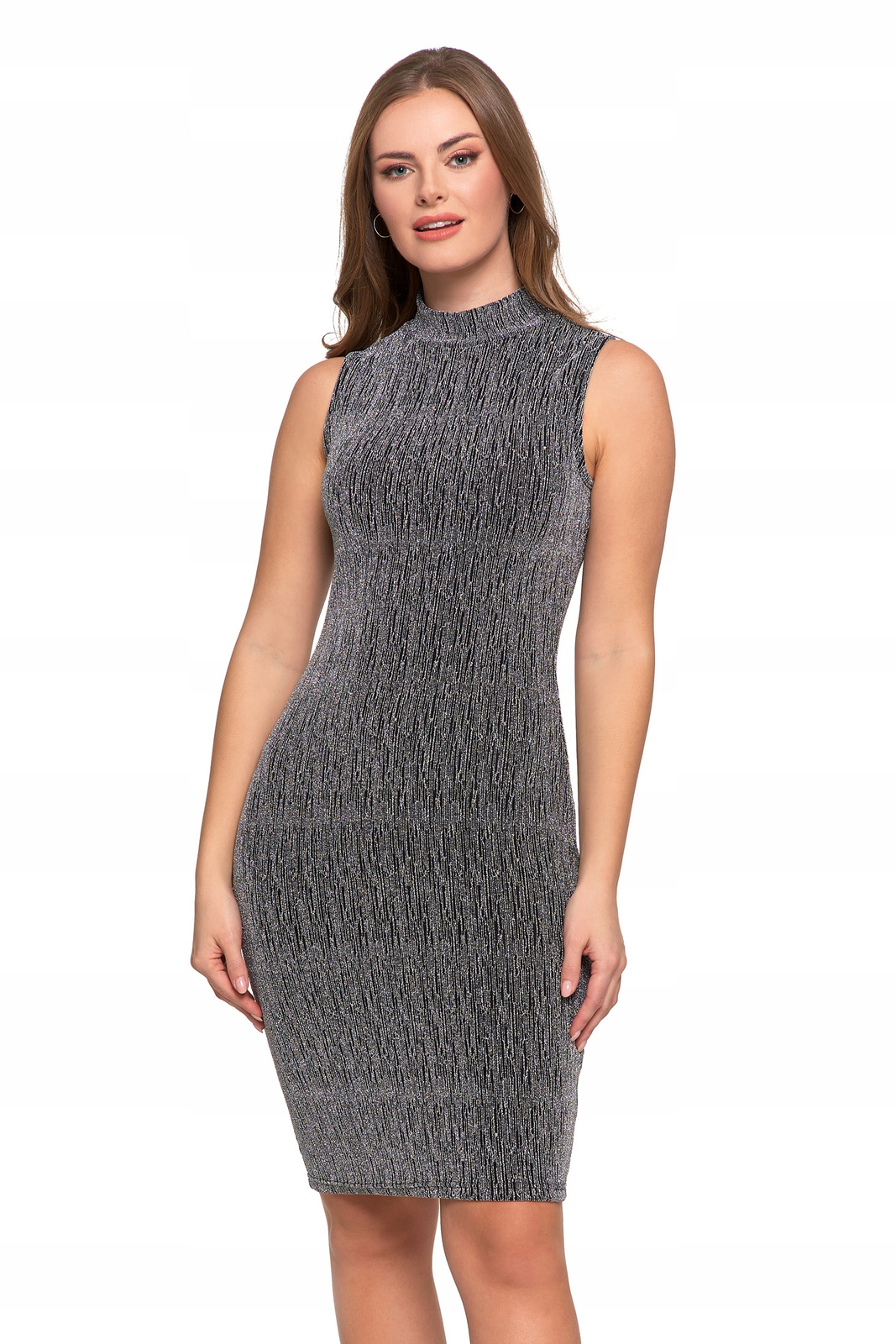 Dopasowany krój pięknie podkreśla sylwetkę, a delikatnie zabudowany półgolf nadaje stylizacji klasy i wyrafinowania. Brak rękawów czyni ją idealnym wyborem na wieczorne wyjścia, zapewniając komfort i swobodę ruchów. Materiał z subtelnym srebrzystym blaskiem dodaje kreacji luksusowego charakteru, czyniąc ją doskonałym wyborem na takie okazje jak Sylwester, święta, koktajlowe przyjęcia, imprezy rodzinne czy wieczorne kolacje.