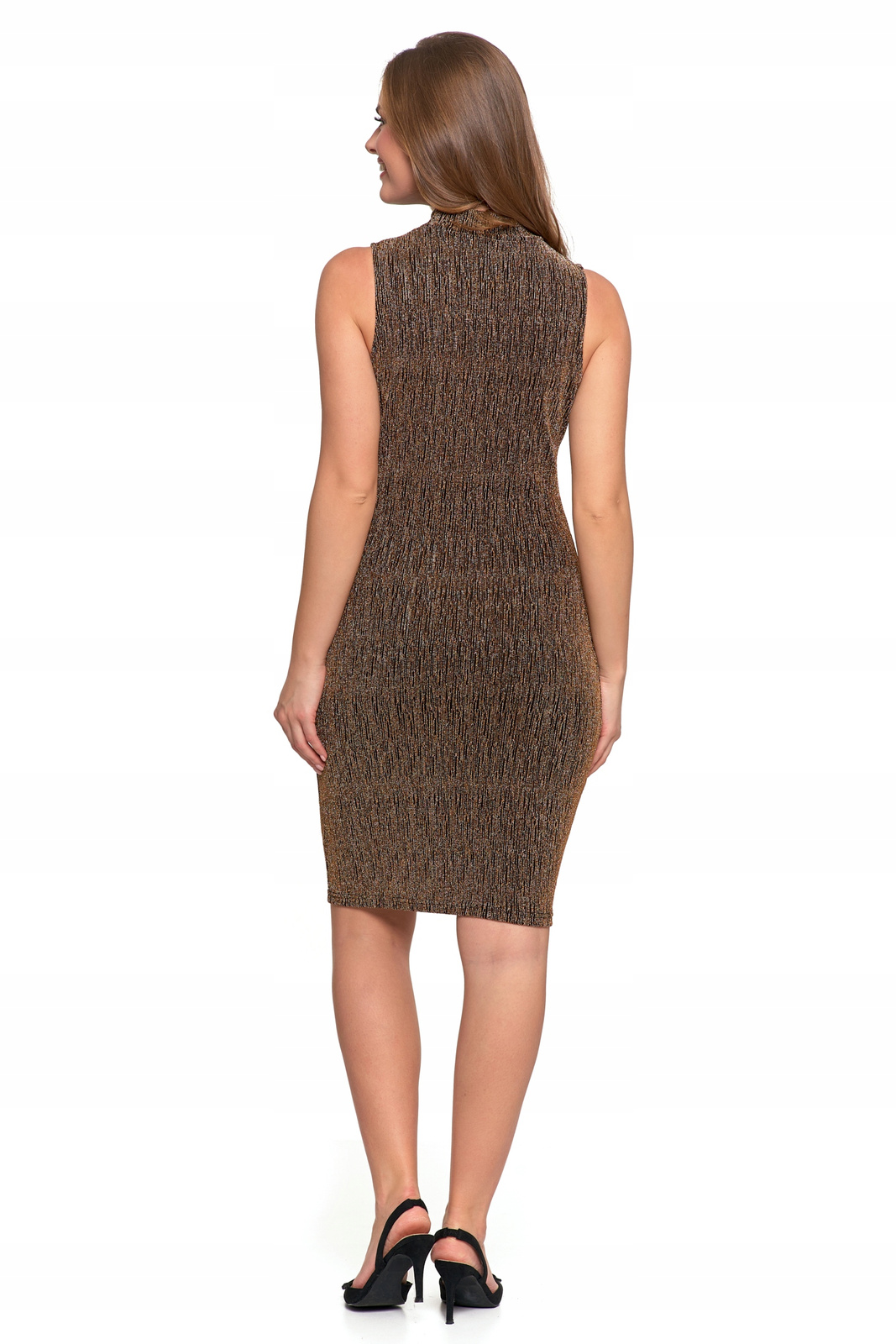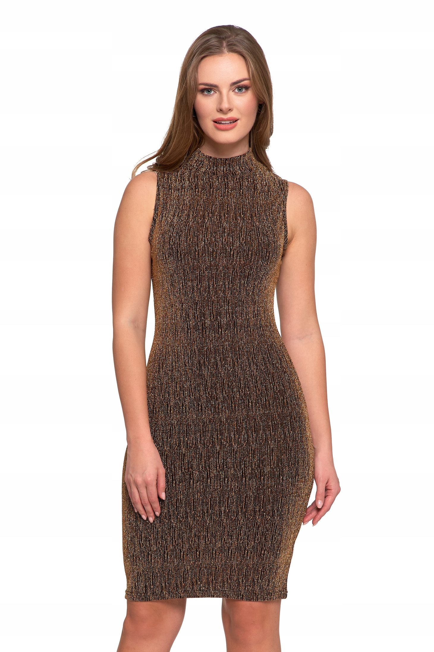 Dopasowany krój pięknie podkreśla sylwetkę, a delikatnie zabudowany półgolf nadaje stylizacji klasy i wyrafinowania. Brak rękawów czyni ją idealnym wyborem na wieczorne wyjścia, zapewniając komfort i swobodę ruchów. Materiał z subtelnym srebrzystym blaskiem dodaje kreacji luksusowego charakteru, czyniąc ją doskonałym wyborem na takie okazje jak Sylwester, święta, koktajlowe przyjęcia, imprezy rodzinne czy wieczorne kolacje.