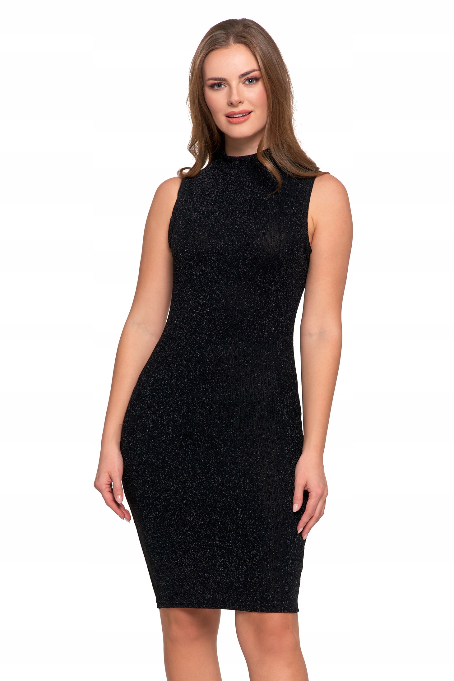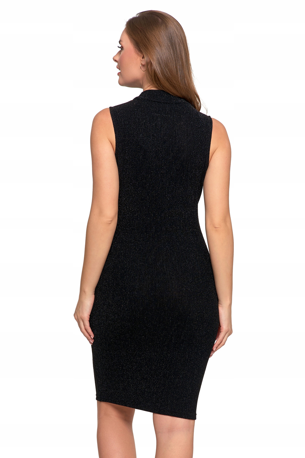 Dopasowany krój pięknie podkreśla sylwetkę, a delikatnie zabudowany półgolf nadaje stylizacji klasy i wyrafinowania. Brak rękawów czyni ją idealnym wyborem na wieczorne wyjścia, zapewniając komfort i swobodę ruchów. Materiał z subtelnym srebrzystym blaskiem dodaje kreacji luksusowego charakteru, czyniąc ją doskonałym wyborem na takie okazje jak Sylwester, święta, koktajlowe przyjęcia, imprezy rodzinne czy wieczorne kolacje.