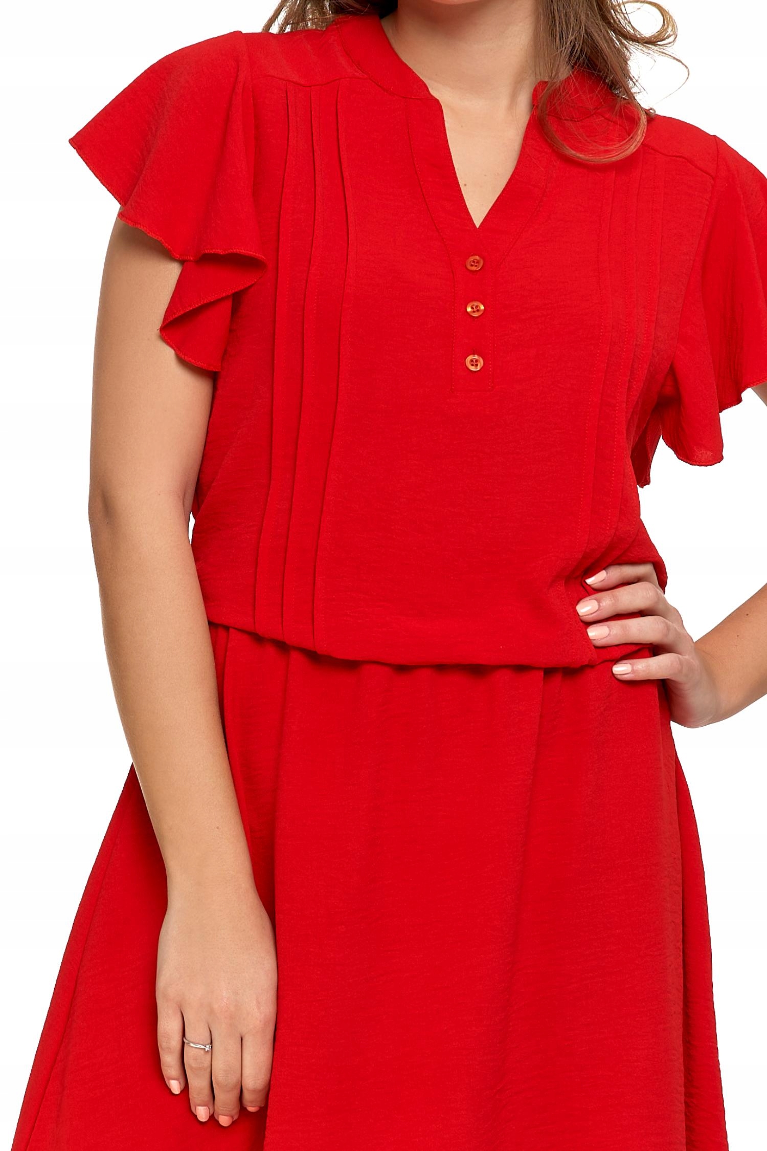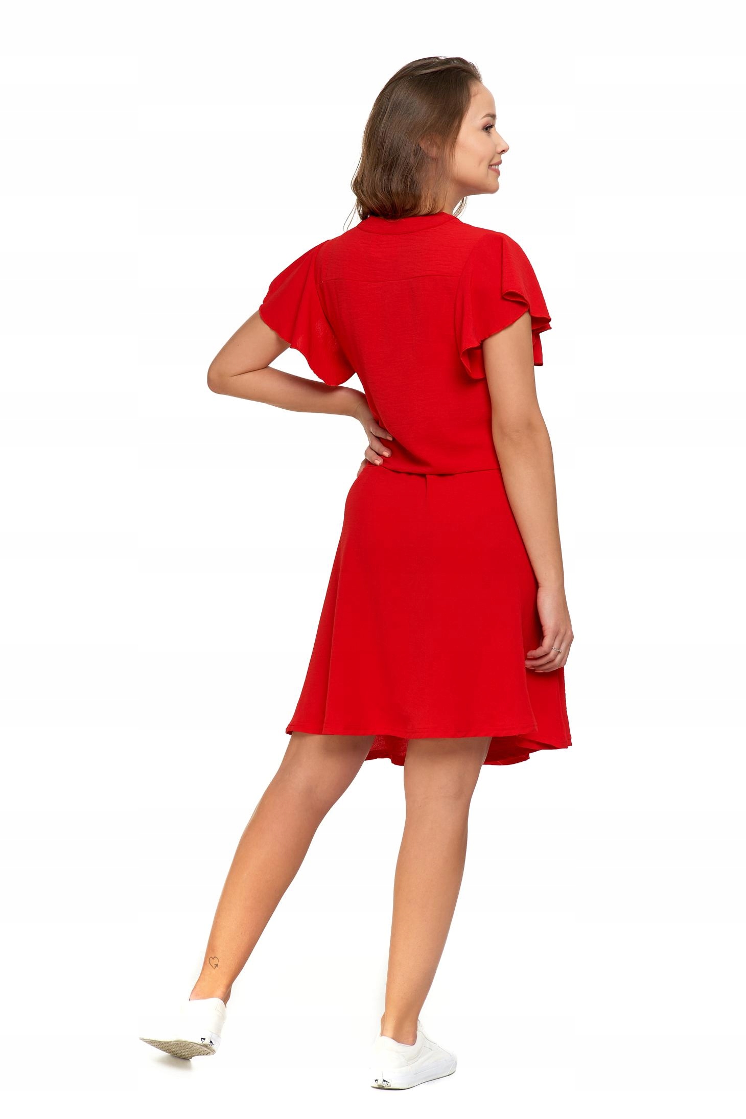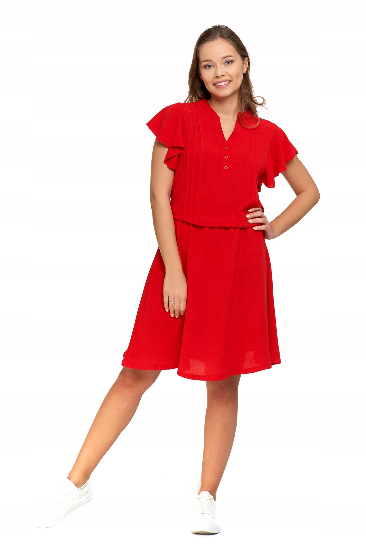Wykonana z lekkiego i przewiewnego materiału, który doskonale sprawdza się w cieplejsze dni, zapewniając komfort i swobodę ruchów. Sukienka ma delikatny, zapinany dekolt i krótkie rękawy w kształcie motylka, które dodają jej subtelności i lekkości. Odcięcie w talii podkreśla kobiecą sylwetkę, nadając sukience elegancki charakter.