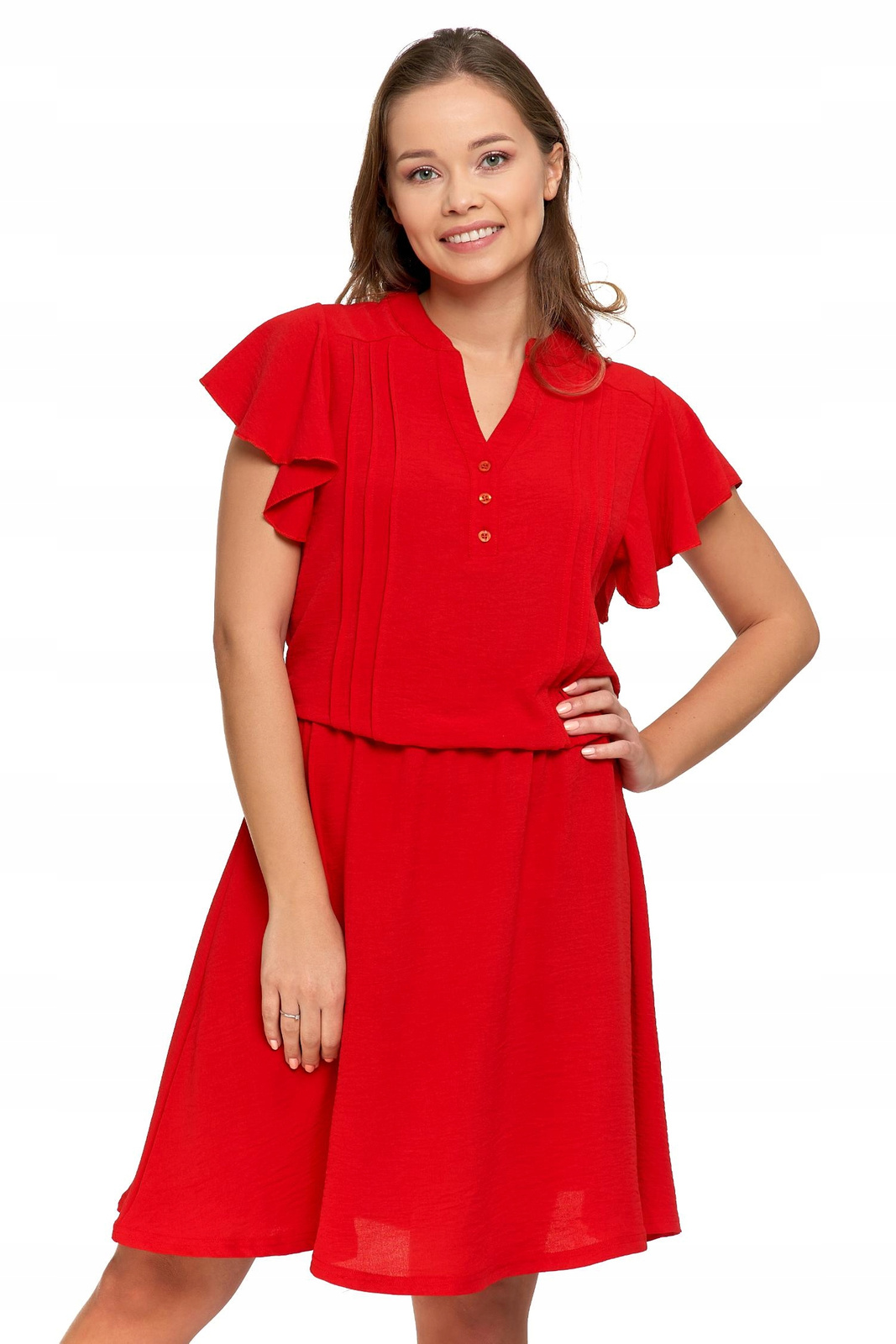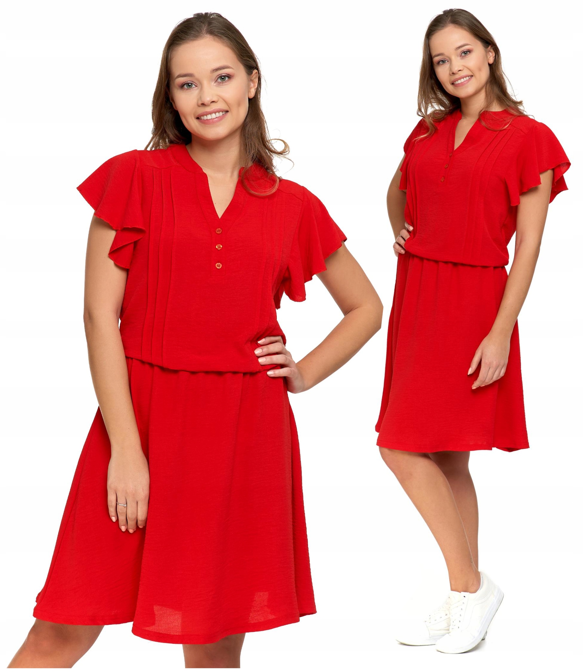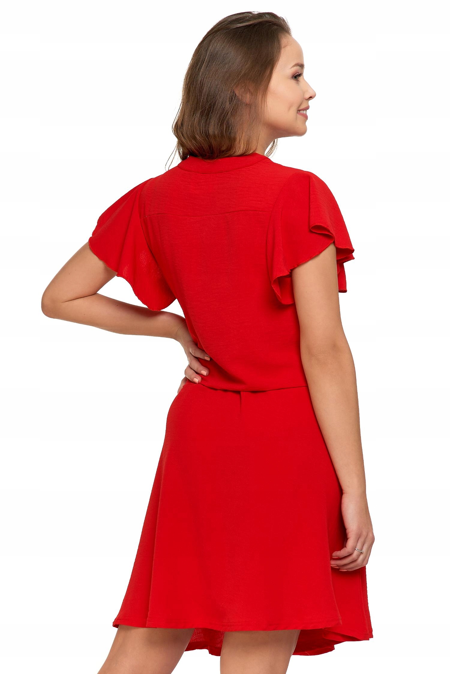 Wykonana z lekkiego i przewiewnego materiału, który doskonale sprawdza się w cieplejsze dni, zapewniając komfort i swobodę ruchów. Sukienka ma delikatny, zapinany dekolt i krótkie rękawy w kształcie motylka, które dodają jej subtelności i lekkości. Odcięcie w talii podkreśla kobiecą sylwetkę, nadając sukience elegancki charakter.