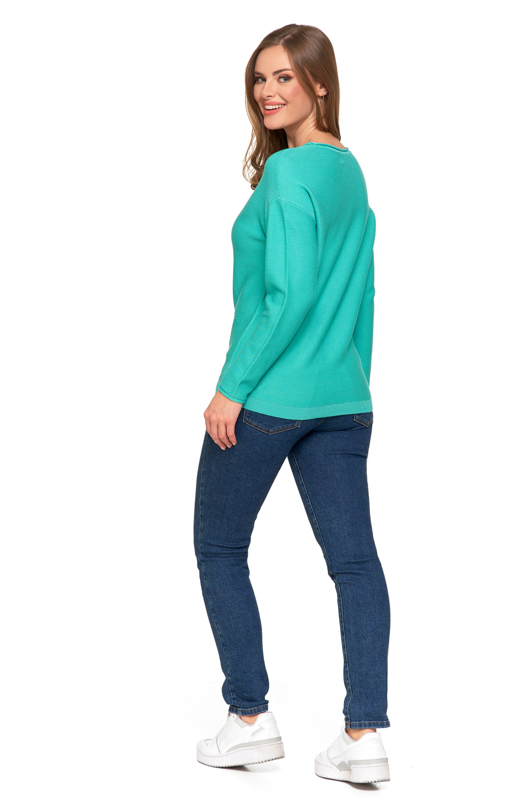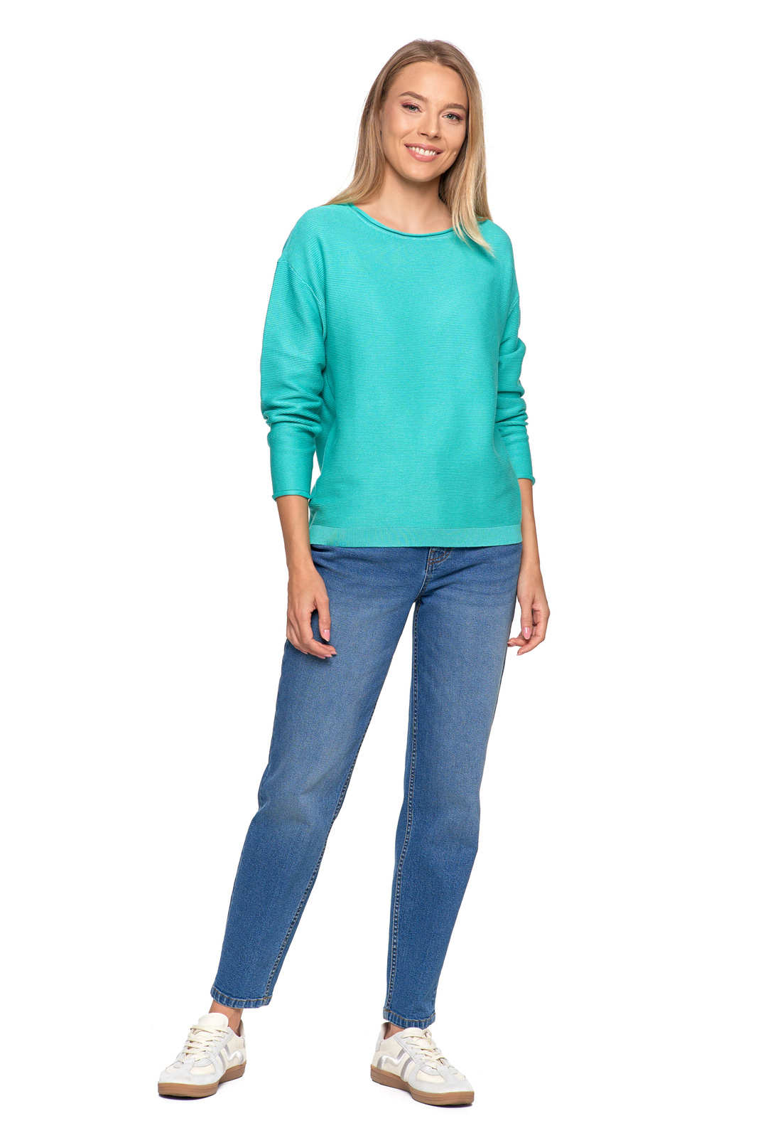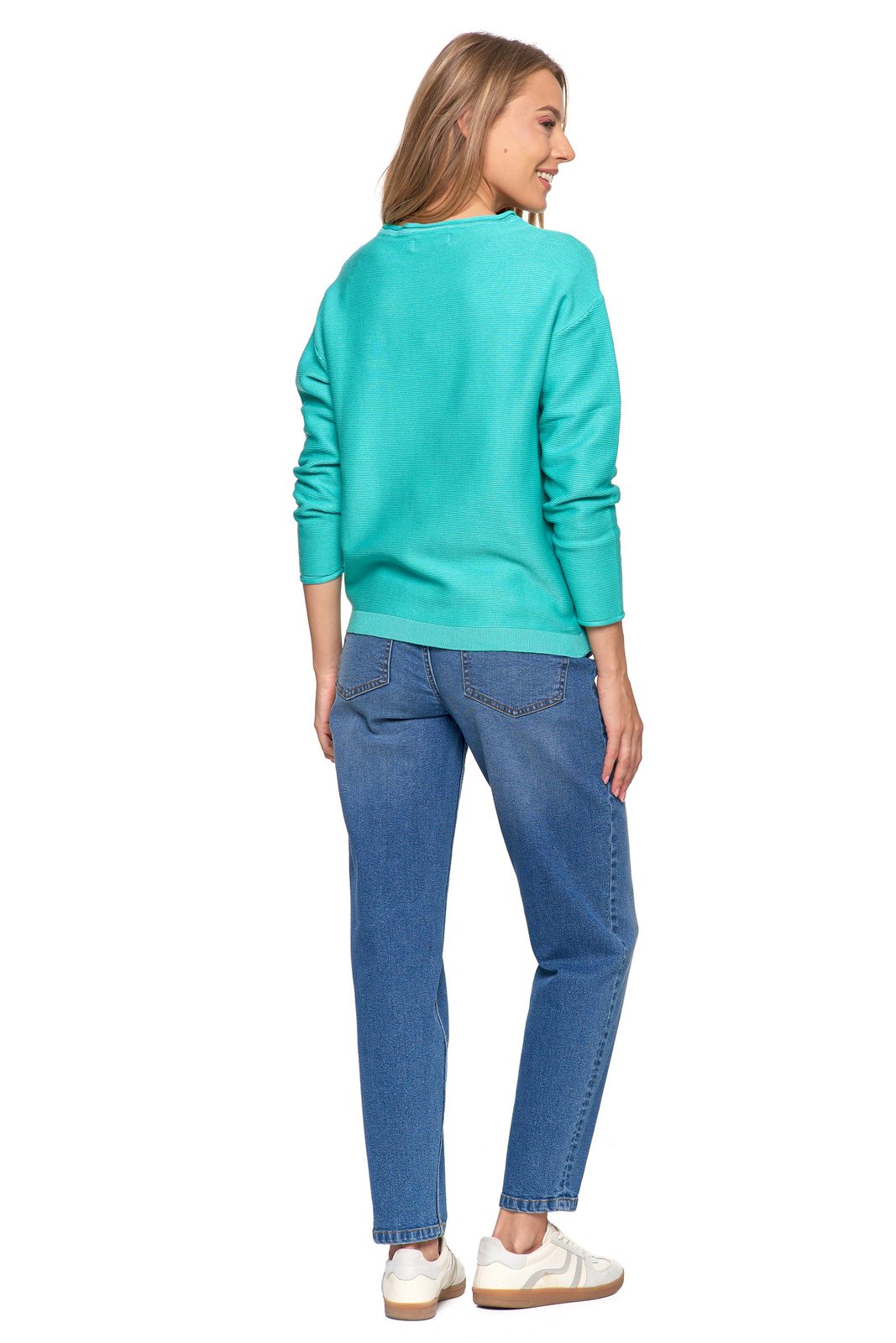 - Klasyczny, okrągły dekolt podkreśla ponadczasowy charakter swetra.