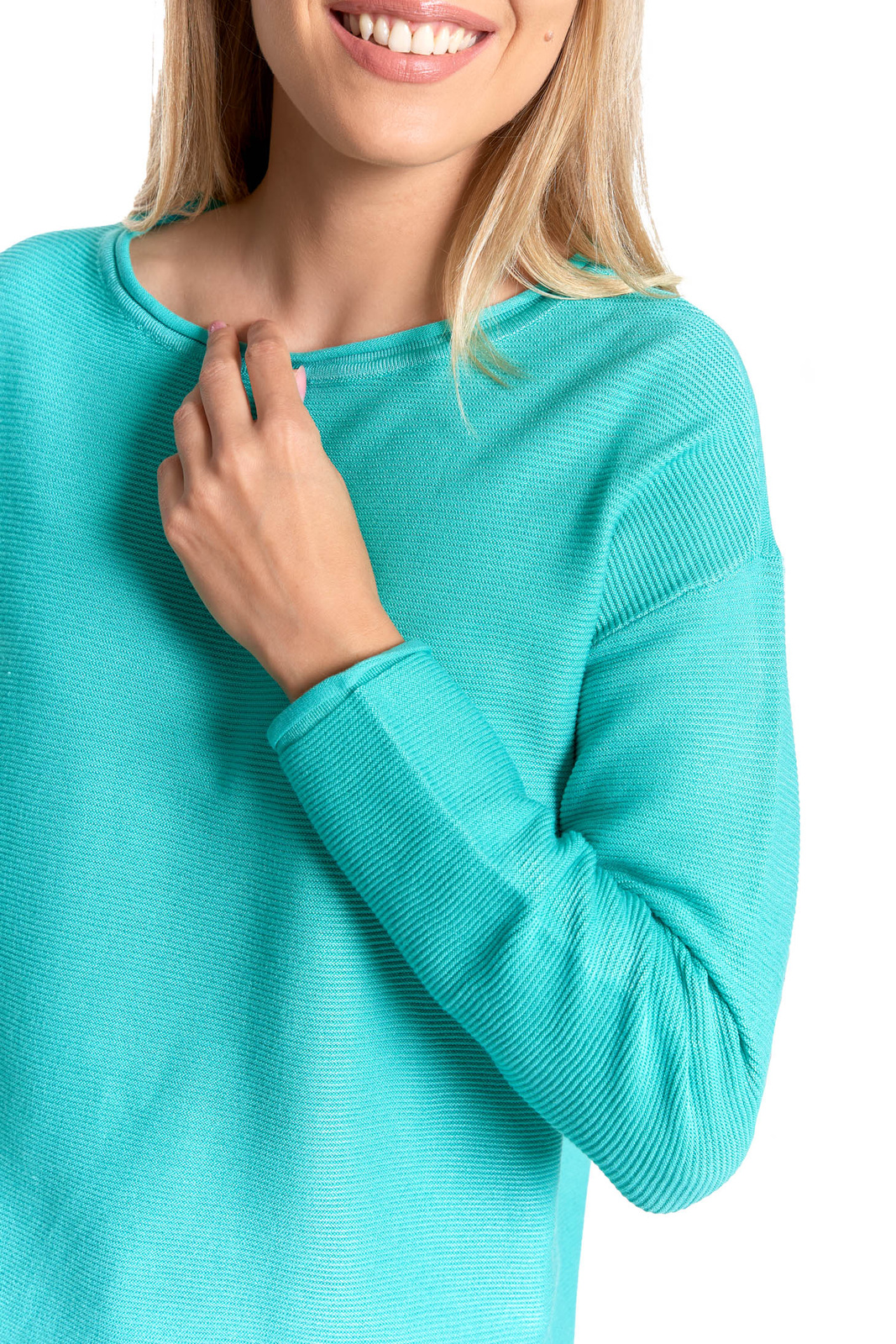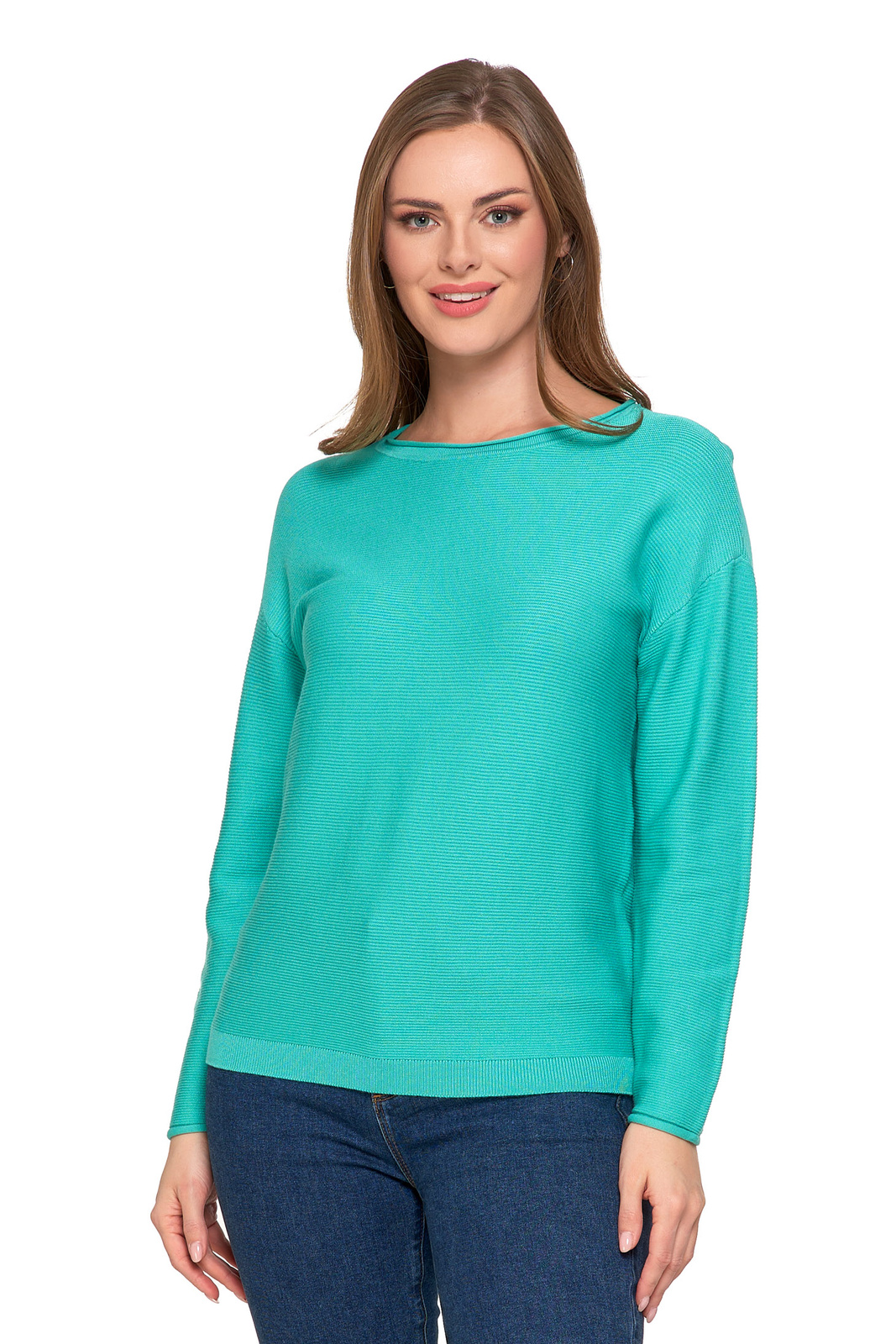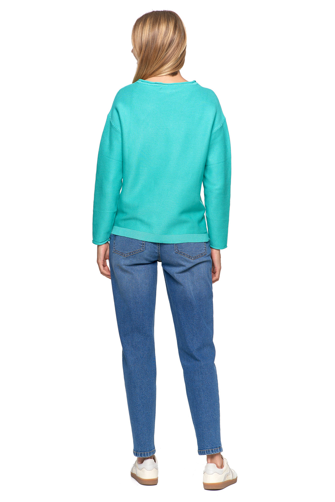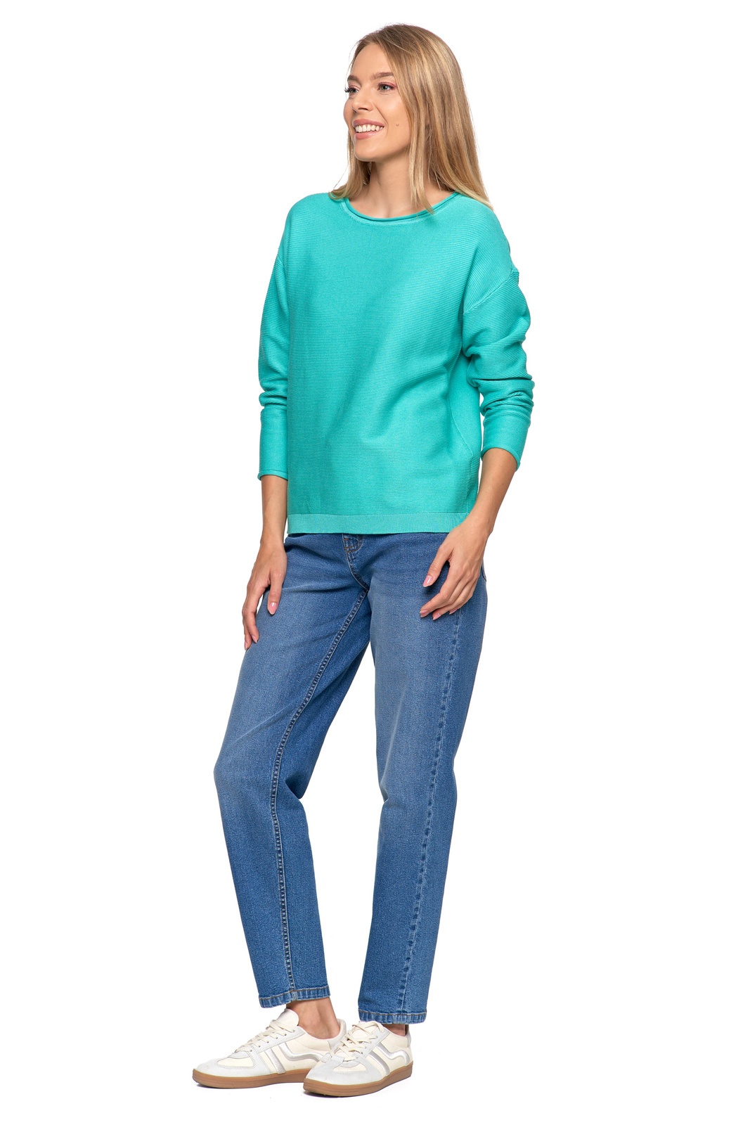 - Klasyczny, okrągły dekolt podkreśla ponadczasowy charakter swetra.