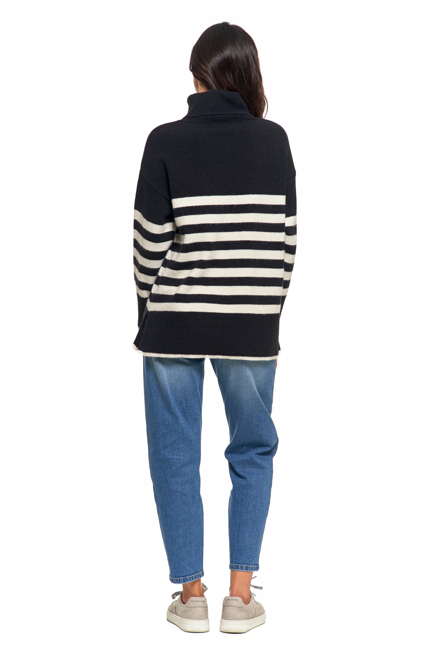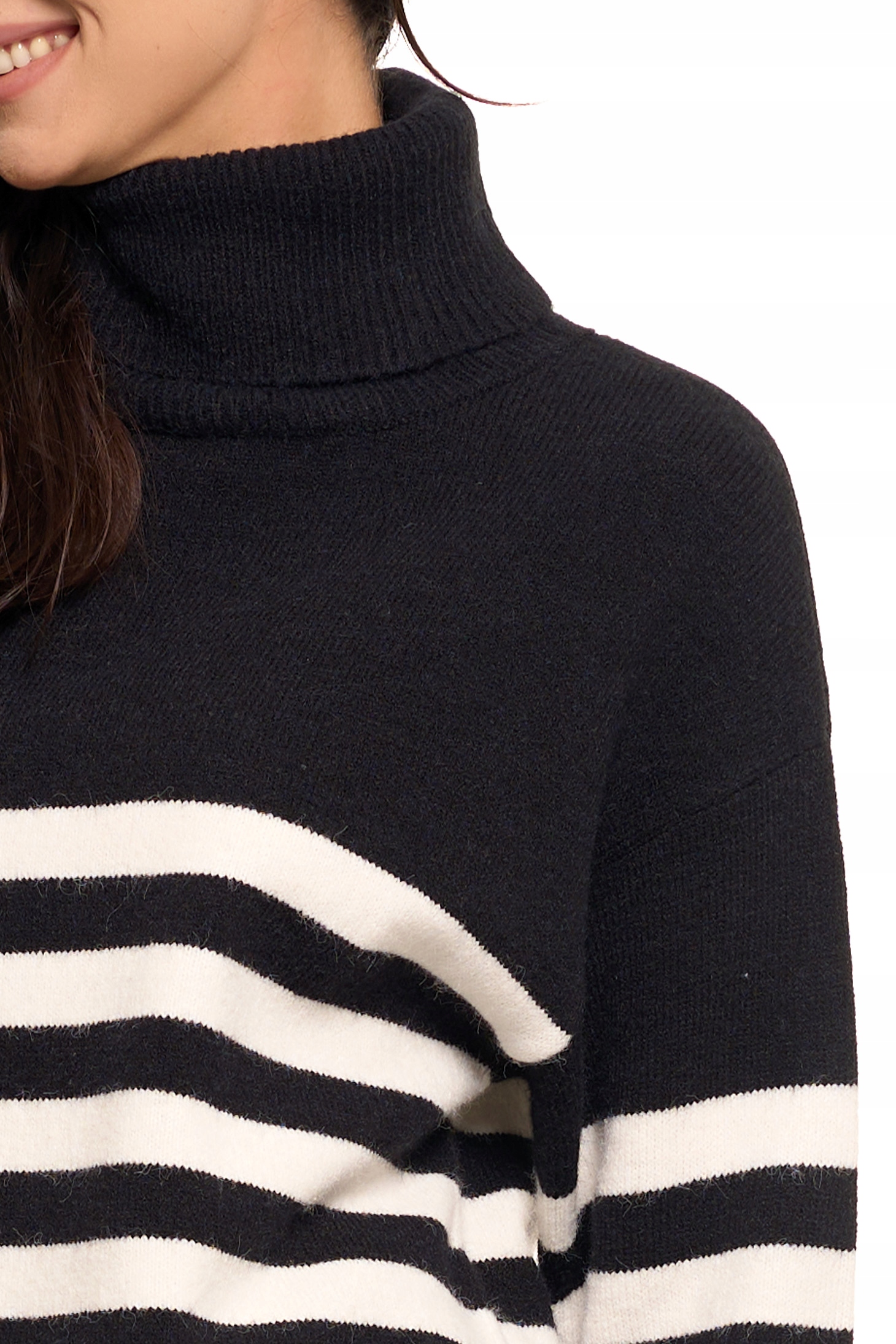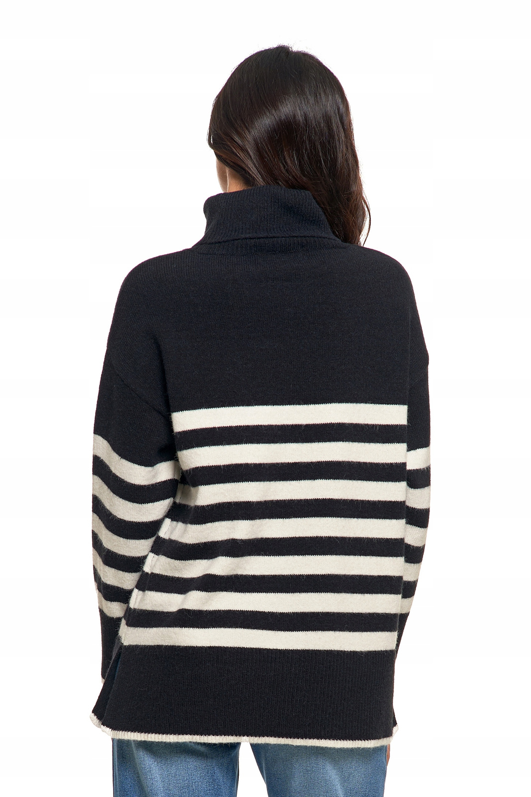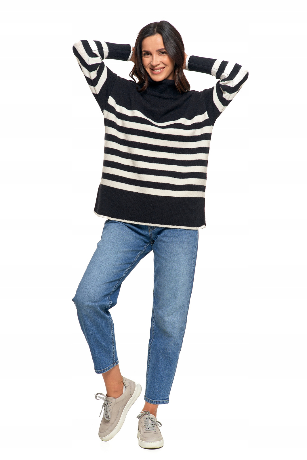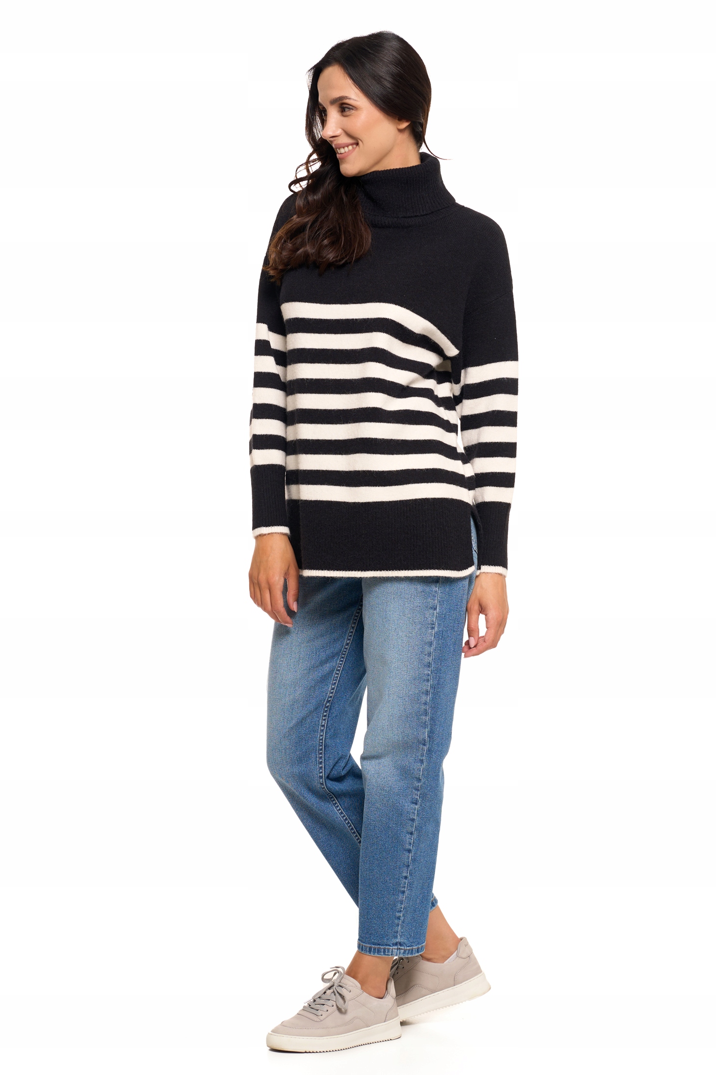 Wykonany z miękkiej dzianiny, sweter charakteryzuje się luźnym krojem, który zapewnia swobodę ruchów i komfort noszenia przez cały dzień. Klasyczny wzór w poziome paski dodaje swetrowi modnego, casualowego charakteru, dzięki czemu świetnie sprawdzi się zarówno w codziennych, jak i bardziej eleganckich stylizacjach. Golf zapewnia dodatkowe ciepło, jednocześnie podkreślając stylowy wygląd. Dłuższy krój swetra sprawia, że doskonale pasuje zarówno do jeansów, jak i legginsów, gwarantując przy tym komfort i modny wygląd.