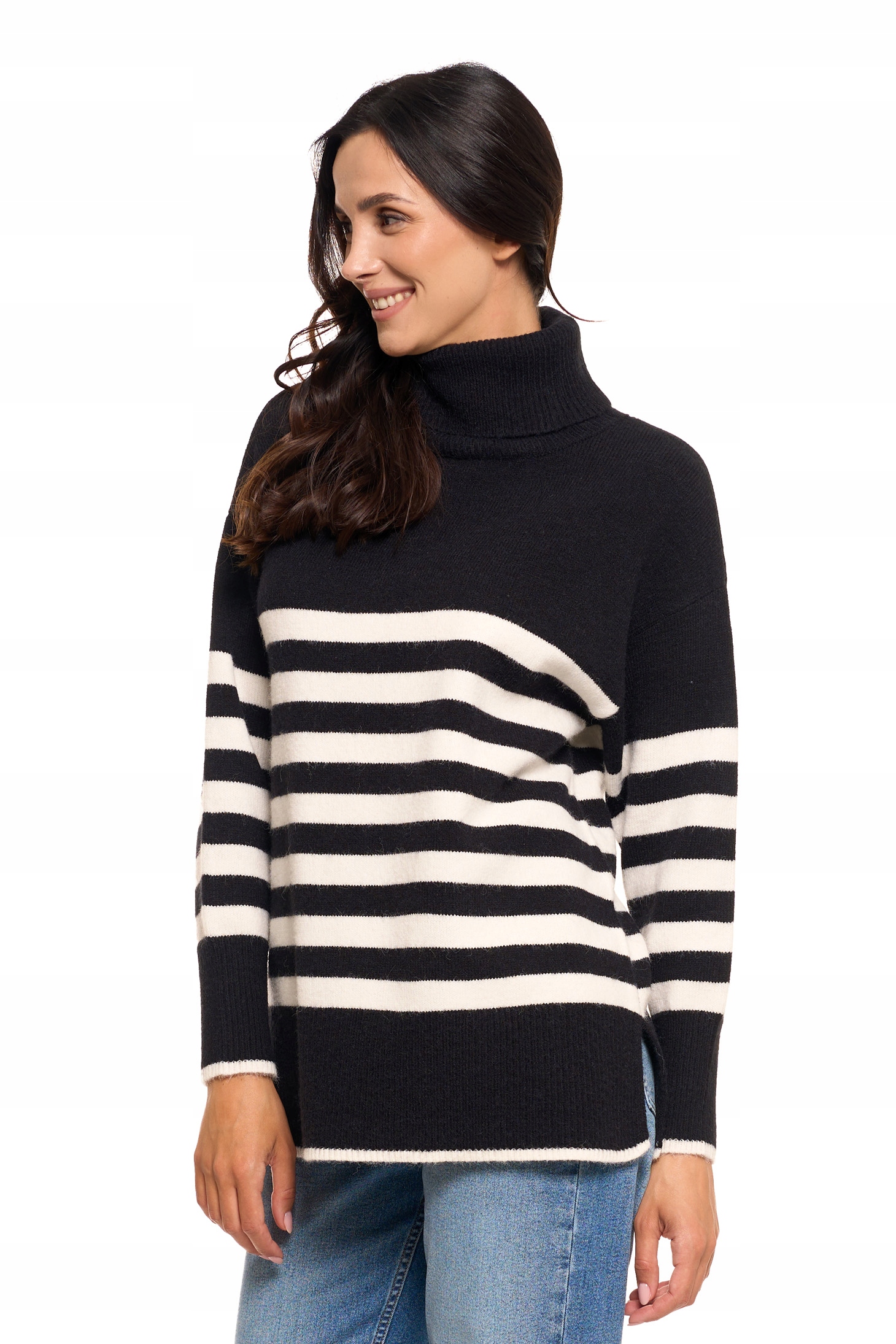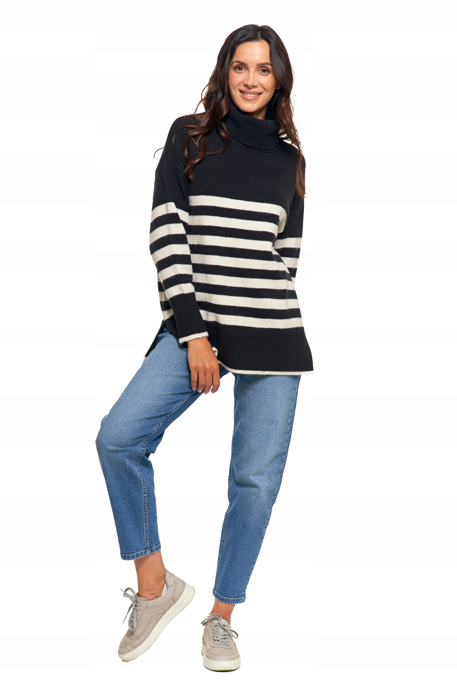 Sweter damski w paski z golfem o luźnym kroju to idealna propozycja na chłodniejsze dni dla kobiet ceniących wygodę i styl.